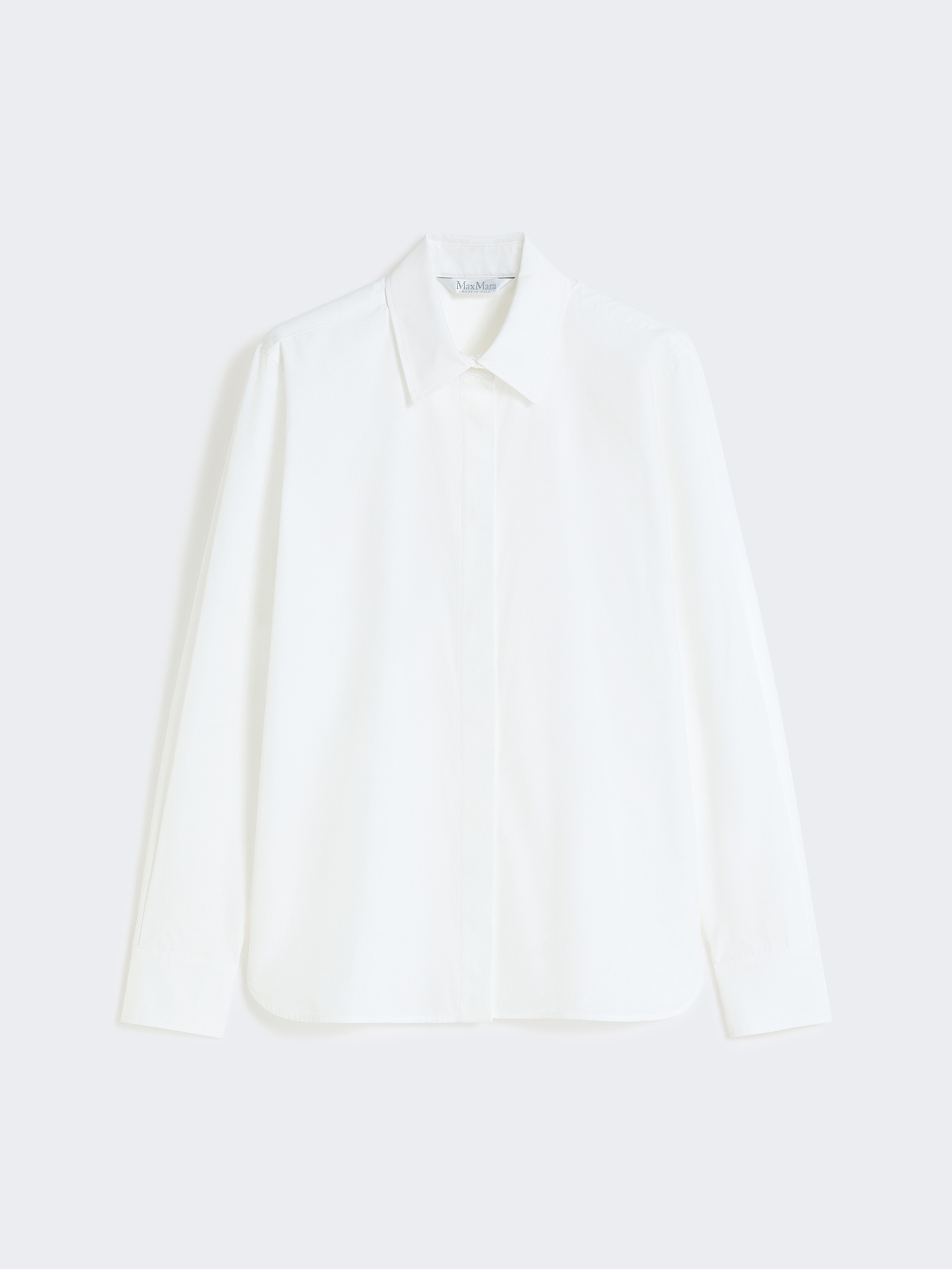 采用棉府绸制成的纯色衬衫,常规版型,插肩袖设计,前襟隐藏式纽扣开合,圆弧形下摆配侧边开衩。