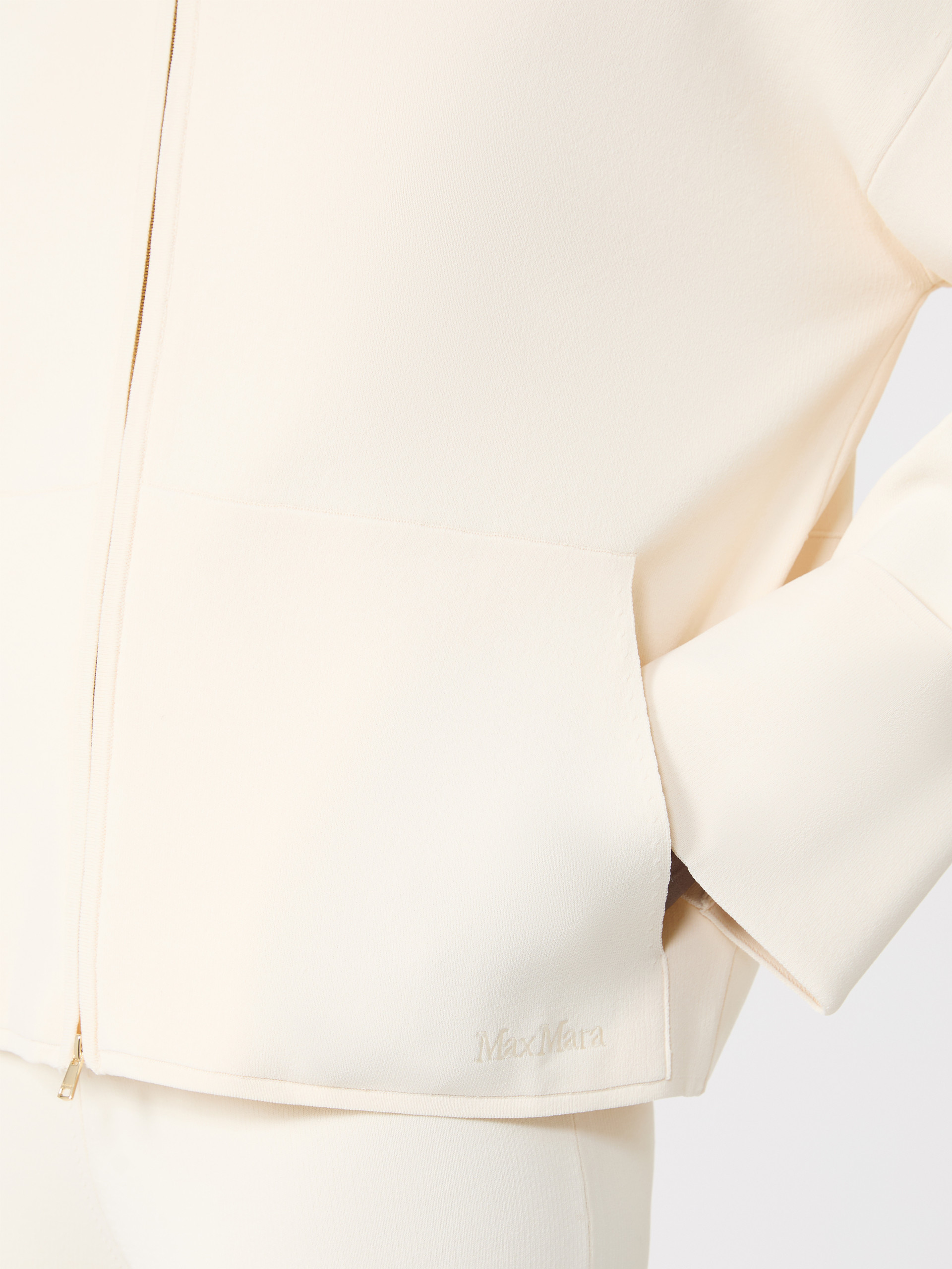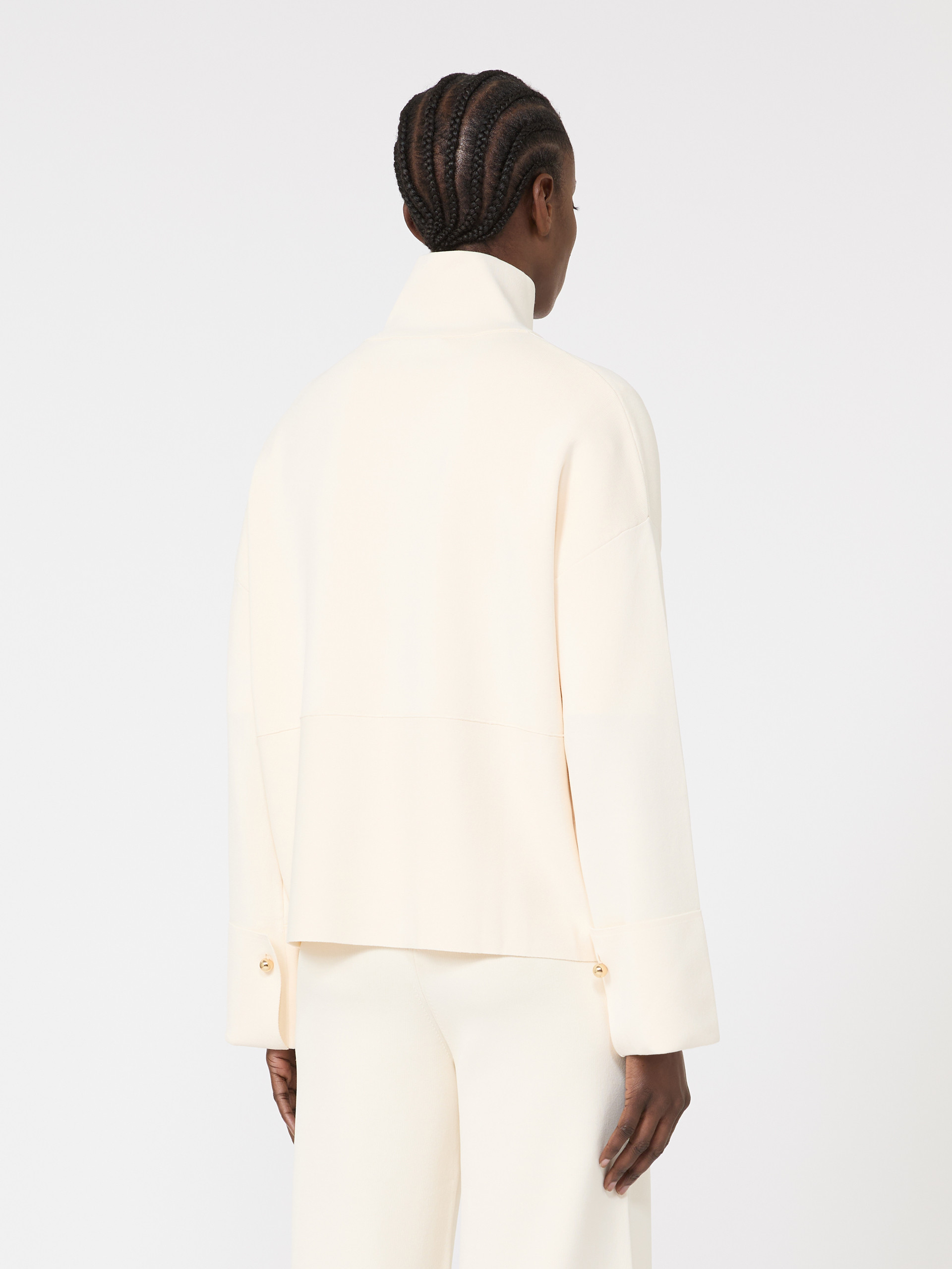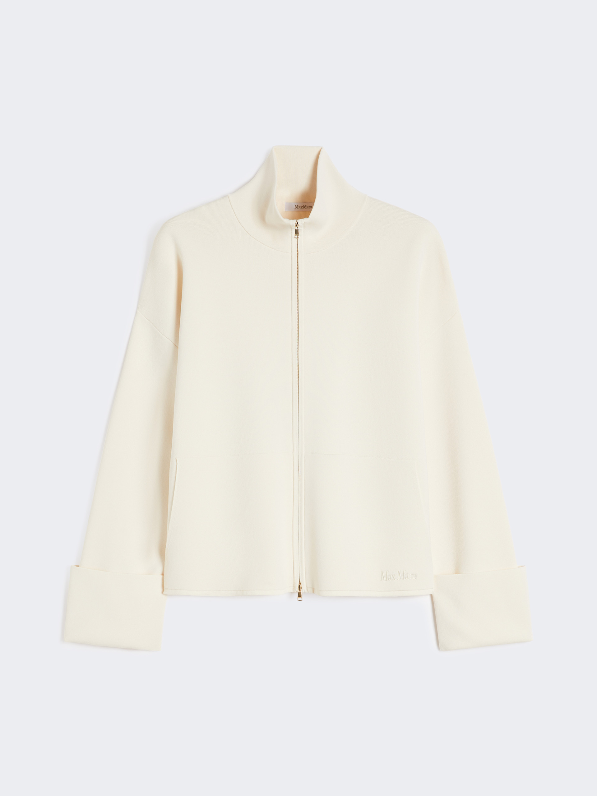 箱型开衫,高领设计,宽大袖口配有金色球状纽扣,宽松版型,后背横向缝线,落肩长袖设计,前襟采用双拉头拉链开合,左侧配贴袋与刺绣品牌标识。