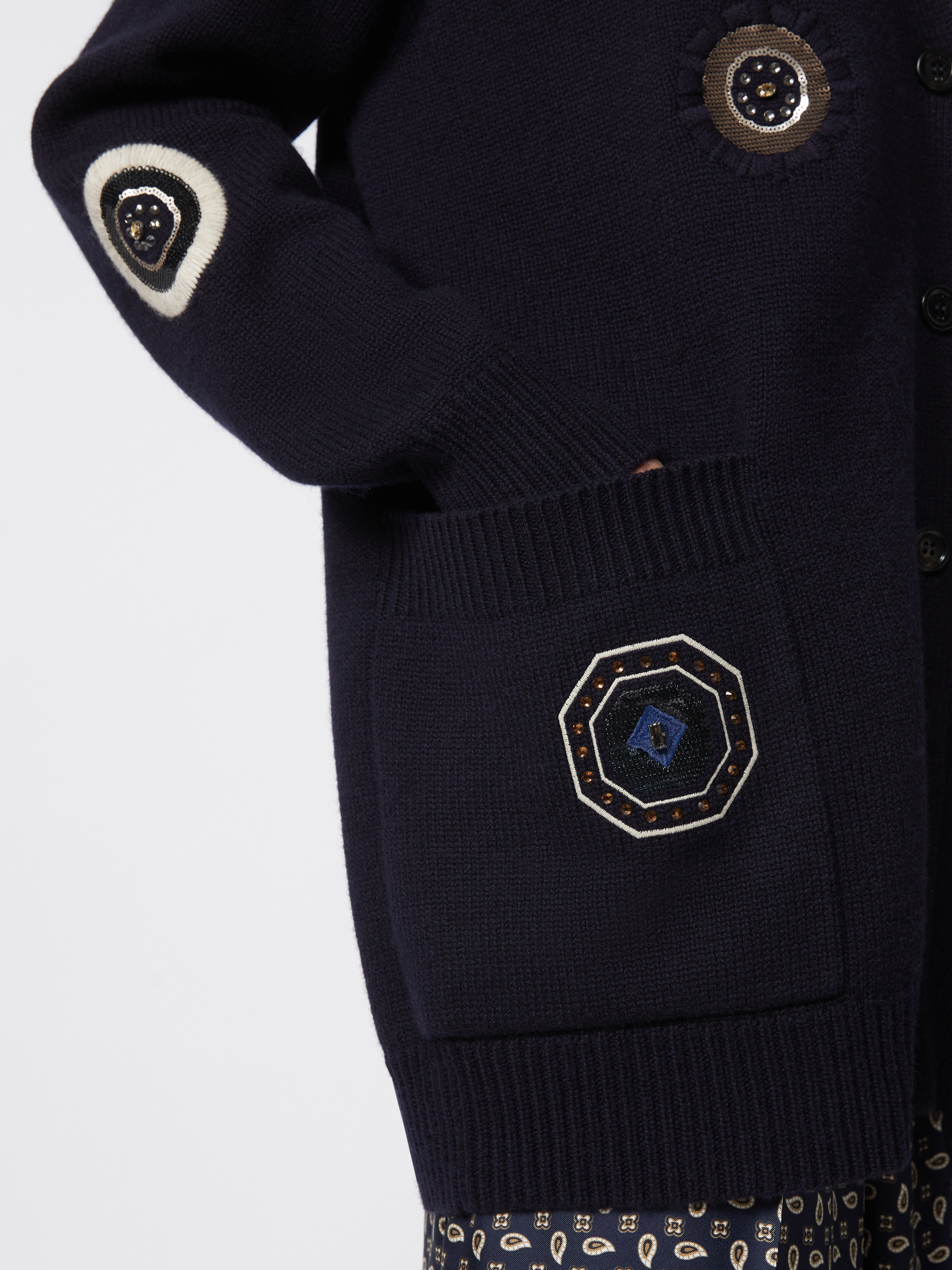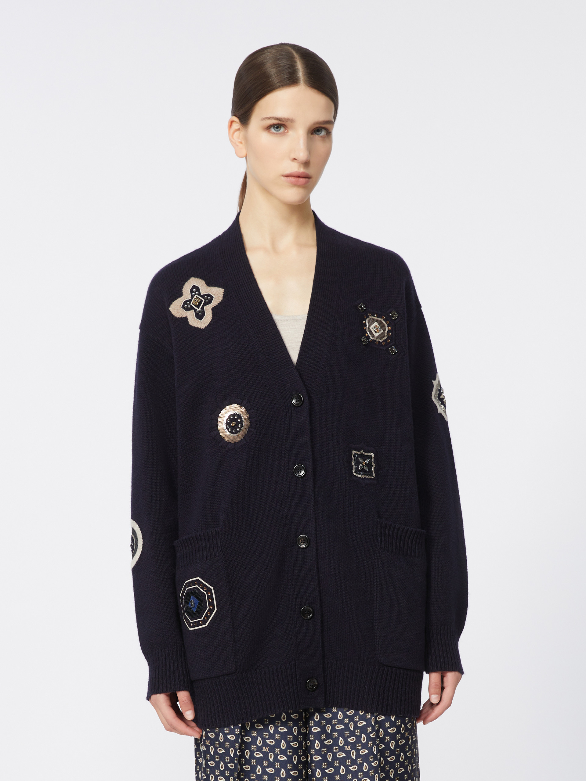 长款开衫外套,饰有丝线和亮片细节,宽松oversize版型,V领设计与低袖笼长袖,天然牛角扣开合%下摆处贴袋设计。