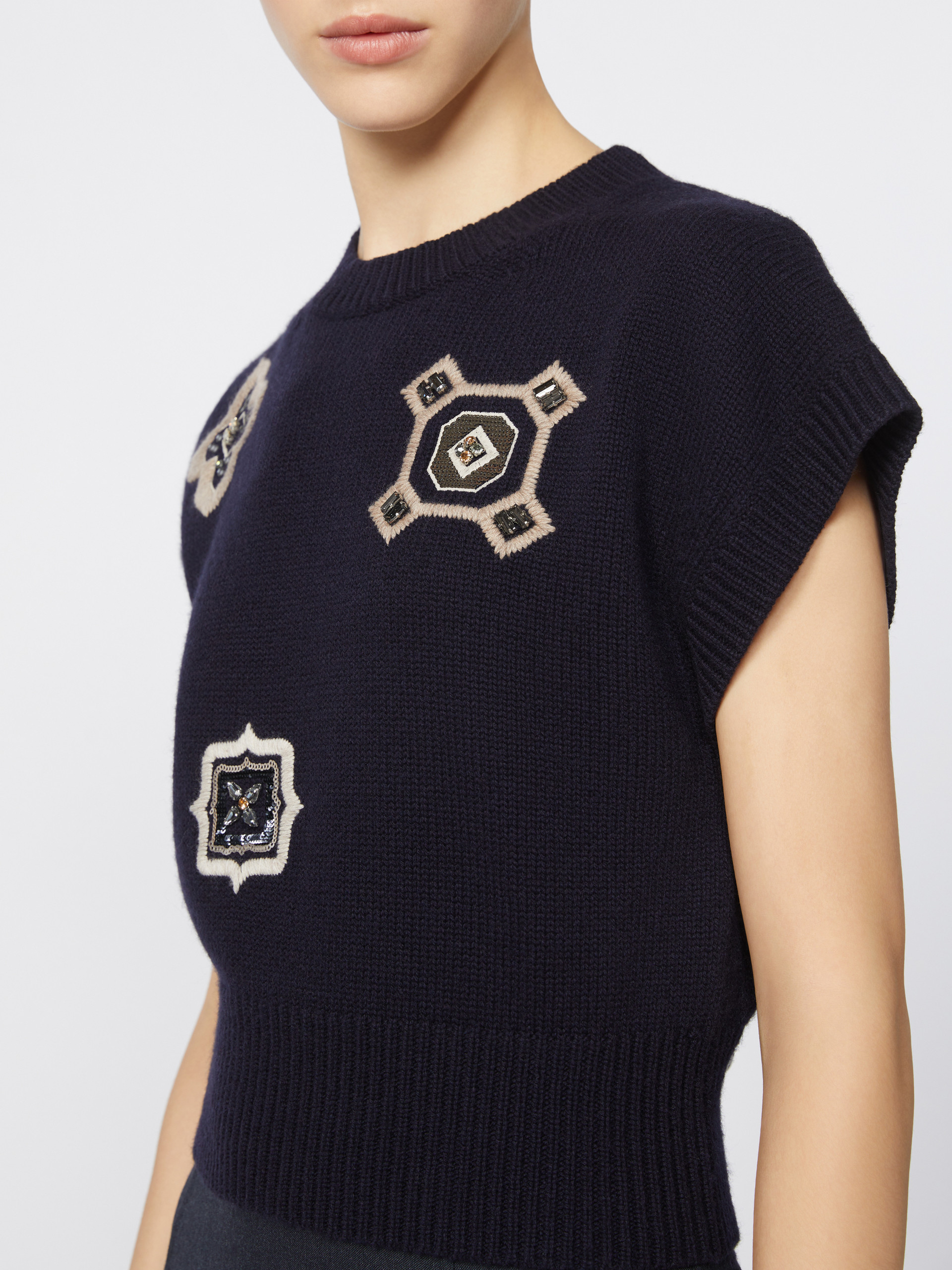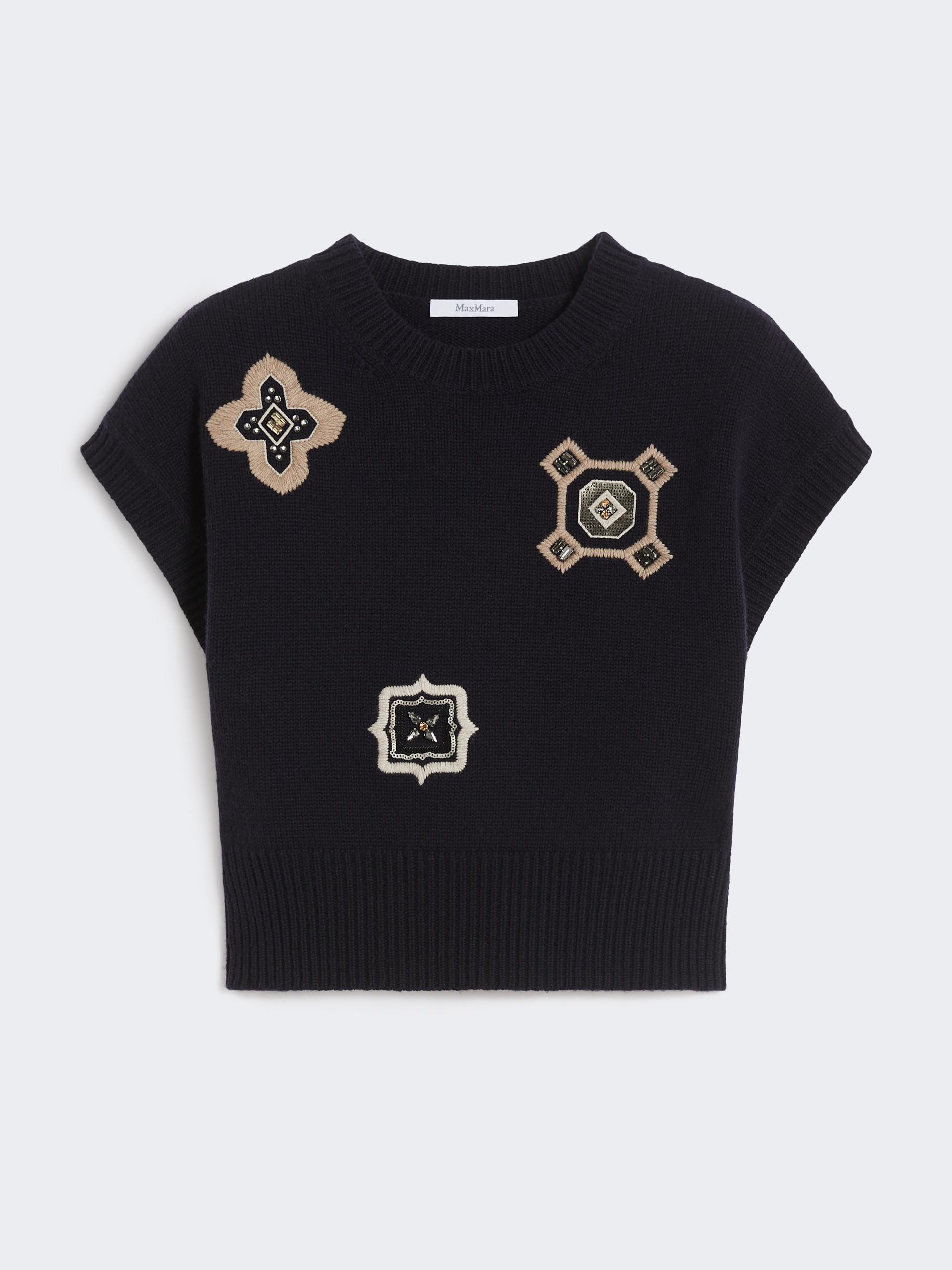 饰有亮片与仿钻装饰细节的短款针织衫,宽松版型,船员式圆领设计,短款和风袖,罗纹针织饰边,直筒下摆。