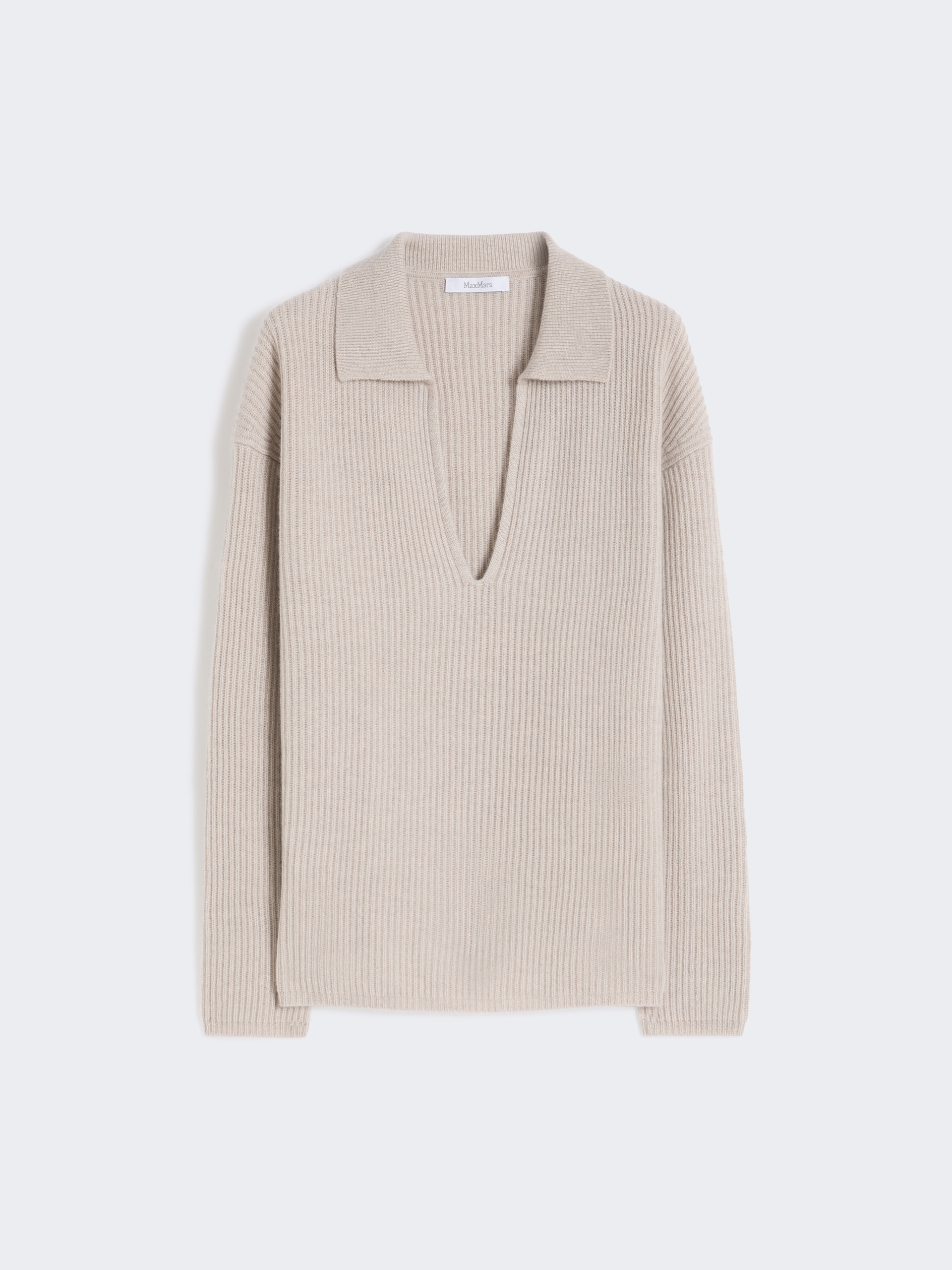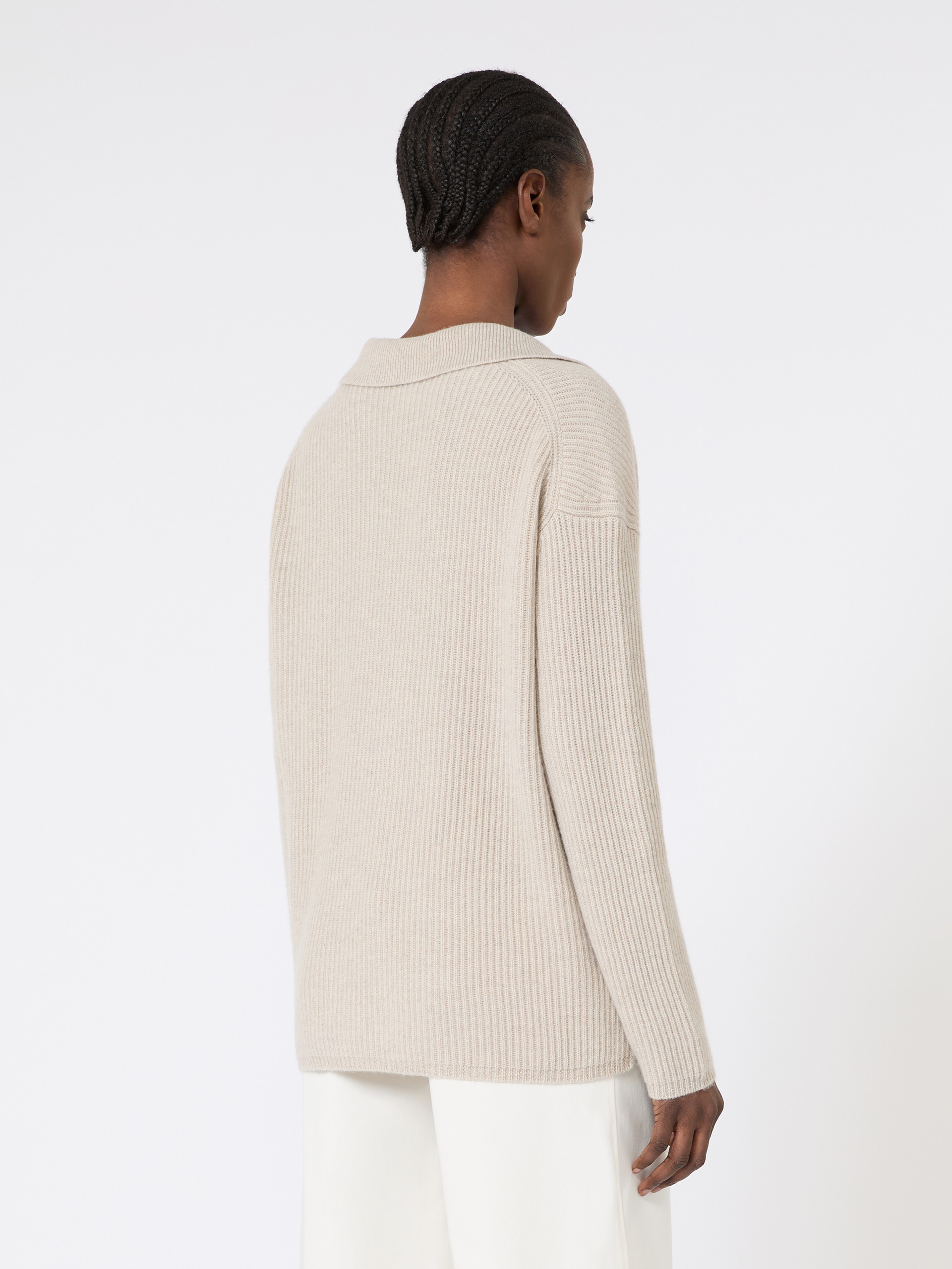 采用山羊绒制成的Polo风格针织衫,前襟开合Polo领设计,落肩长袖设计,直筒下摆。