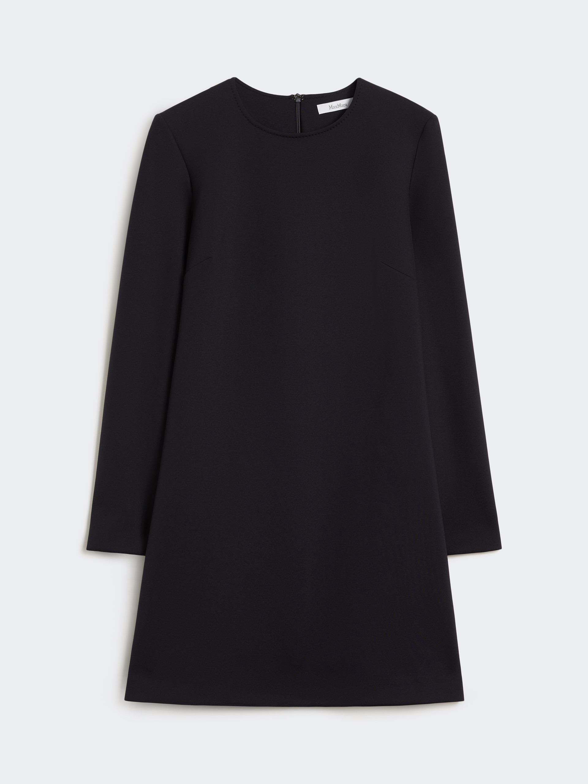 短款连衣裙,修身剪裁,圆领,长插肩袖,背部隐形拉链,无内衬设计。