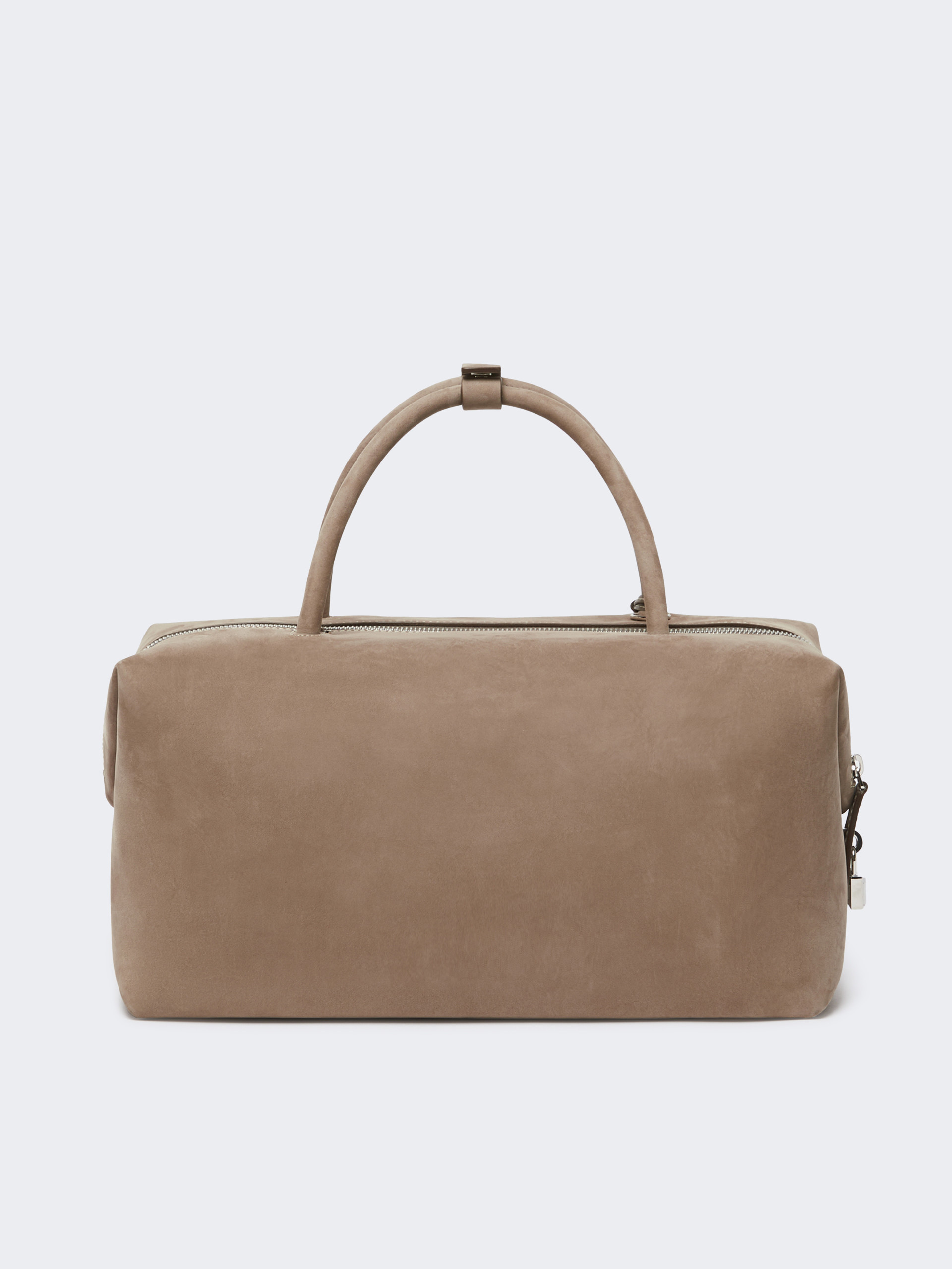大号波士顿包,M形折叠侧边,手柄则采用按扣固定手环式设计。包底饰有皮革细节,正面压印 Max Mara 品牌标识,顶部拉链开合,配可拆卸皮革肩带。