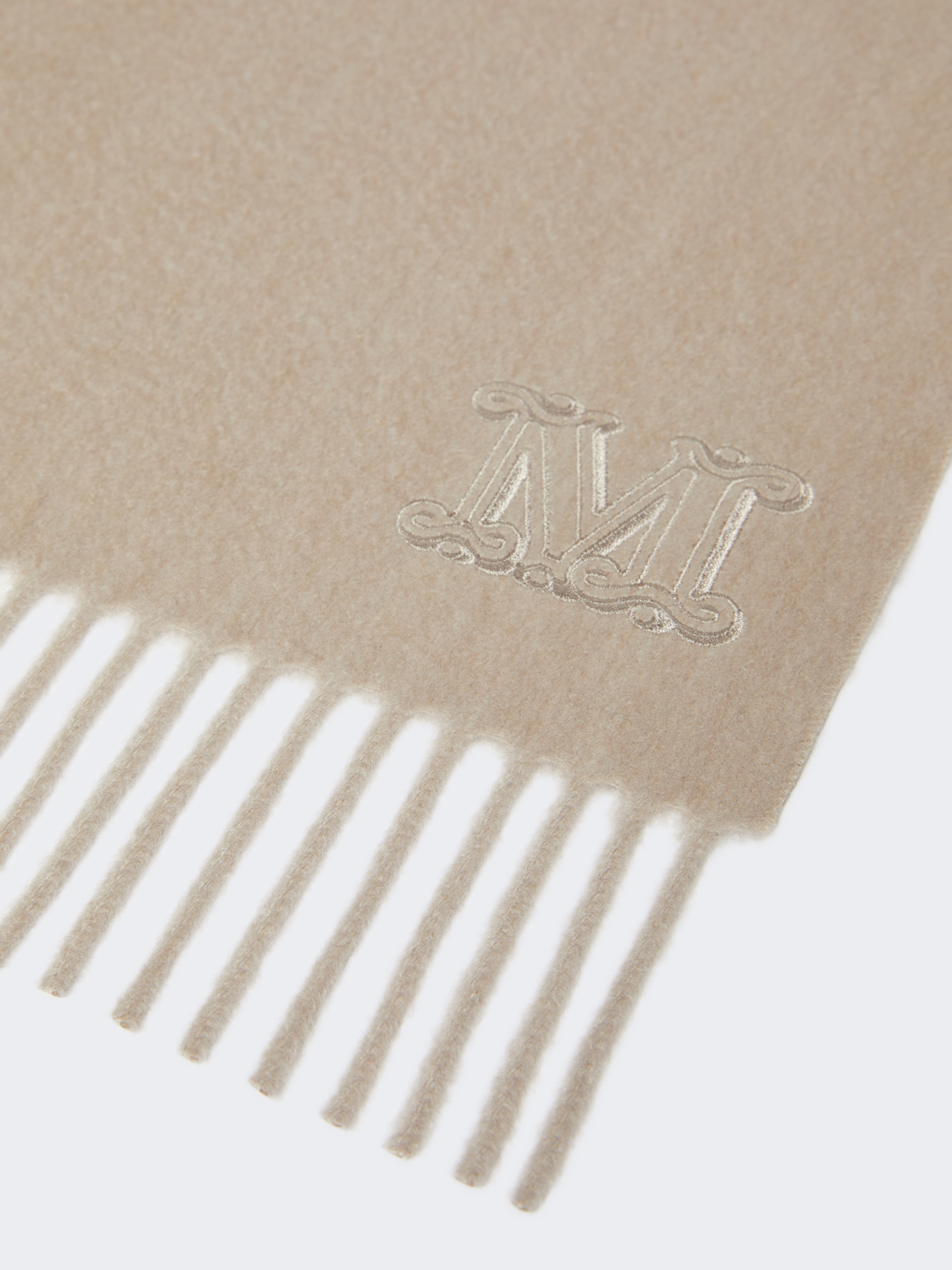 饰有M字母的优雅披肩,采用山羊绒制成,短边饰有流苏,尺寸:190x28厘米。