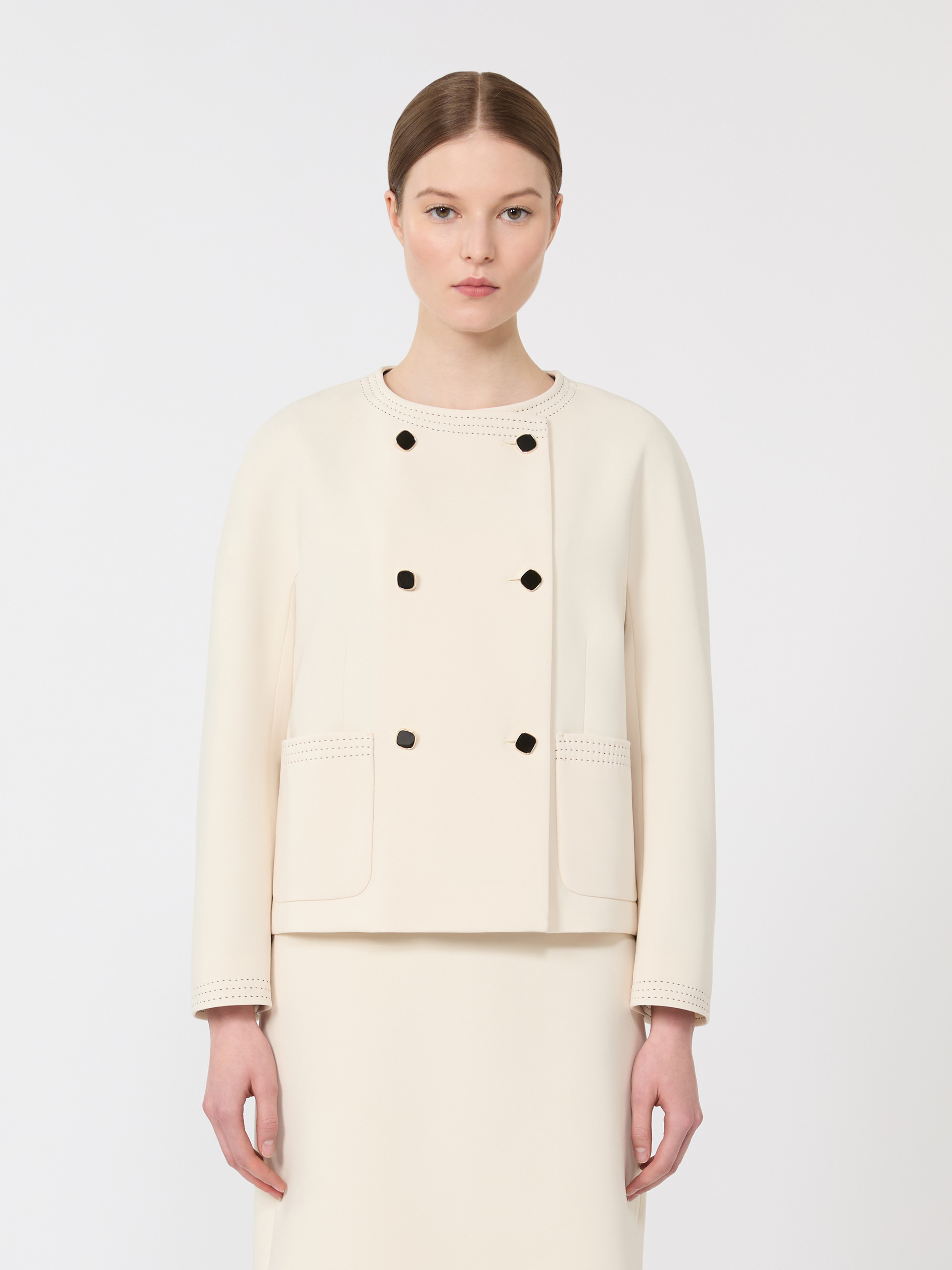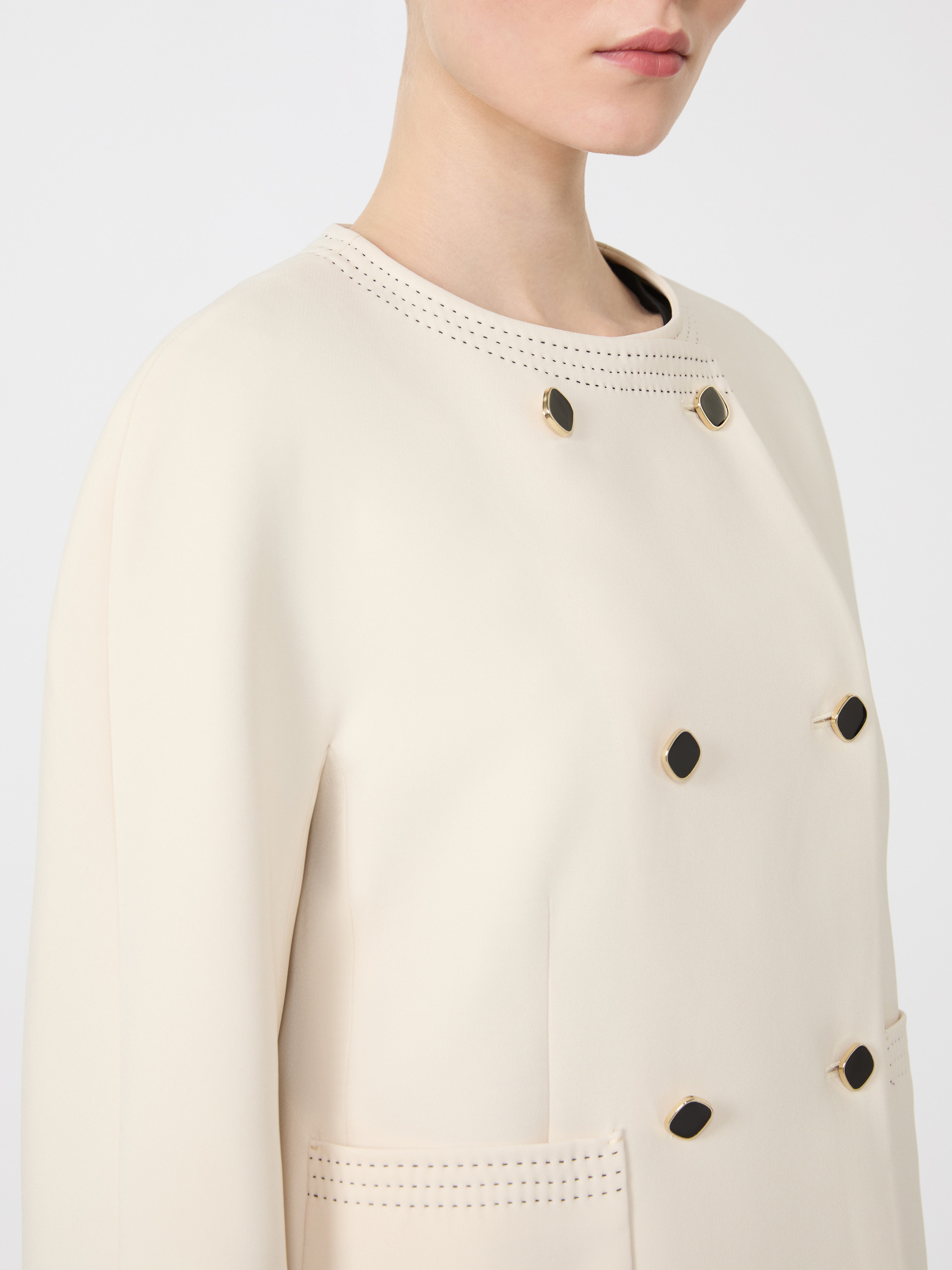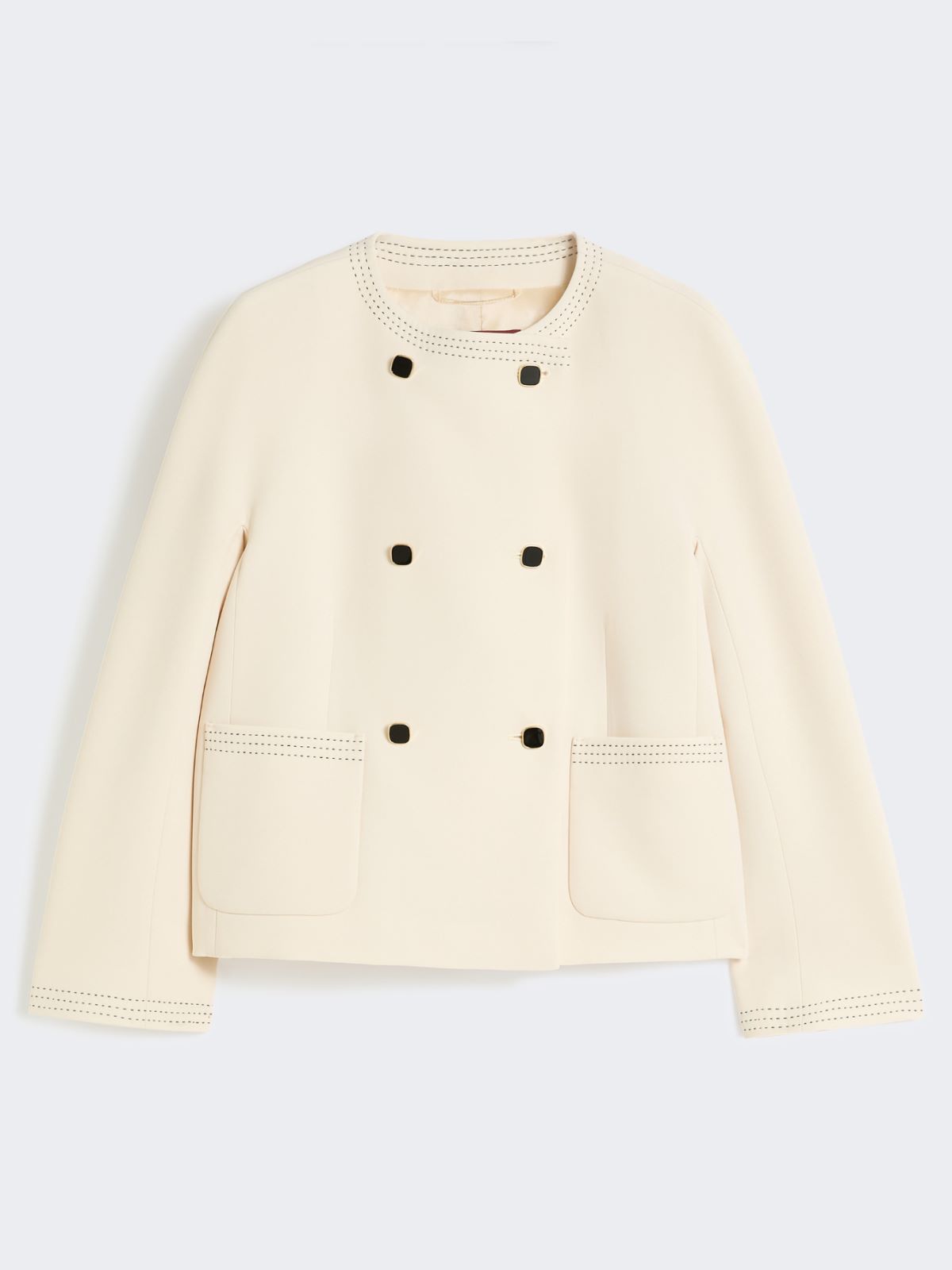 短款双排扣夹克外套,配金属珠饰纽扣。箱型剪裁配圆领设计,长款和服袖,前襟六粒明扣闭合,饰有贴袋,全衬里设计。