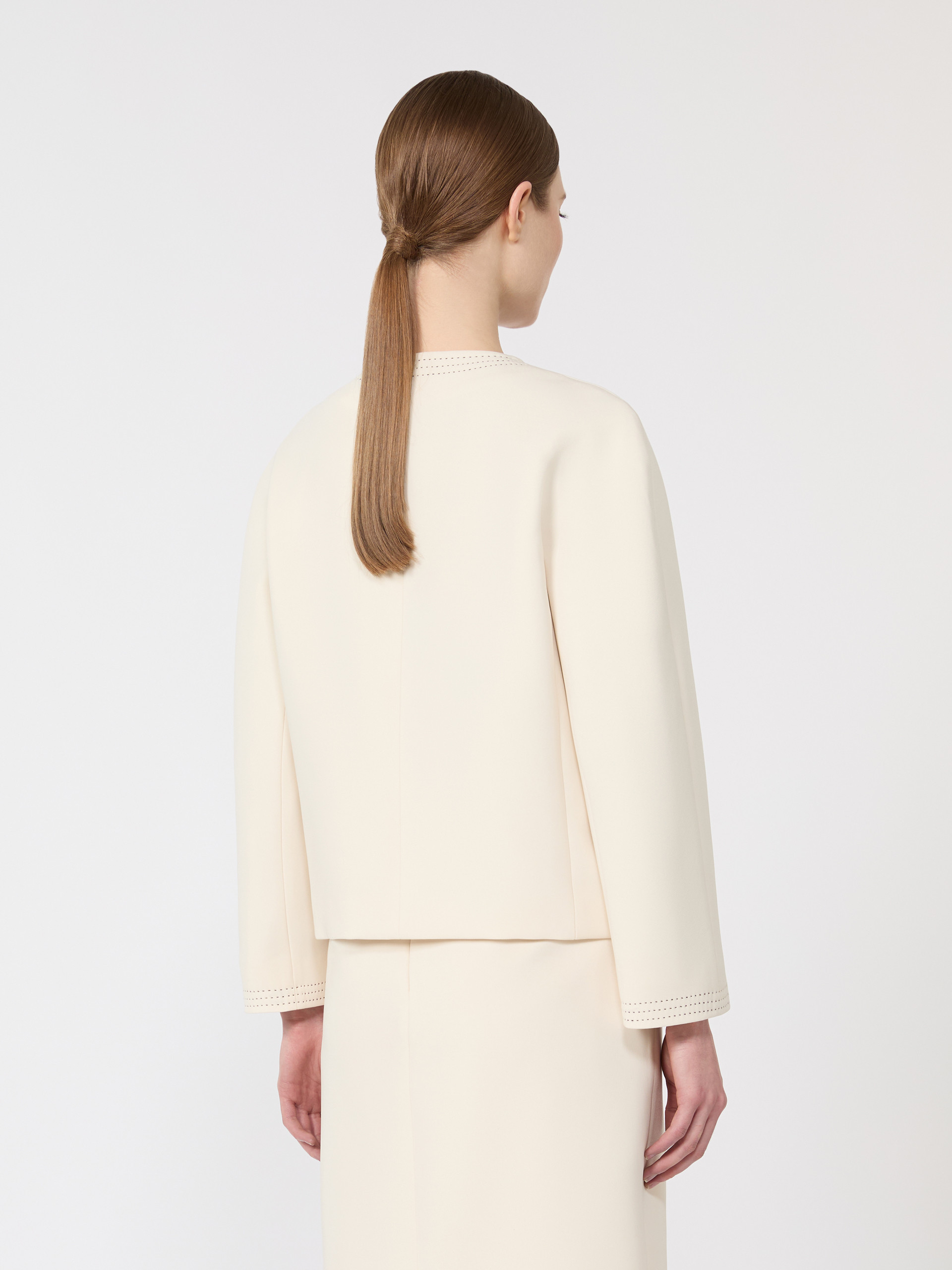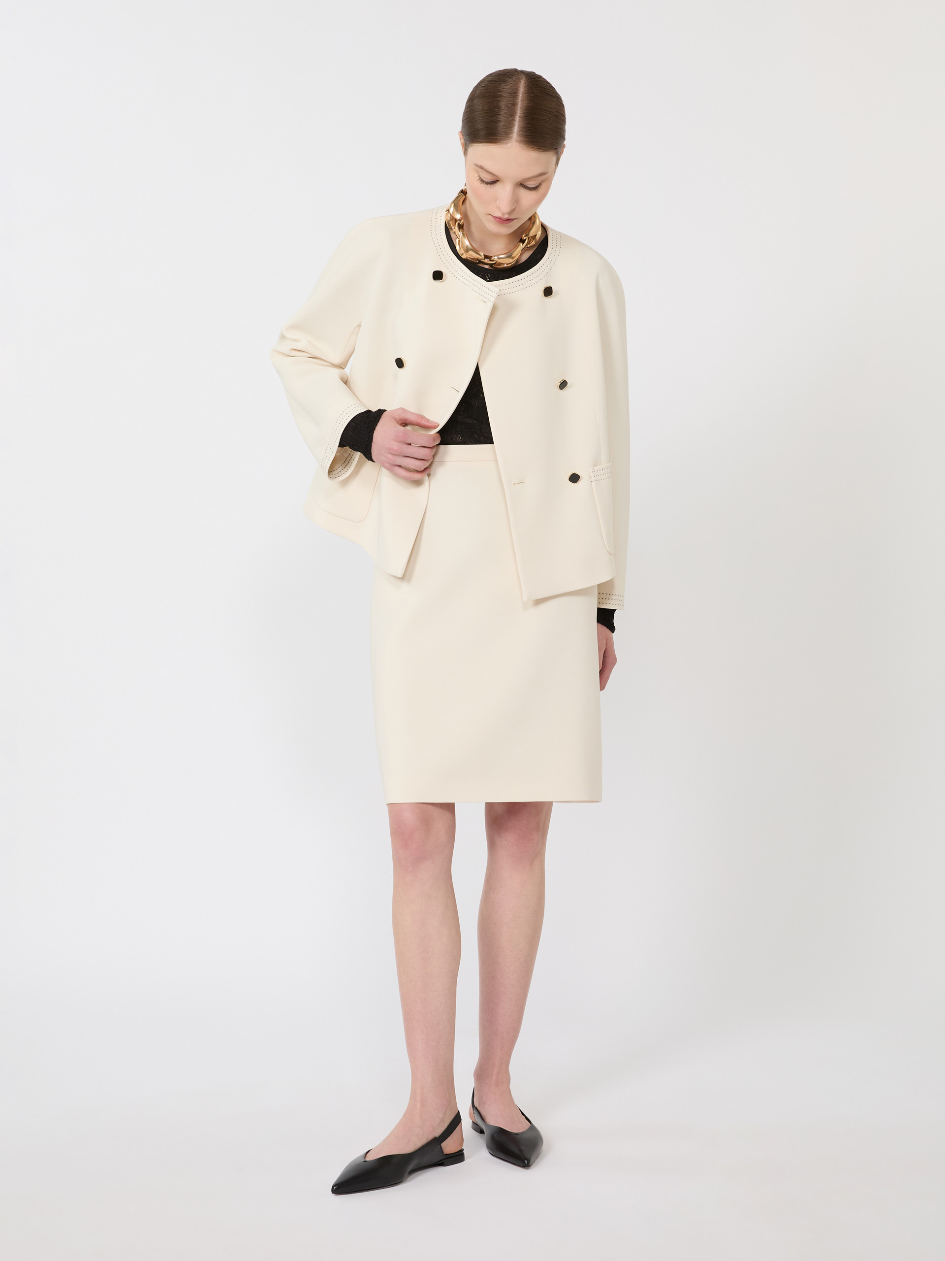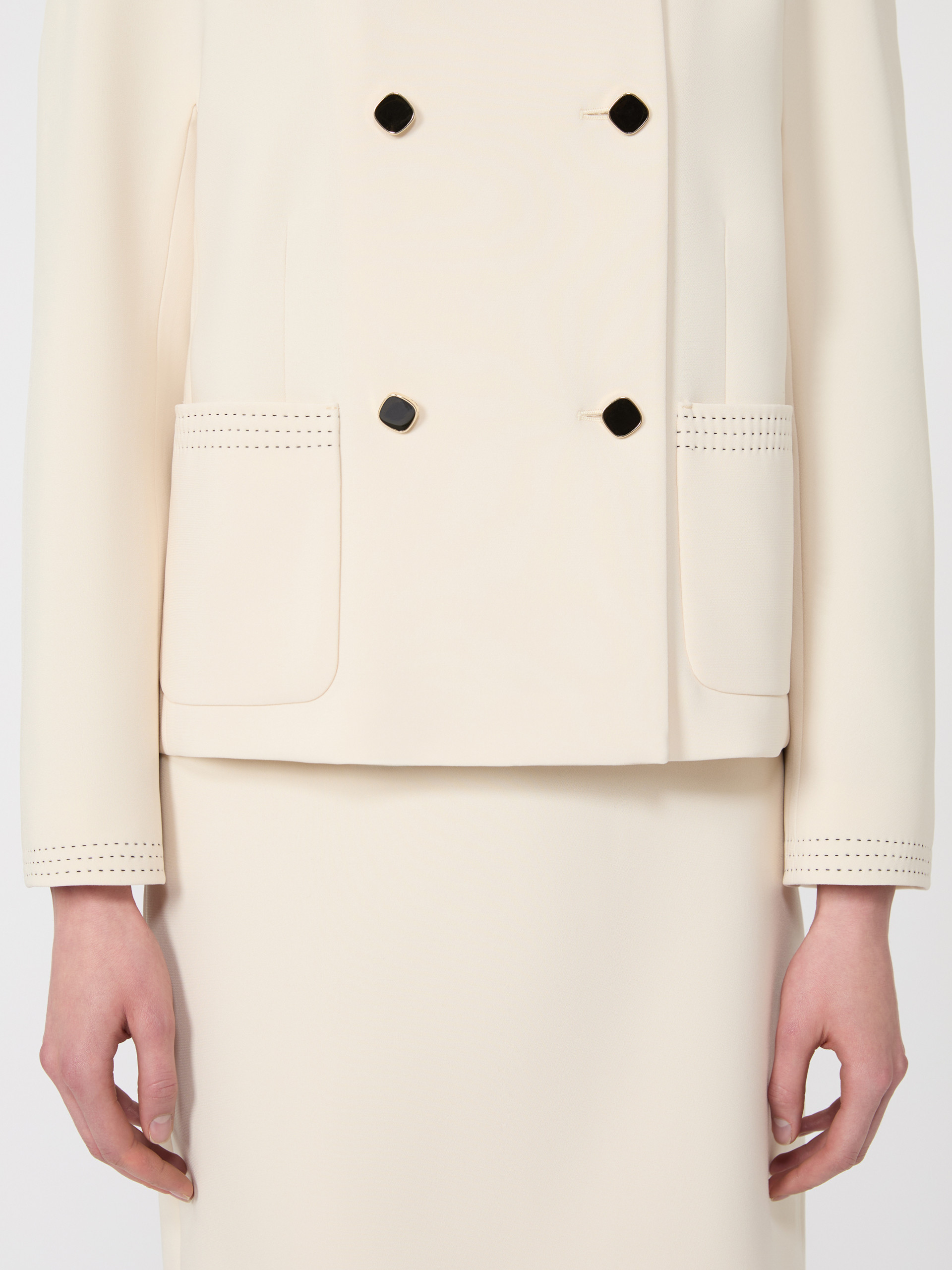 短款双排扣夹克外套,配金属珠饰纽扣。箱型剪裁配圆领设计,长款和服袖,前襟六粒明扣闭合,饰有贴袋,全衬里设计。