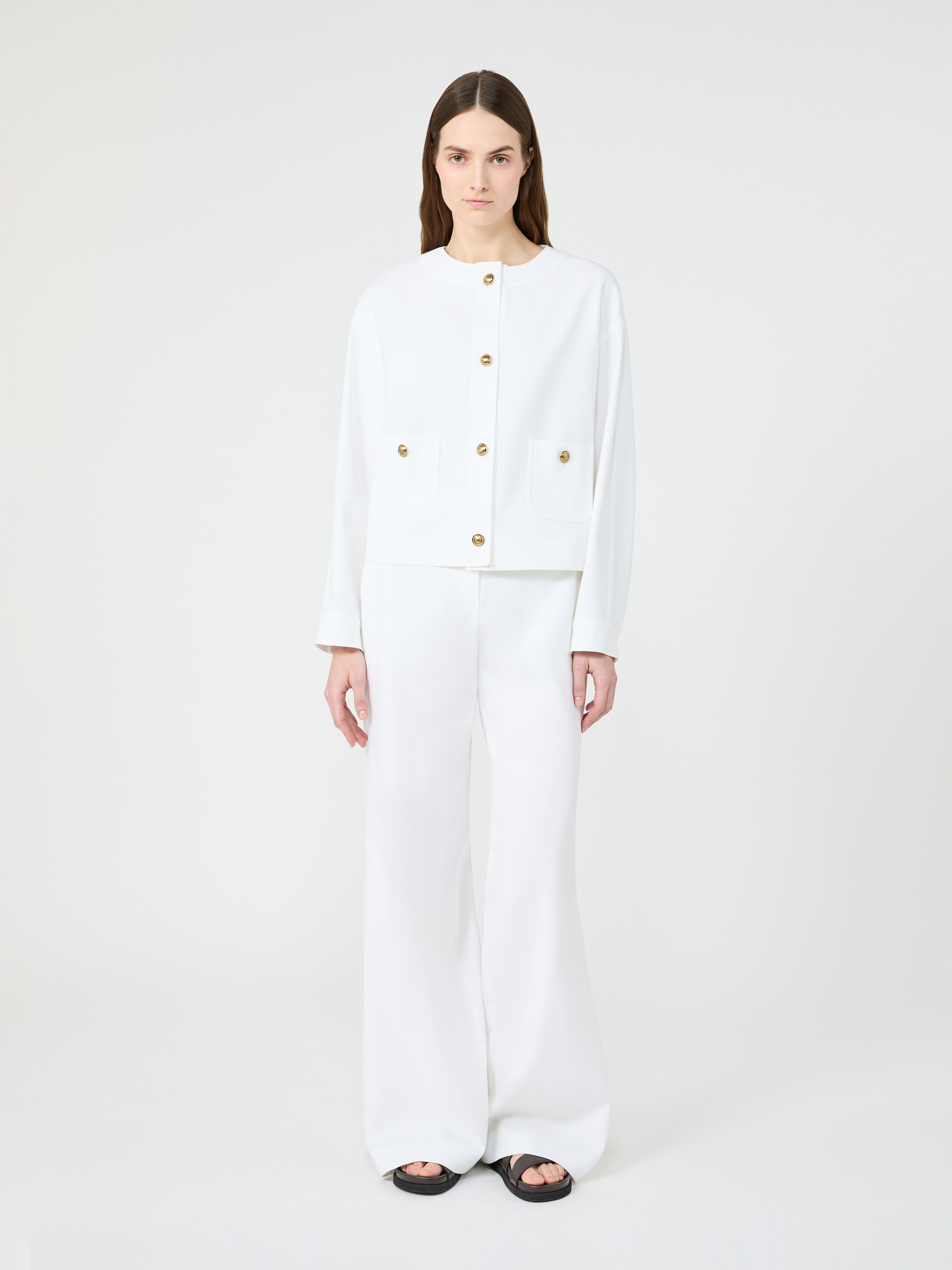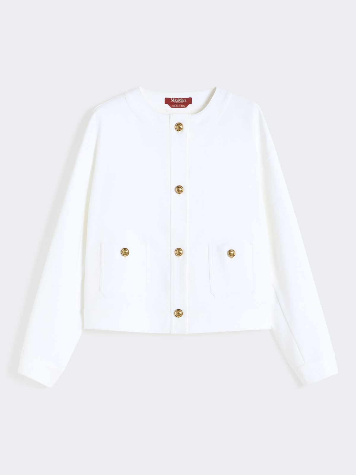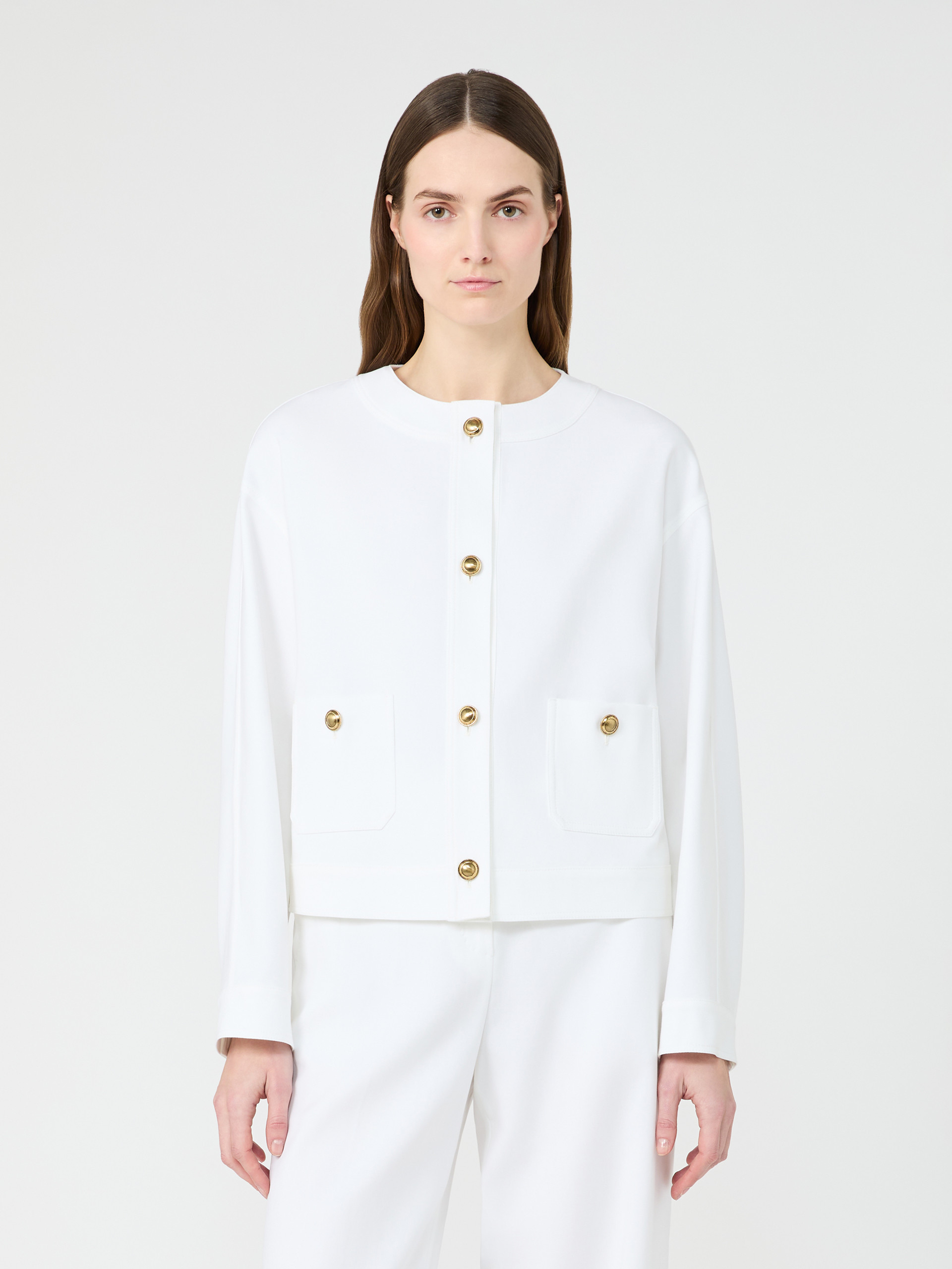 Feminine jacket featuring patch pockets on the front with decorative button detail. - Jacket in washed double pure cotton crêpe fabric - Boxy fit - Crew-neck - Drop-shoulder long sleeves - Visible bejewelled button fastening on the front - Embellished with all-over double topstitching detail