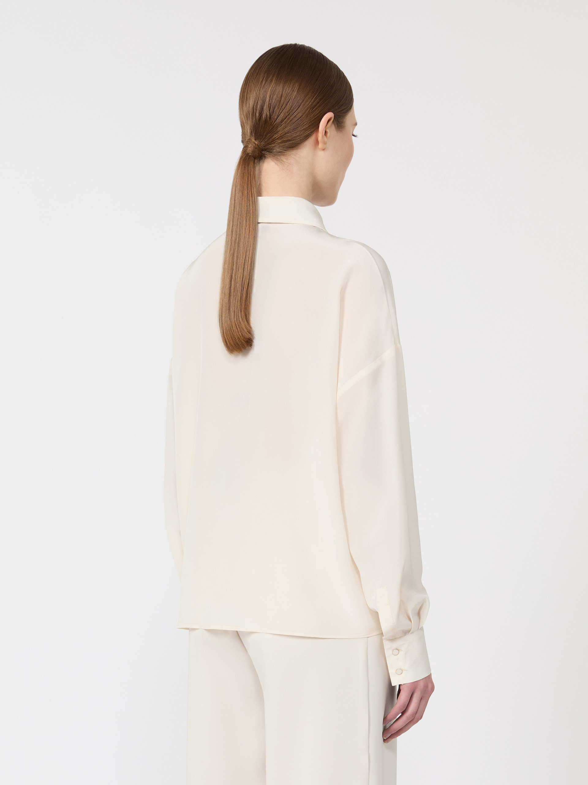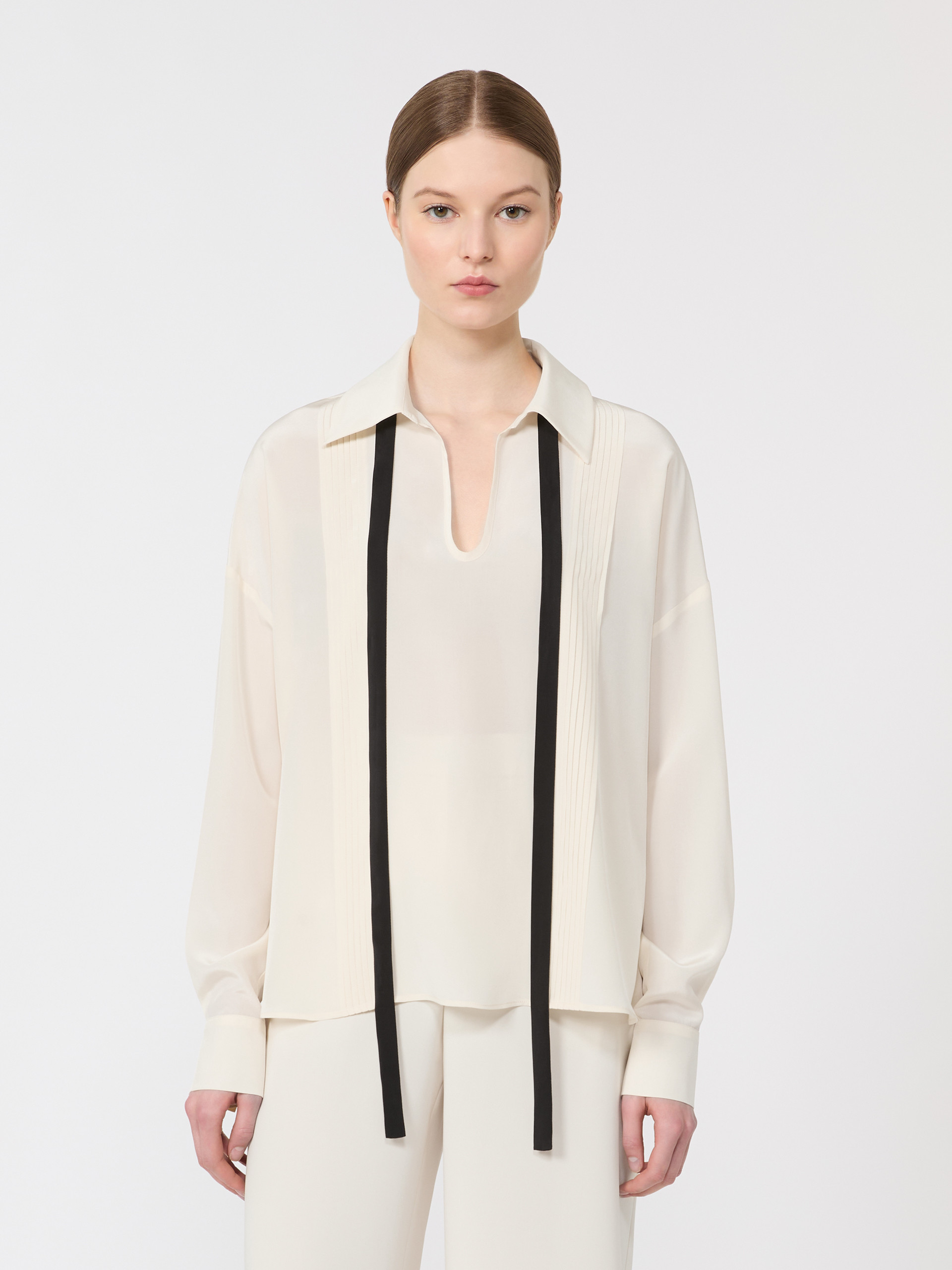 雅致蝴蝶结真丝衬衫,采用100%桑蚕丝面料,流畅垂感版型,平直下摆剪裁,开放式深V领口,低笼长袖设计,袖口配双珐琅金属扣。