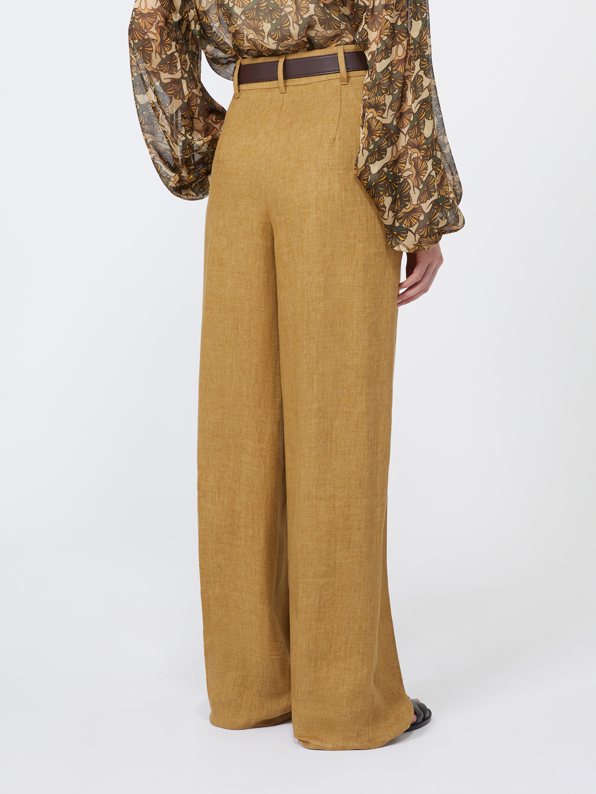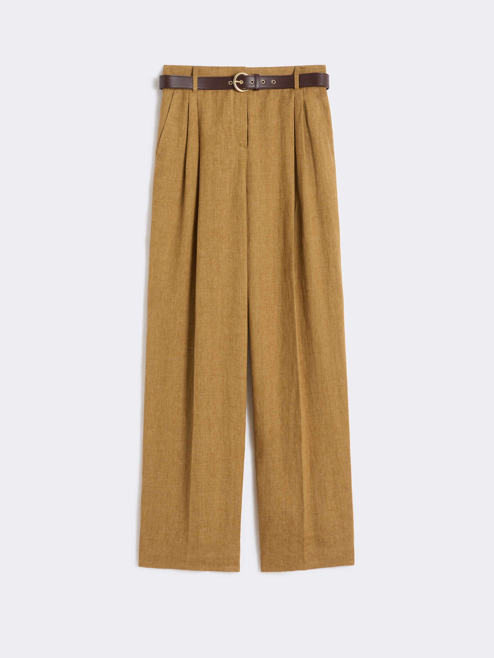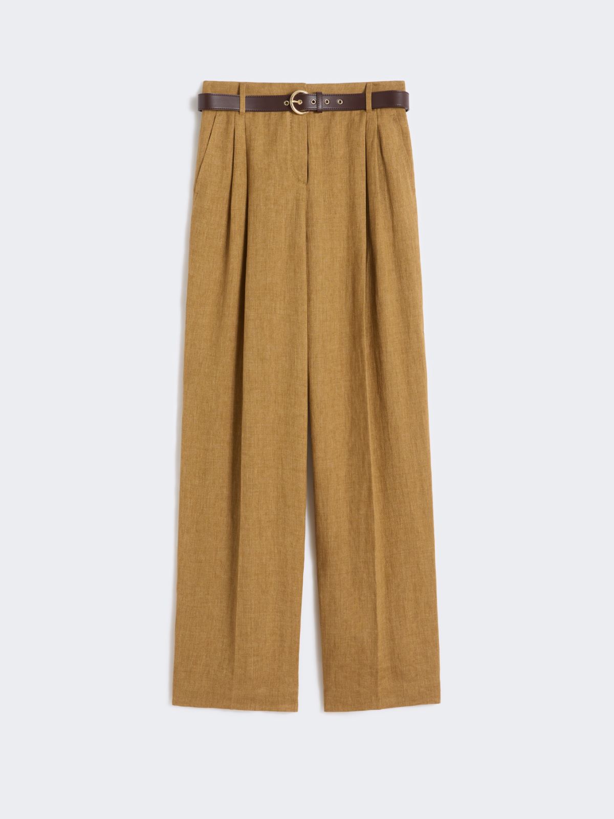 采用亚麻面料制成的阔腿长裤。阔腿裤型,高腰设计,门襟隐藏式拉链和钩扣闭合,侧边斜插袋,饰有压褶细节,配有同系列腰带。