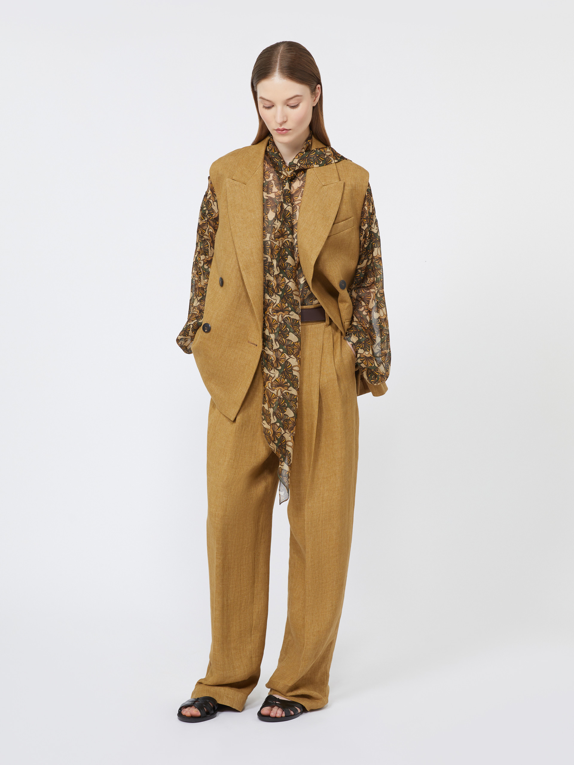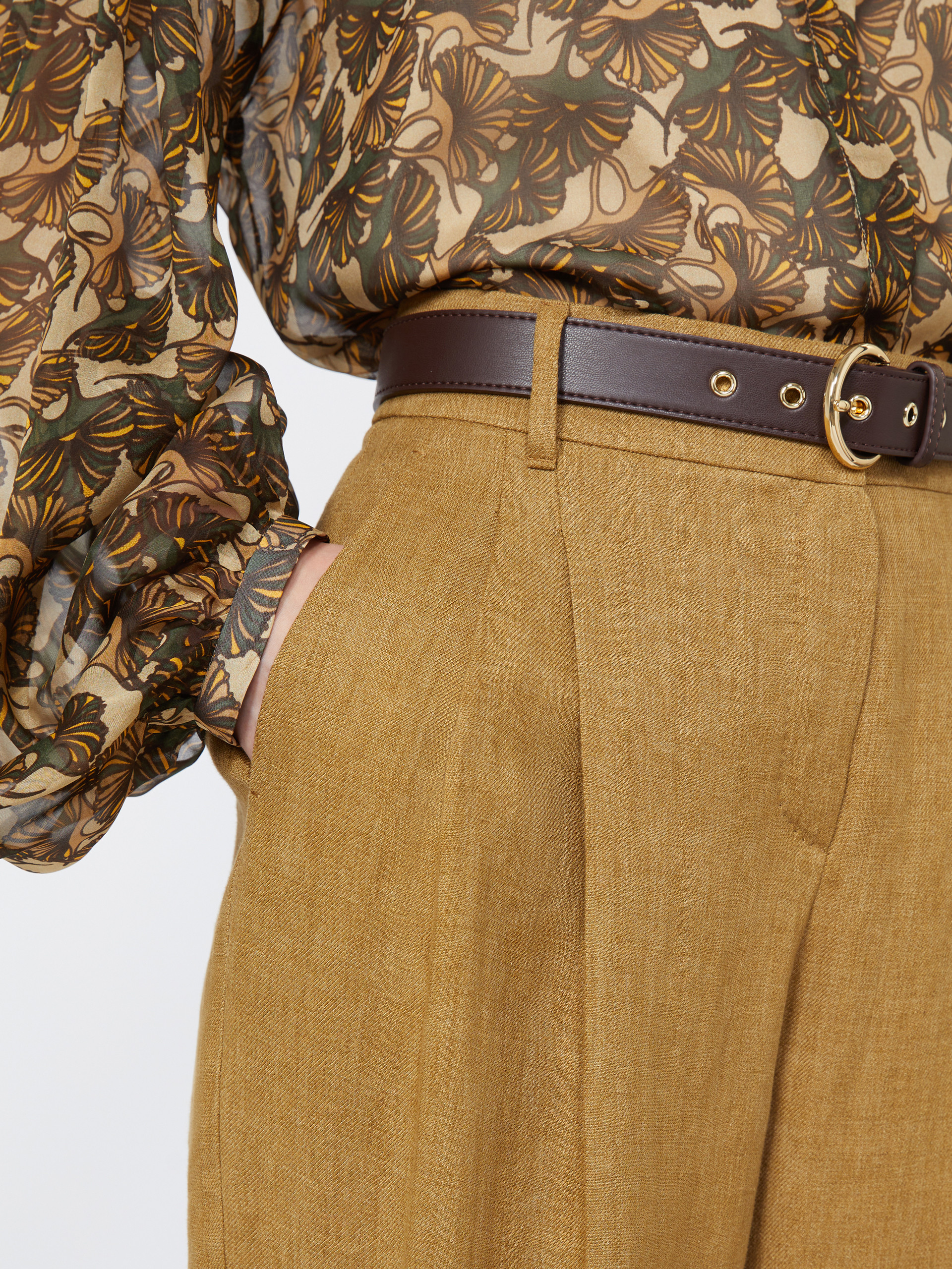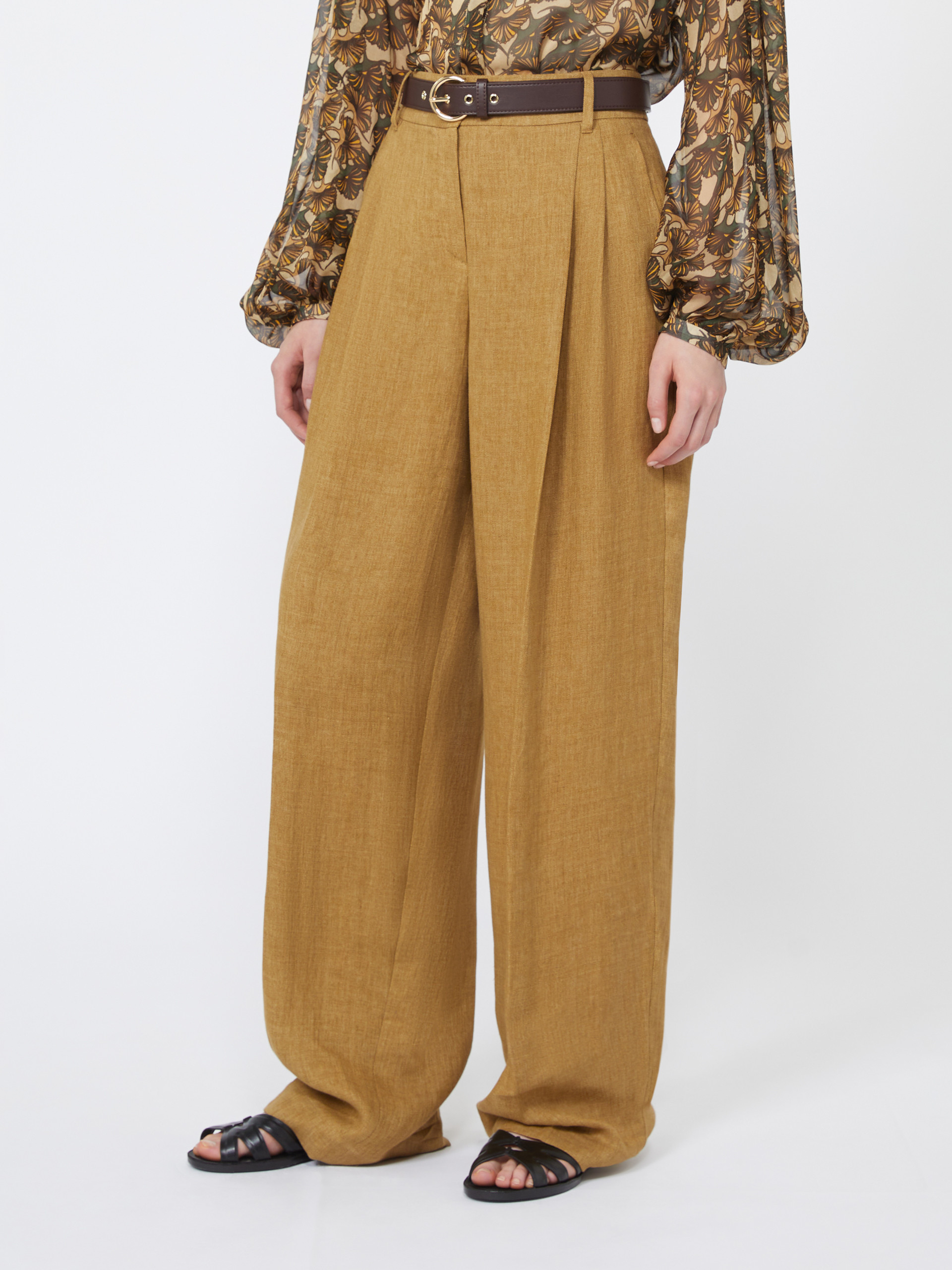 采用亚麻面料制成的阔腿长裤。阔腿裤型,高腰设计,门襟隐藏式拉链和钩扣闭合,侧边斜插袋,饰有压褶细节,配有同系列腰带。
