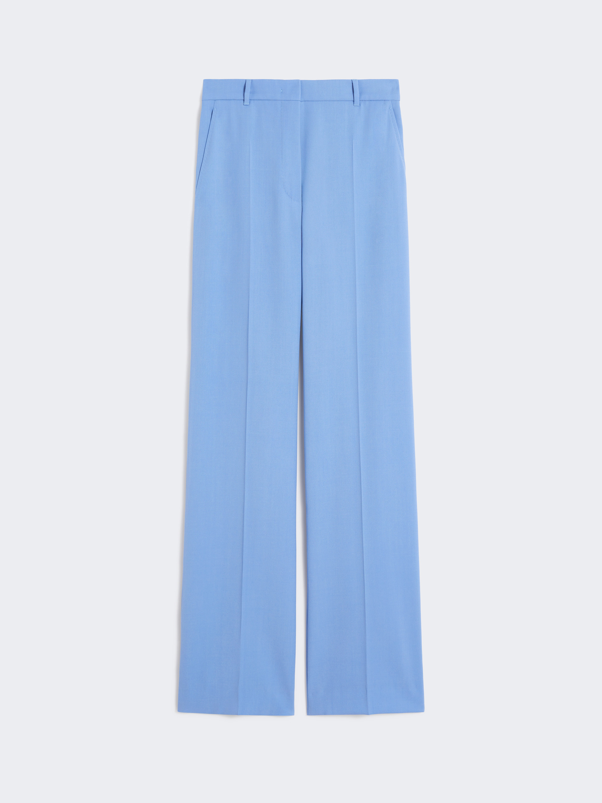 采用绵羊毛面料制成的直筒裤。直筒版型,斜插侧袋,压褶细节。