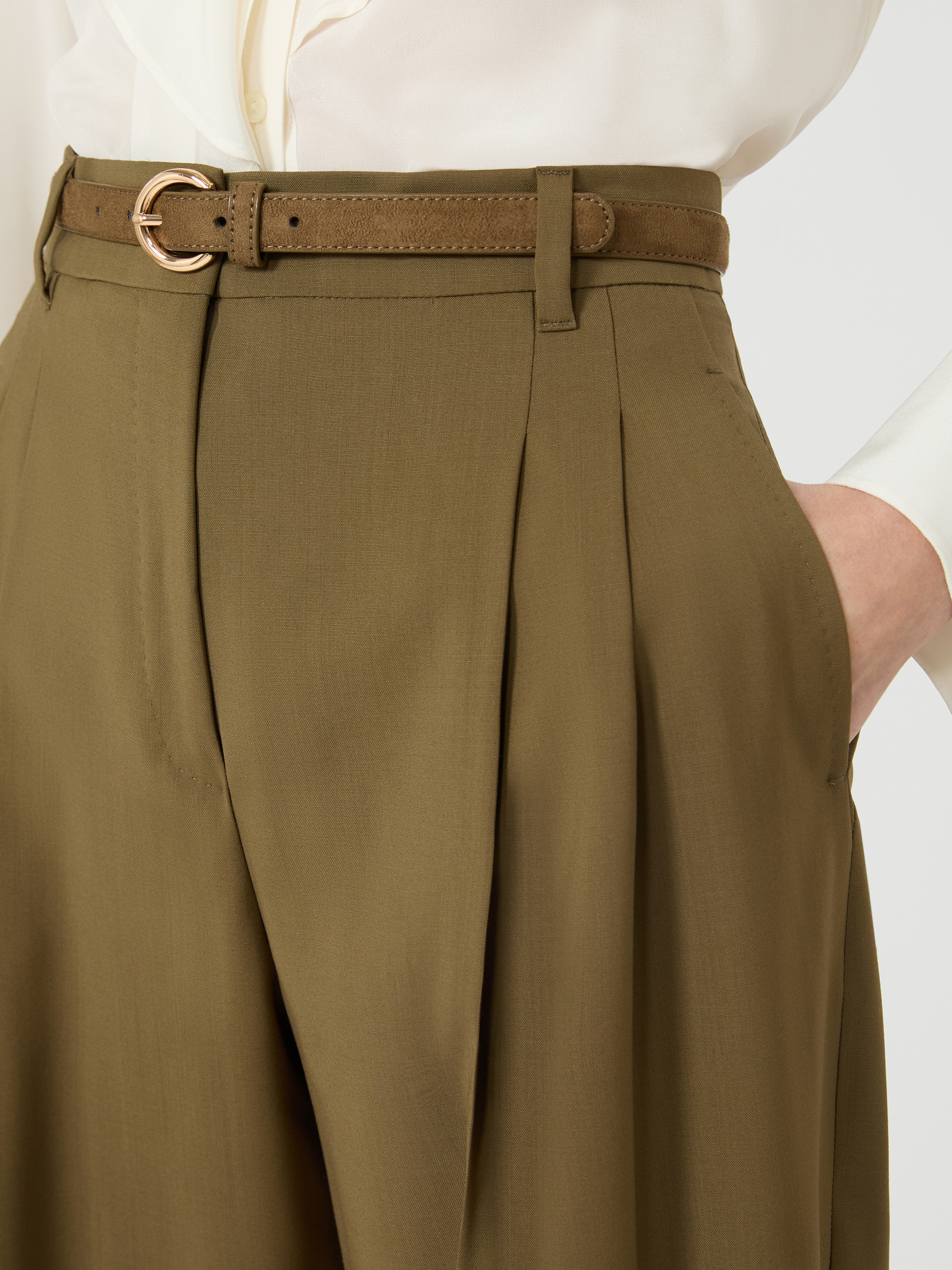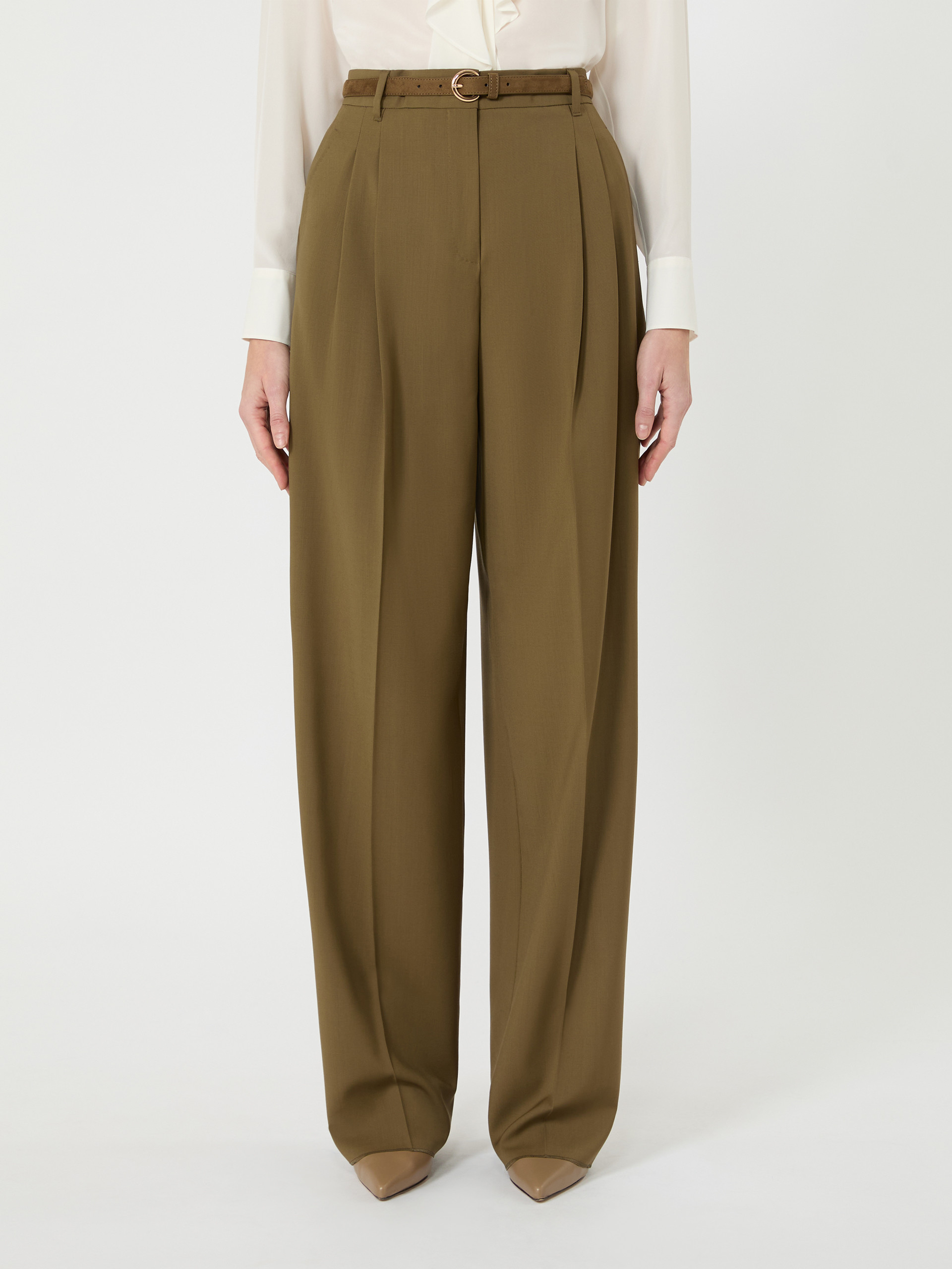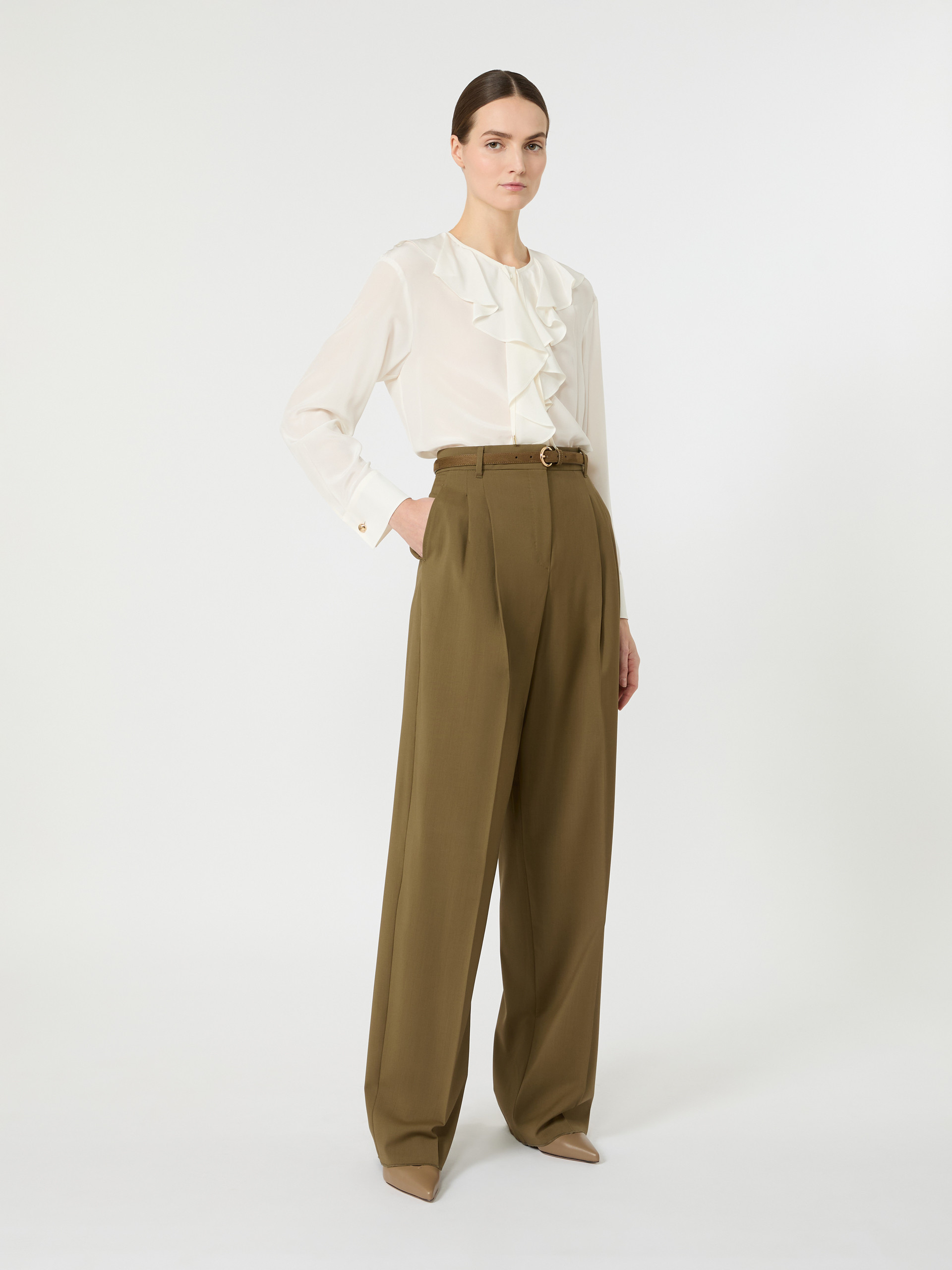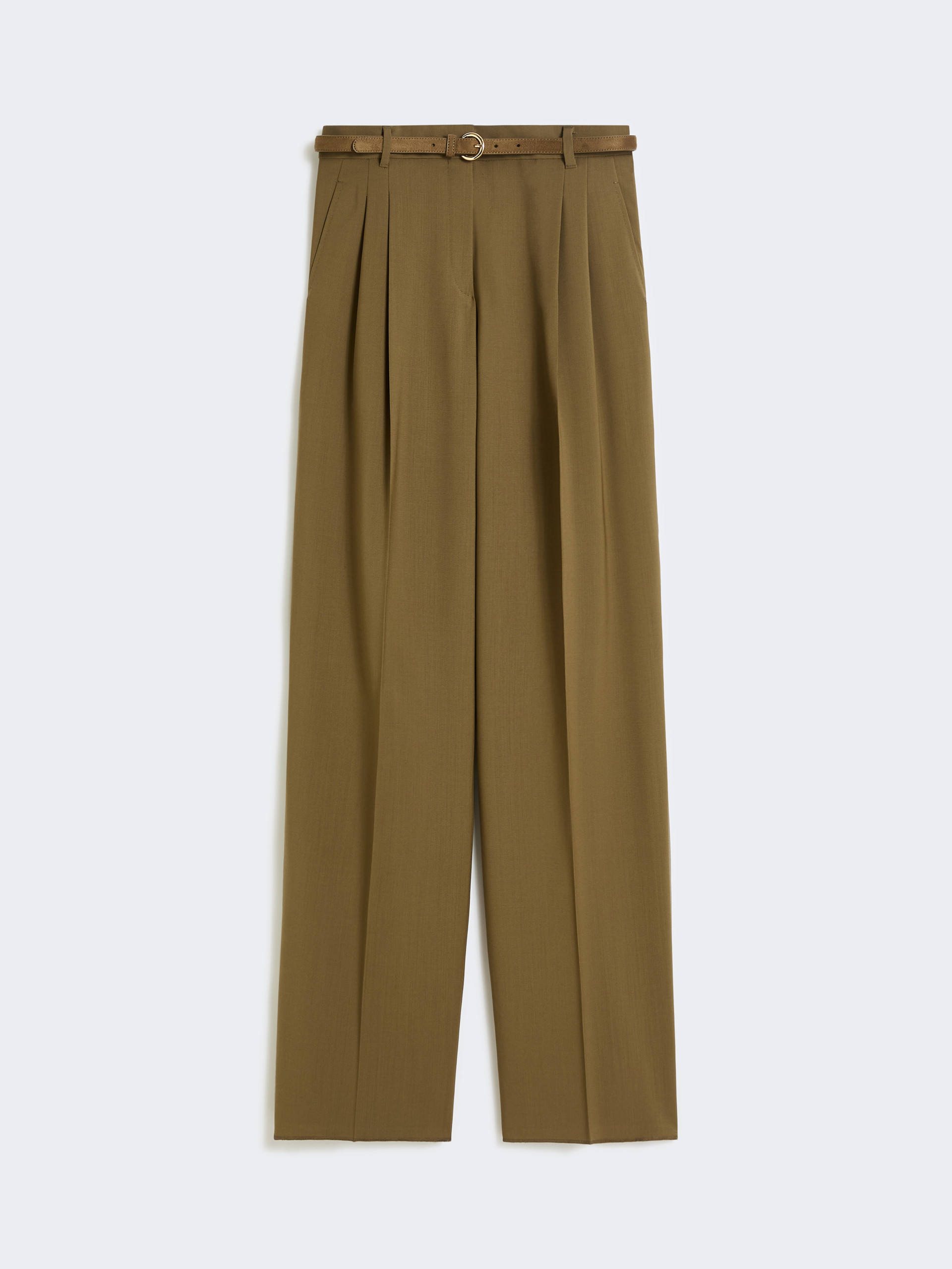 垂感阔腿长裤,前腰饰有双褶,流线型剪裁,裤脚微收,高腰设计,门襟拉链钩扣开合,两侧饰有斜插口袋,配有同色系腰带。