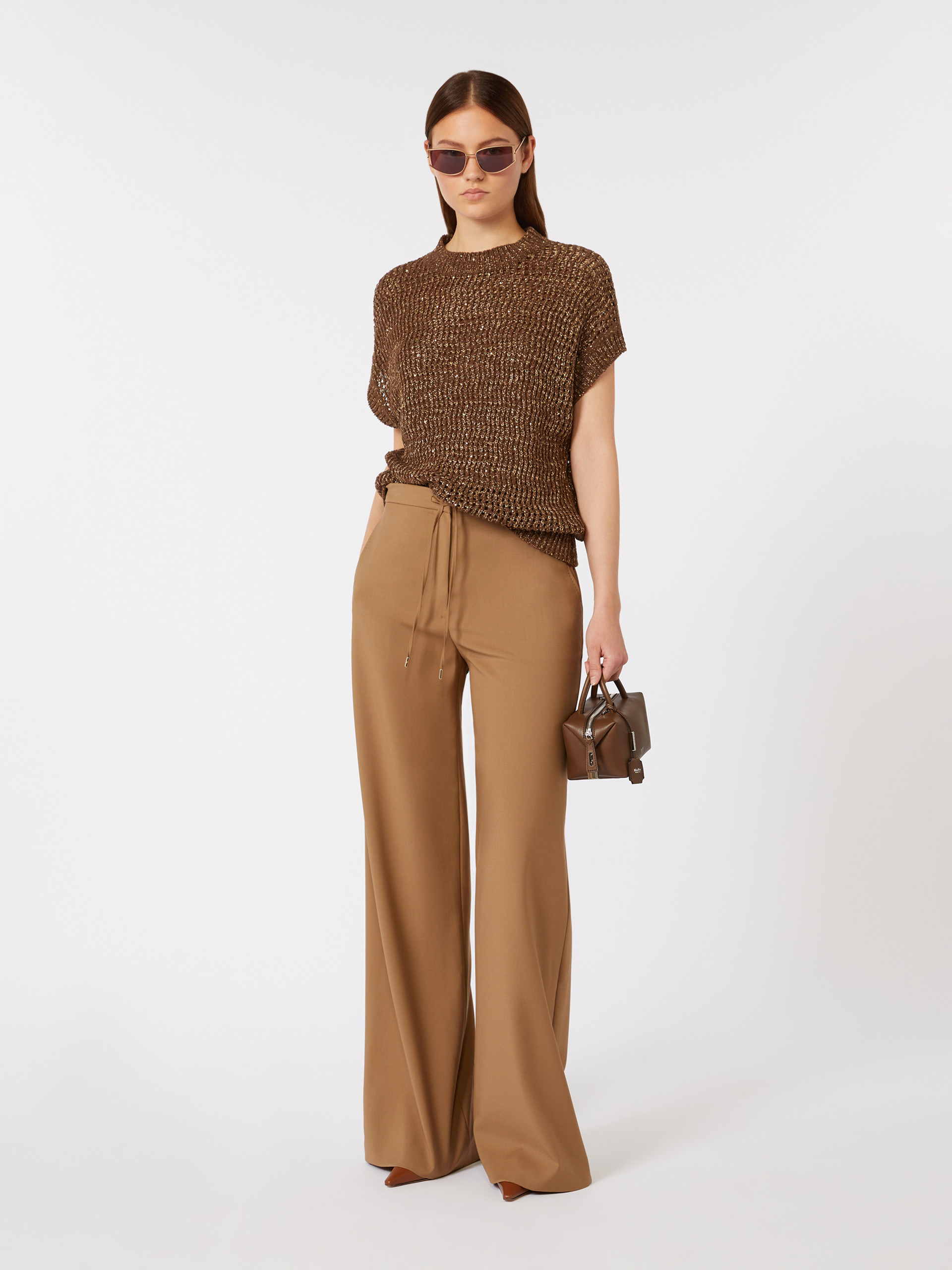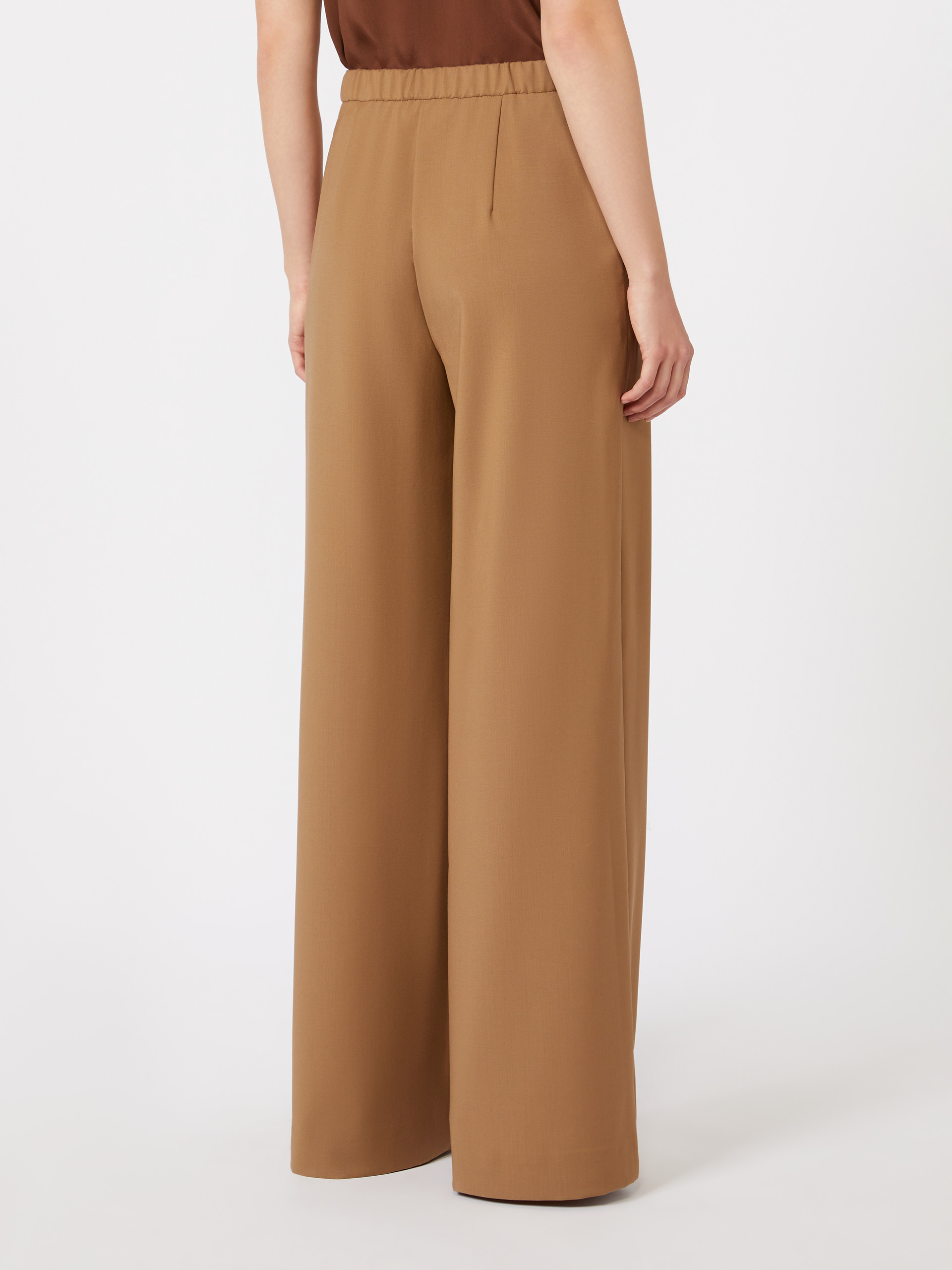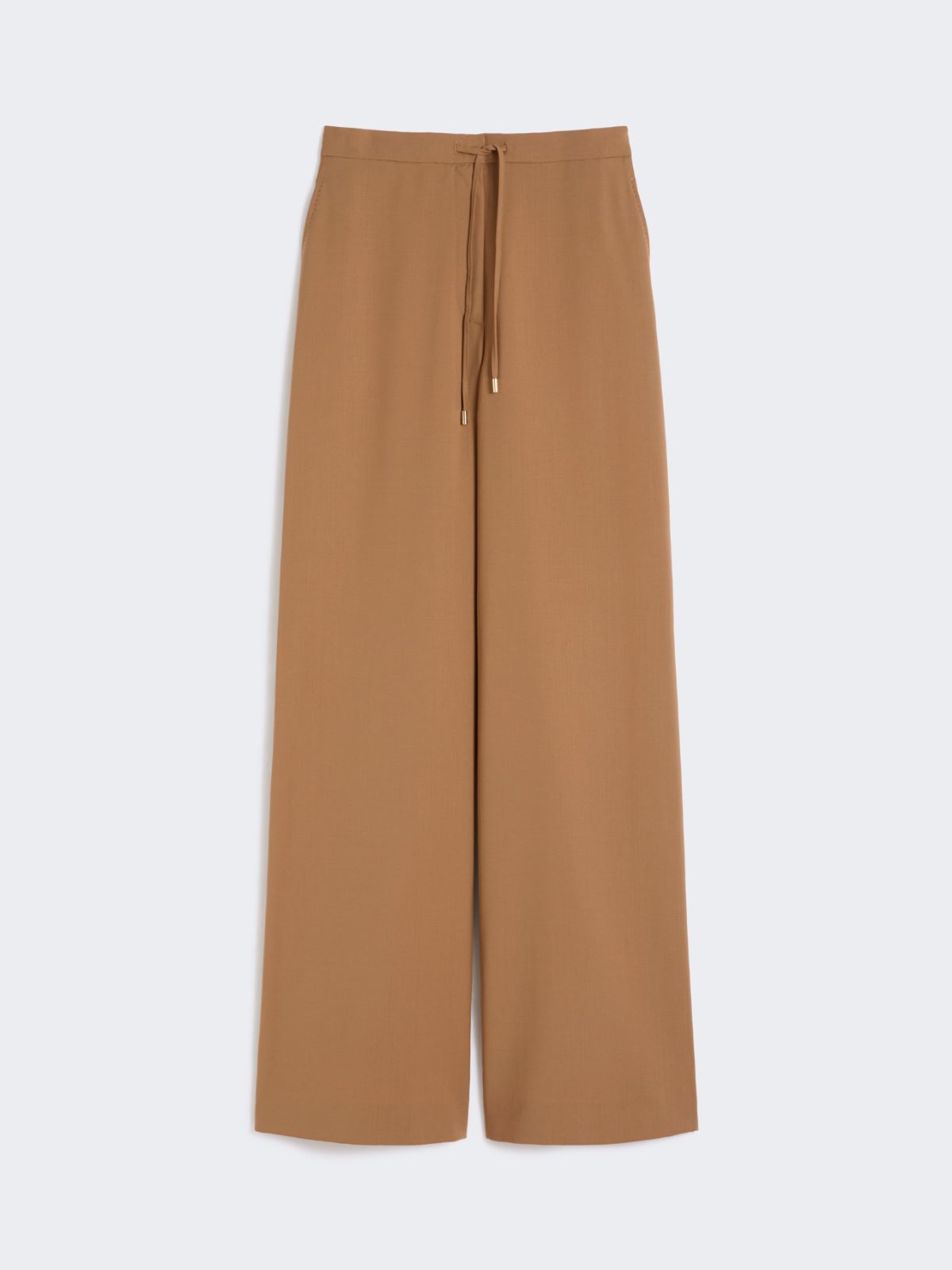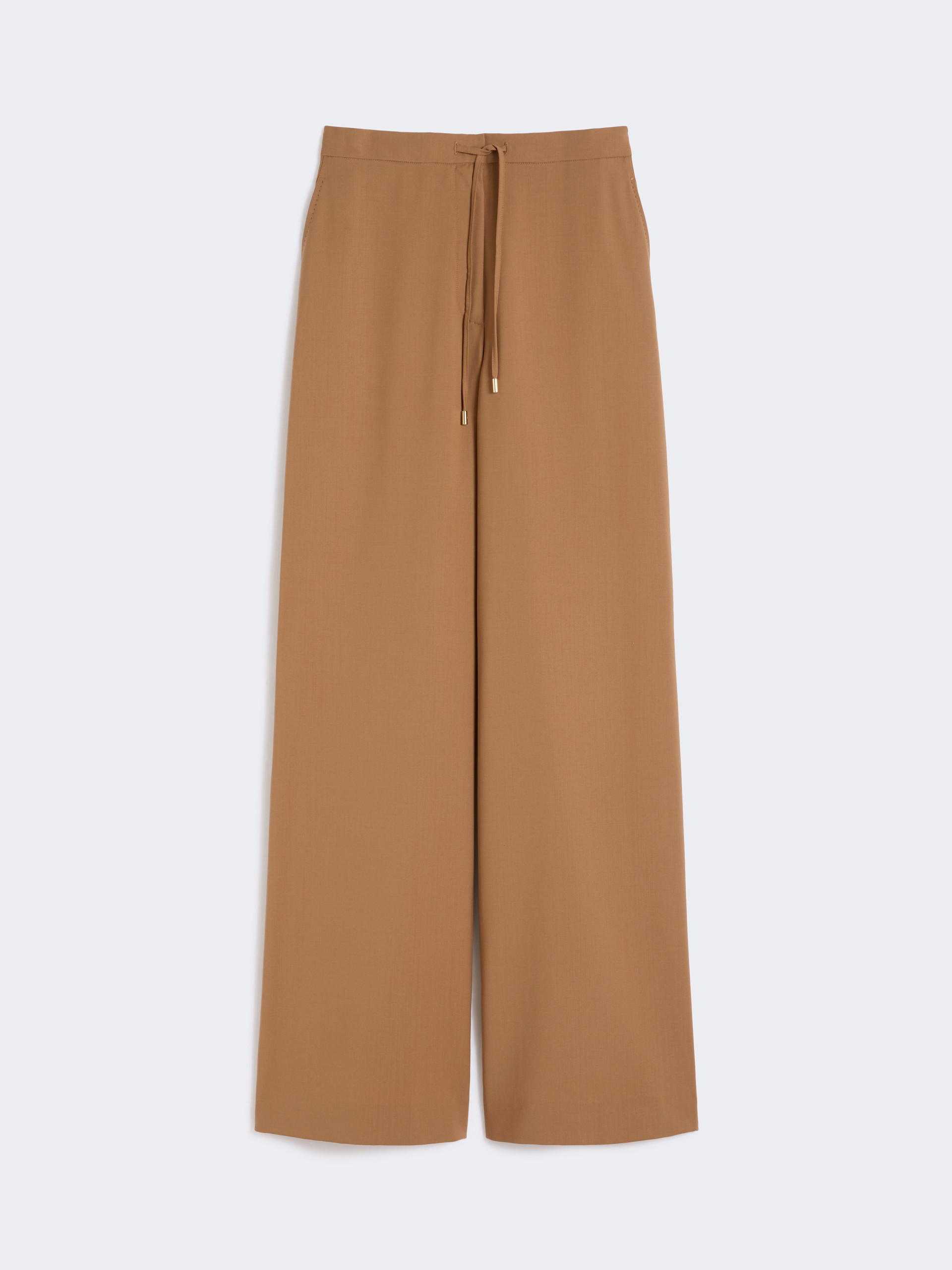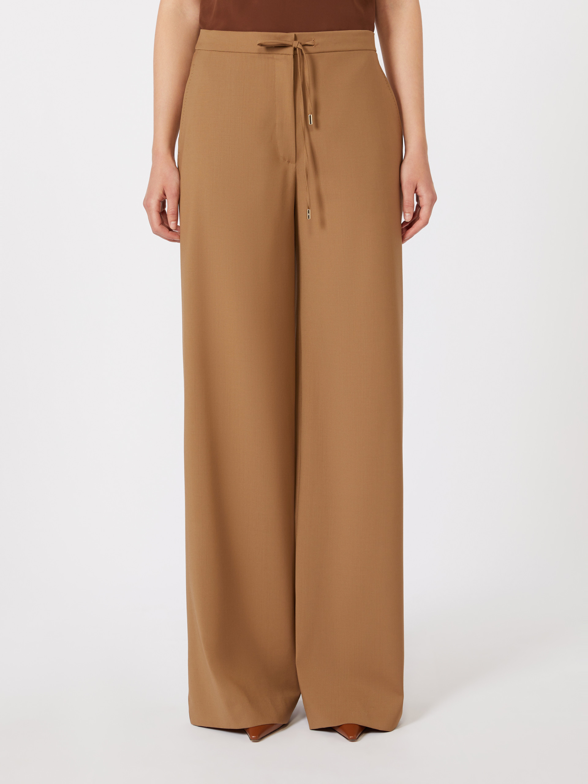 由绵羊毛制成的宽松长裤。宽松版型,阔腿剪裁,钩扣与隐形拉链开合,抽绳设计,斜插侧袋。