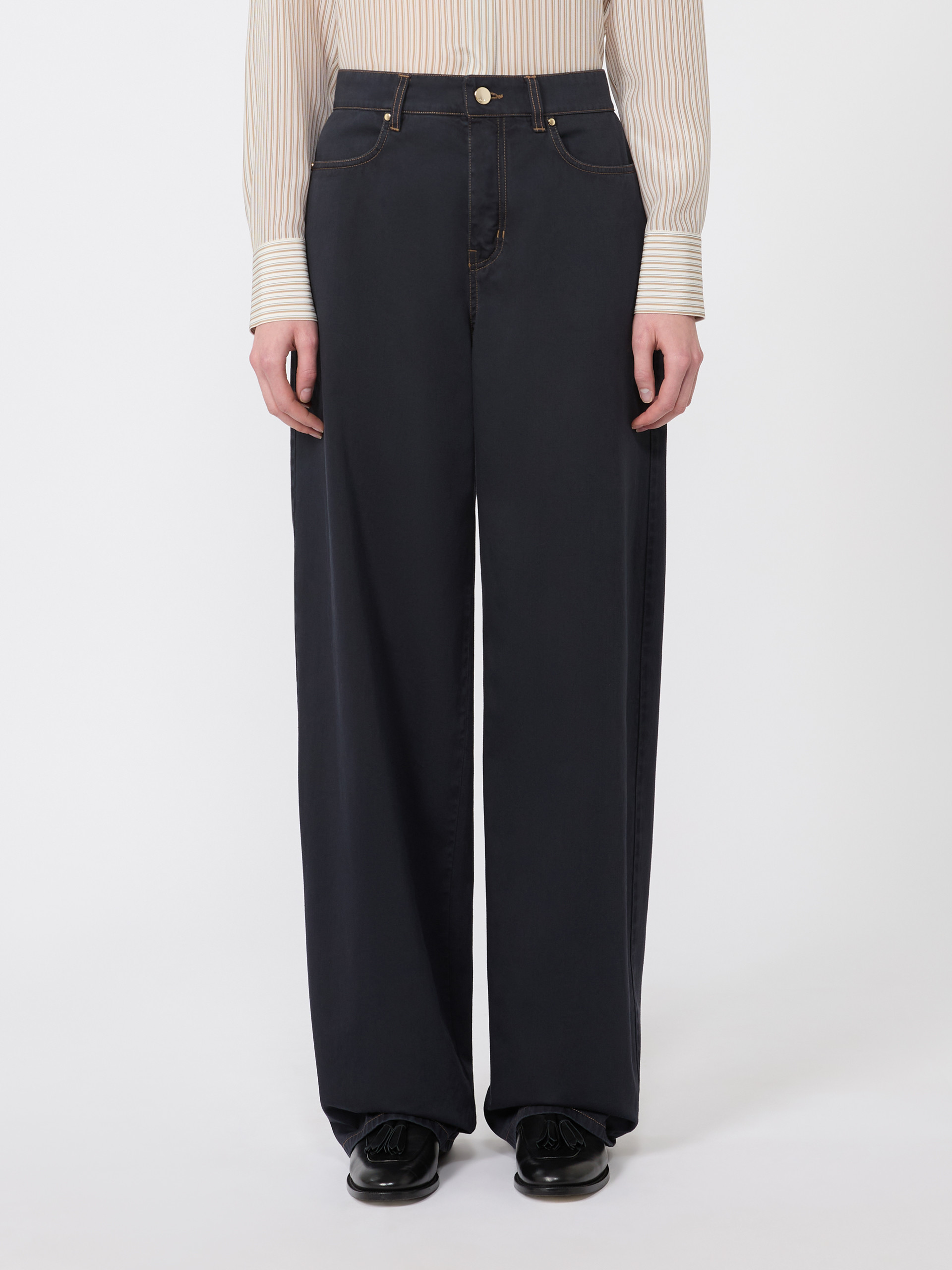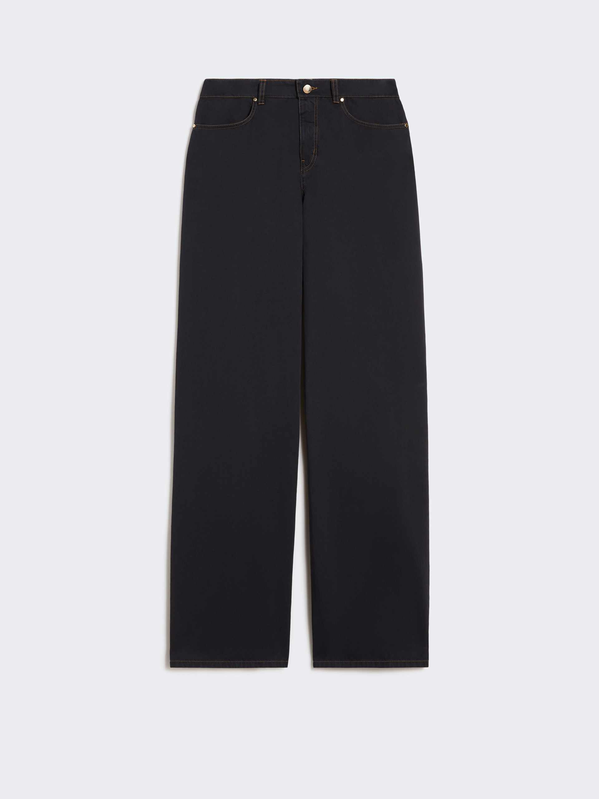 仿牛仔风格的宽松长裤。宽松裤腿,裤脚处略微收窄,暗门襟拉链配铆钉纽扣开合,口袋处有金属铆钉,后腰处饰有皮革品牌标识。