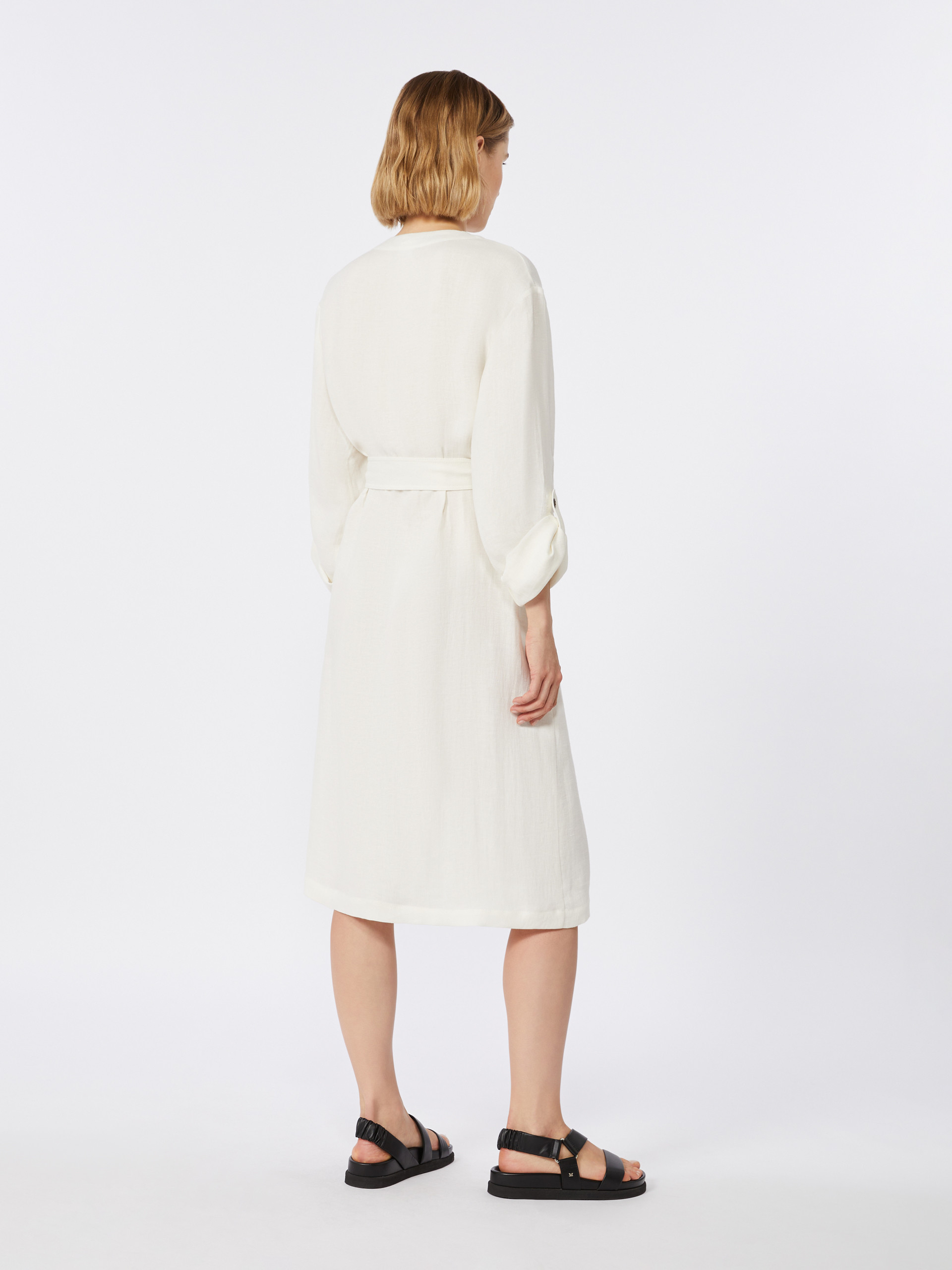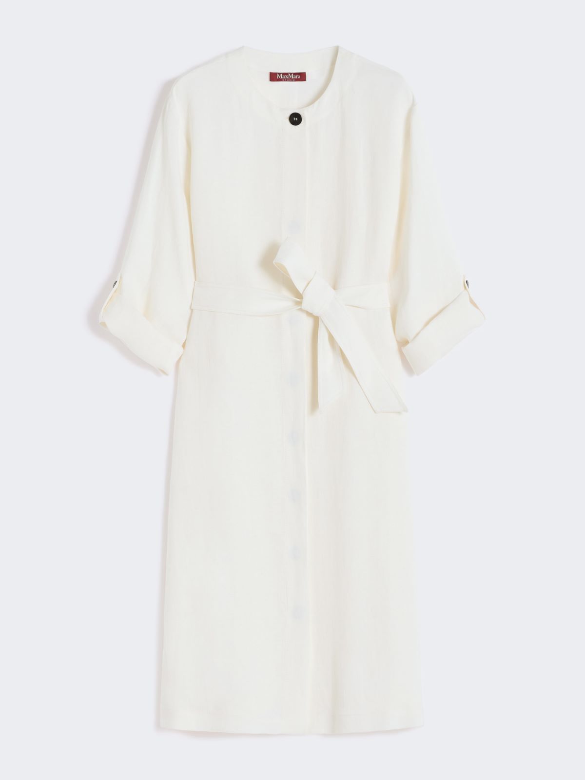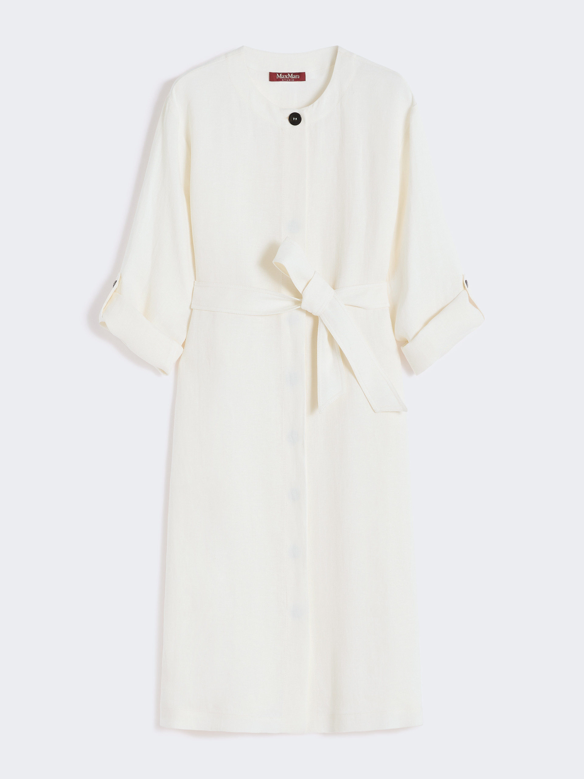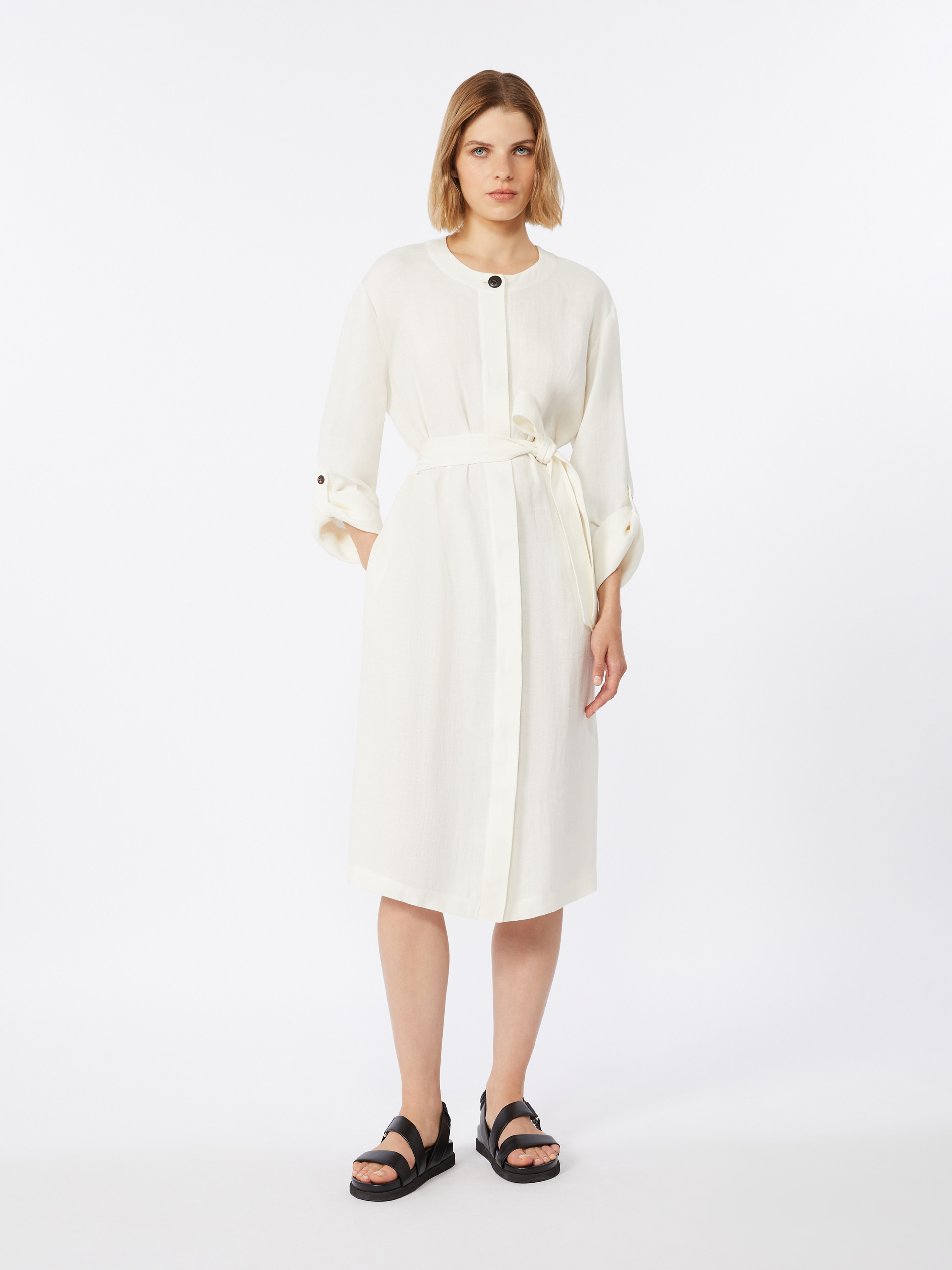 长款连衣裙,配有同色系腰带。直筒版型,袖口饰有袢带和纽扣细节,侧缝口袋,无内衬款式。