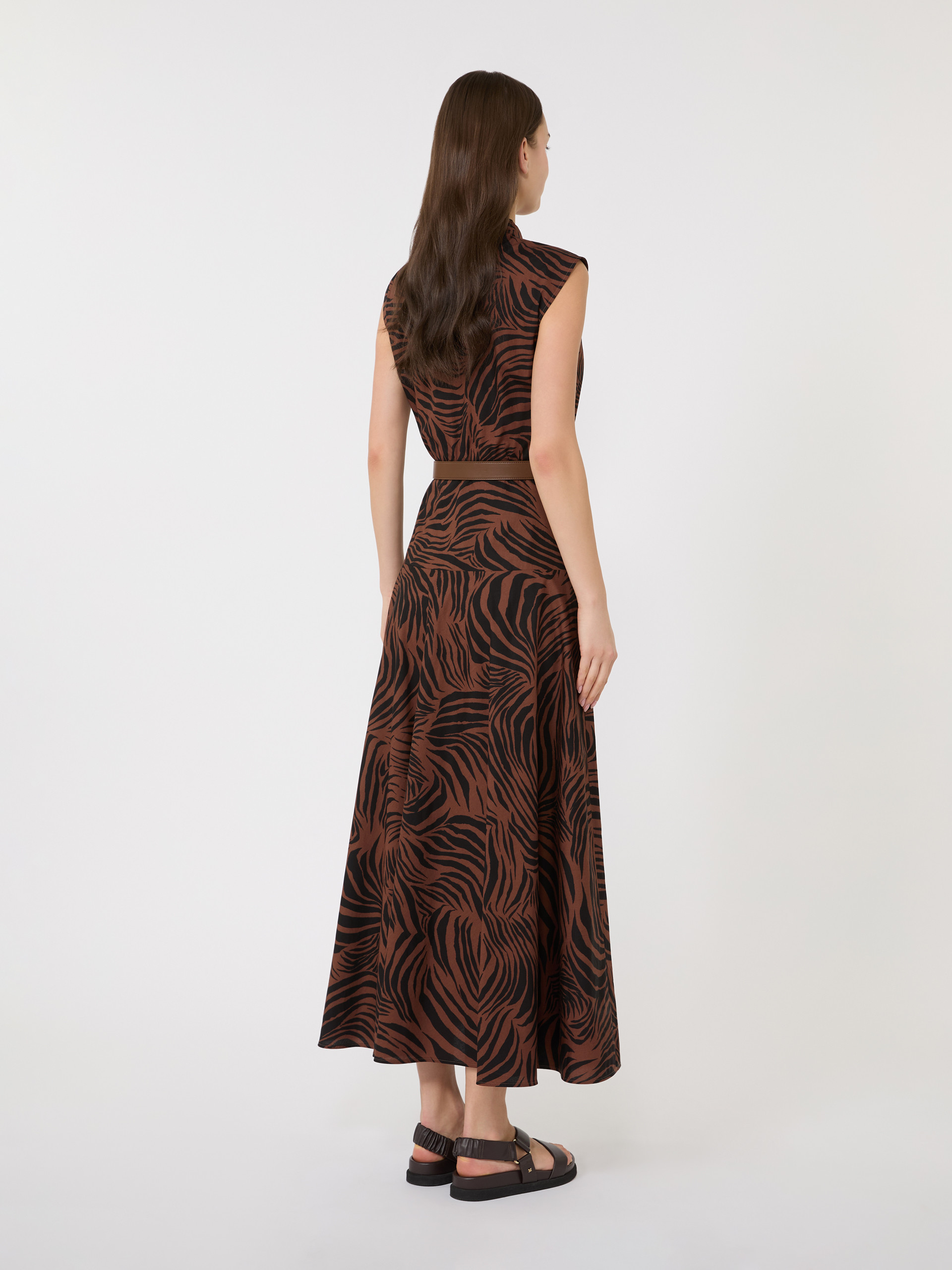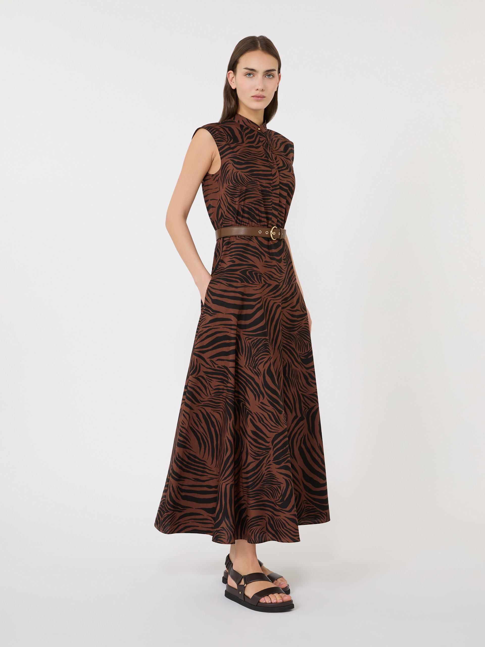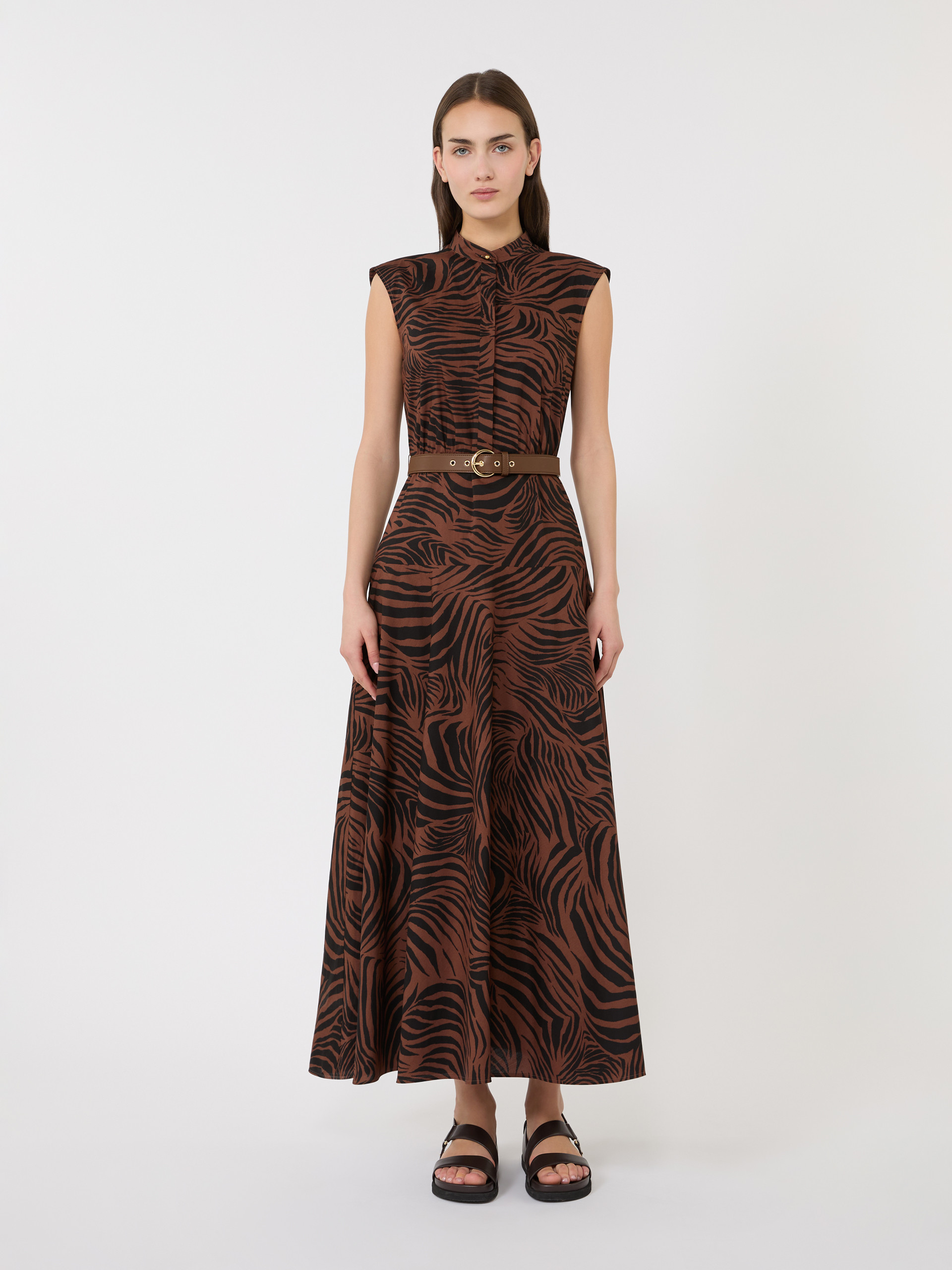 长款无袖连衣裙,通体饰有印花。收腰放摆剪裁,中式立领设计,衣身半段暗门襟纽扣开合,配有同色系腰带,无内衬款式。