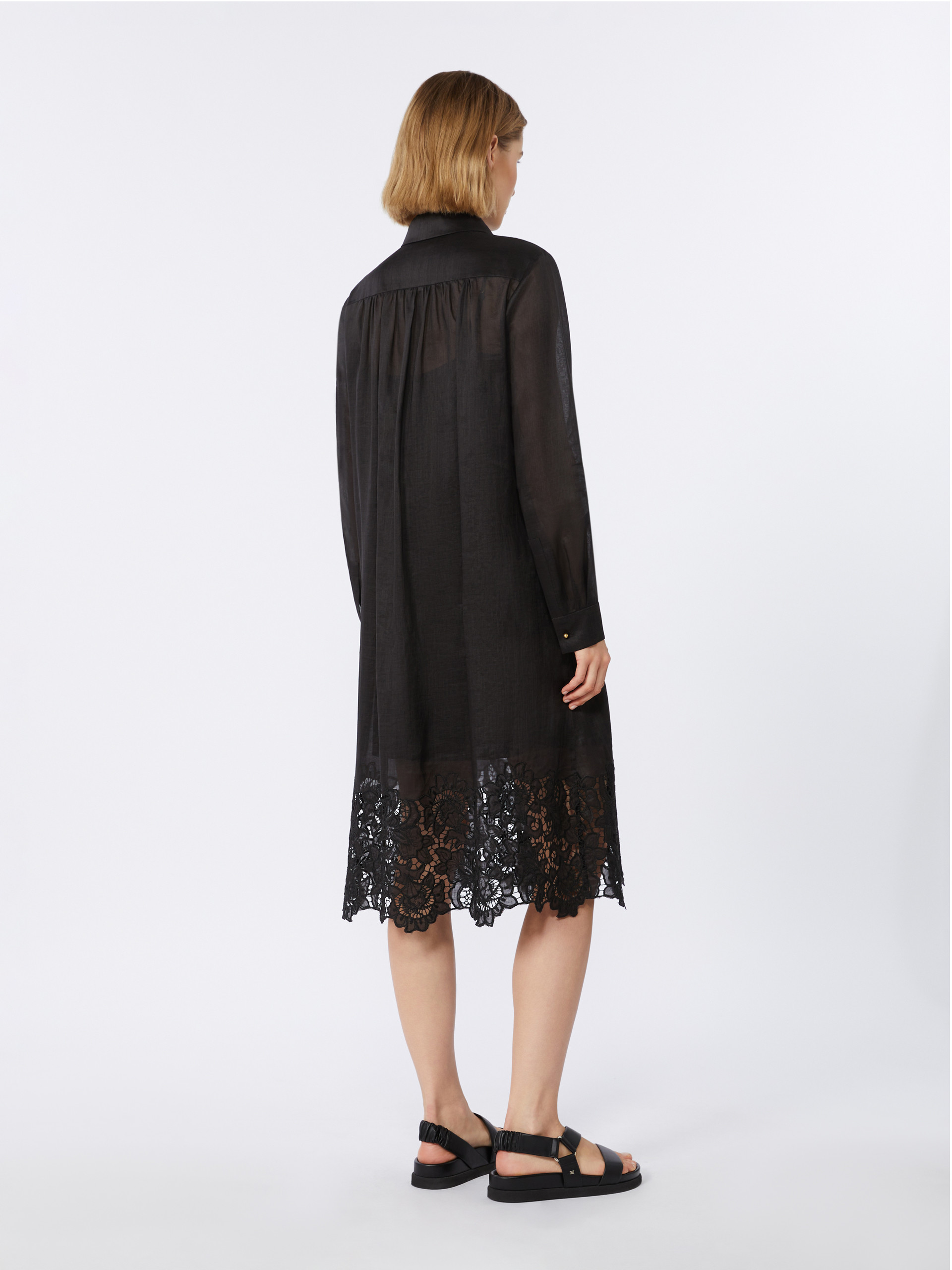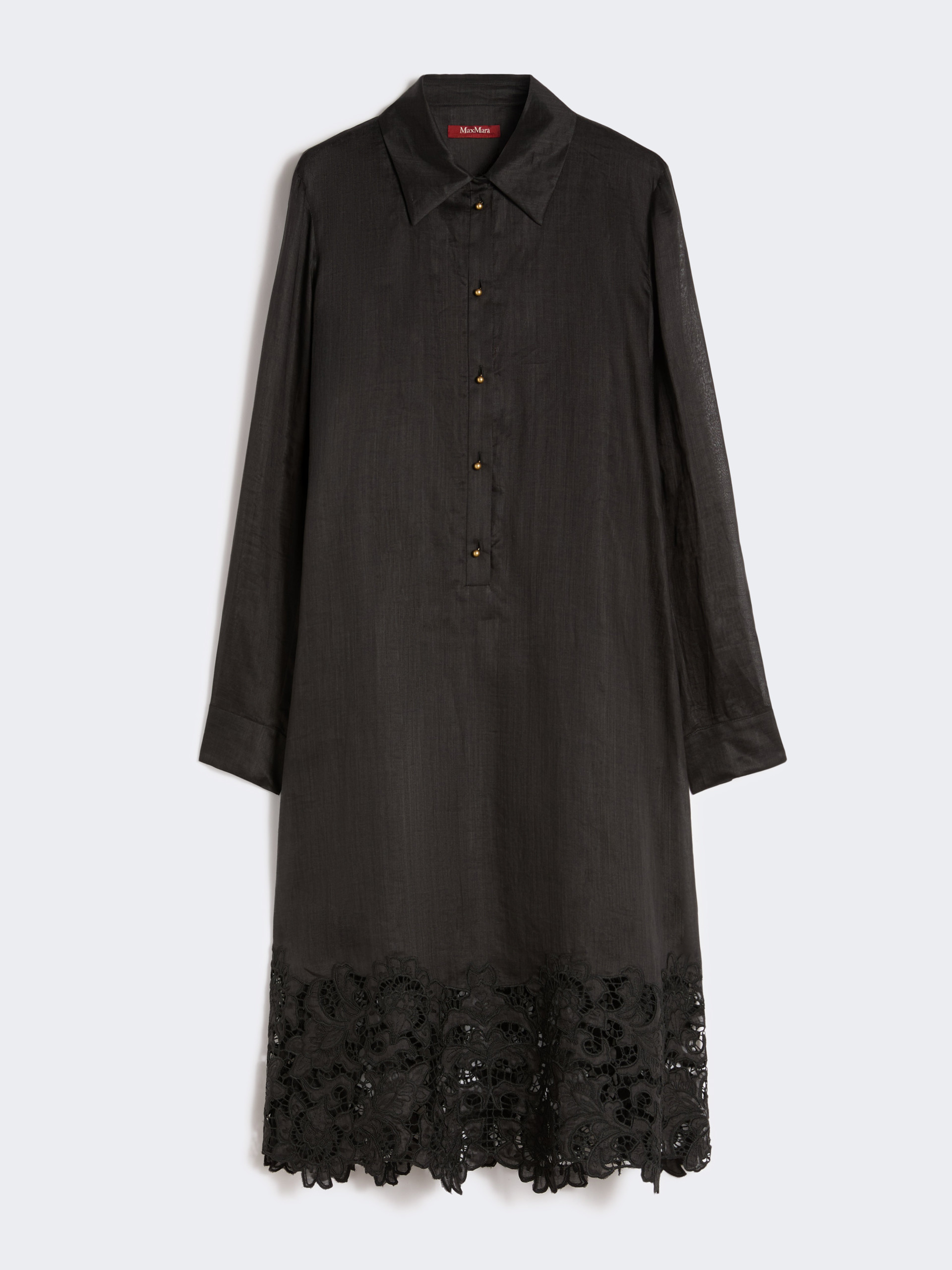 长款衬衫式连衣裙,下摆饰有镂空细节。直筒版型,正肩袖,侧缝插袋,配同色系衬裙。