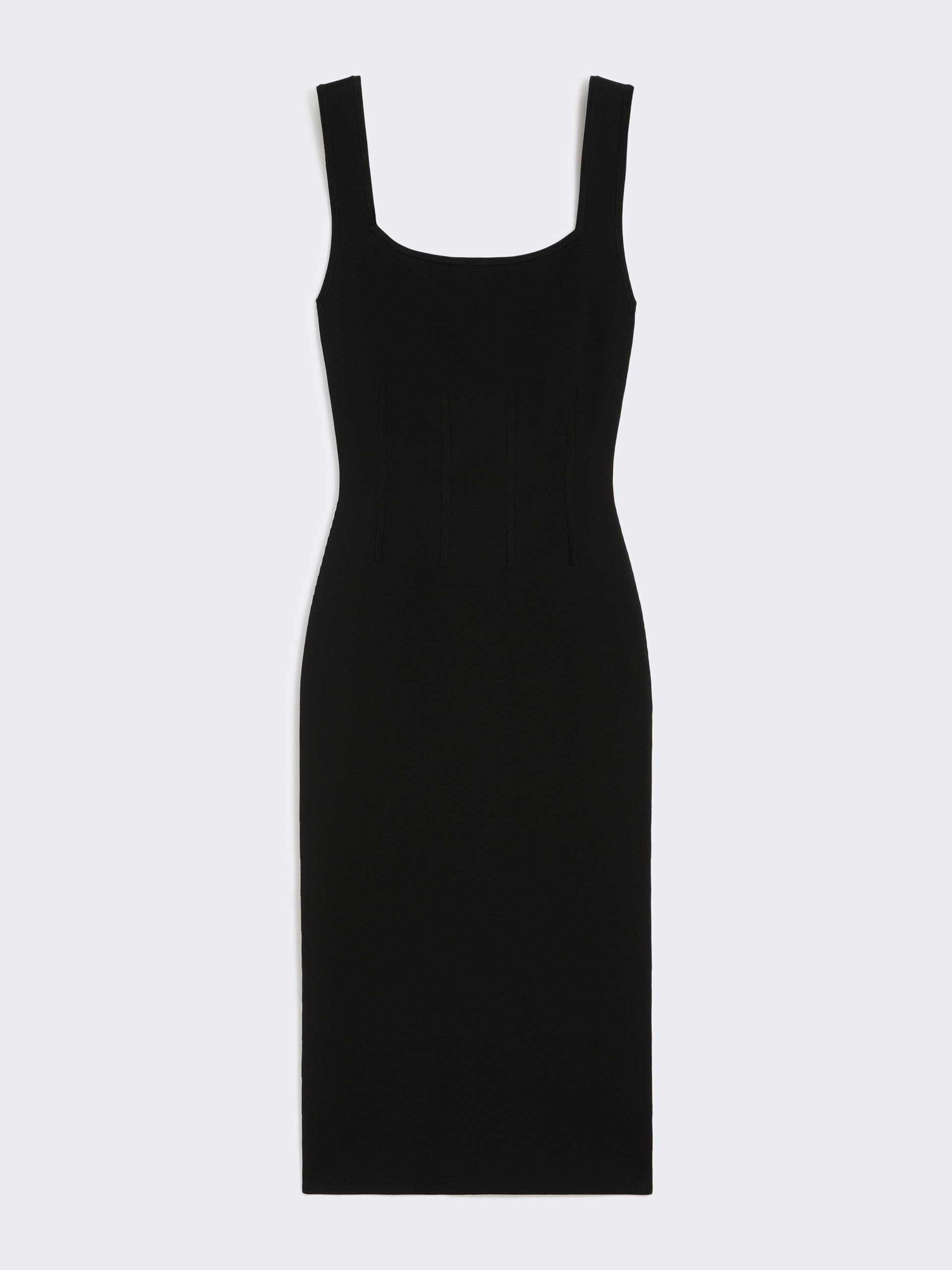 Sleeveless midi dress featuring a sheath cut and corset-look bodice. - Full Milano-knit stretch viscose yarn dress - Slim fit - Square neckline and wide shoulder straps with piped trims - Sewn dart detail on the front and back of the waist - Unlined model
