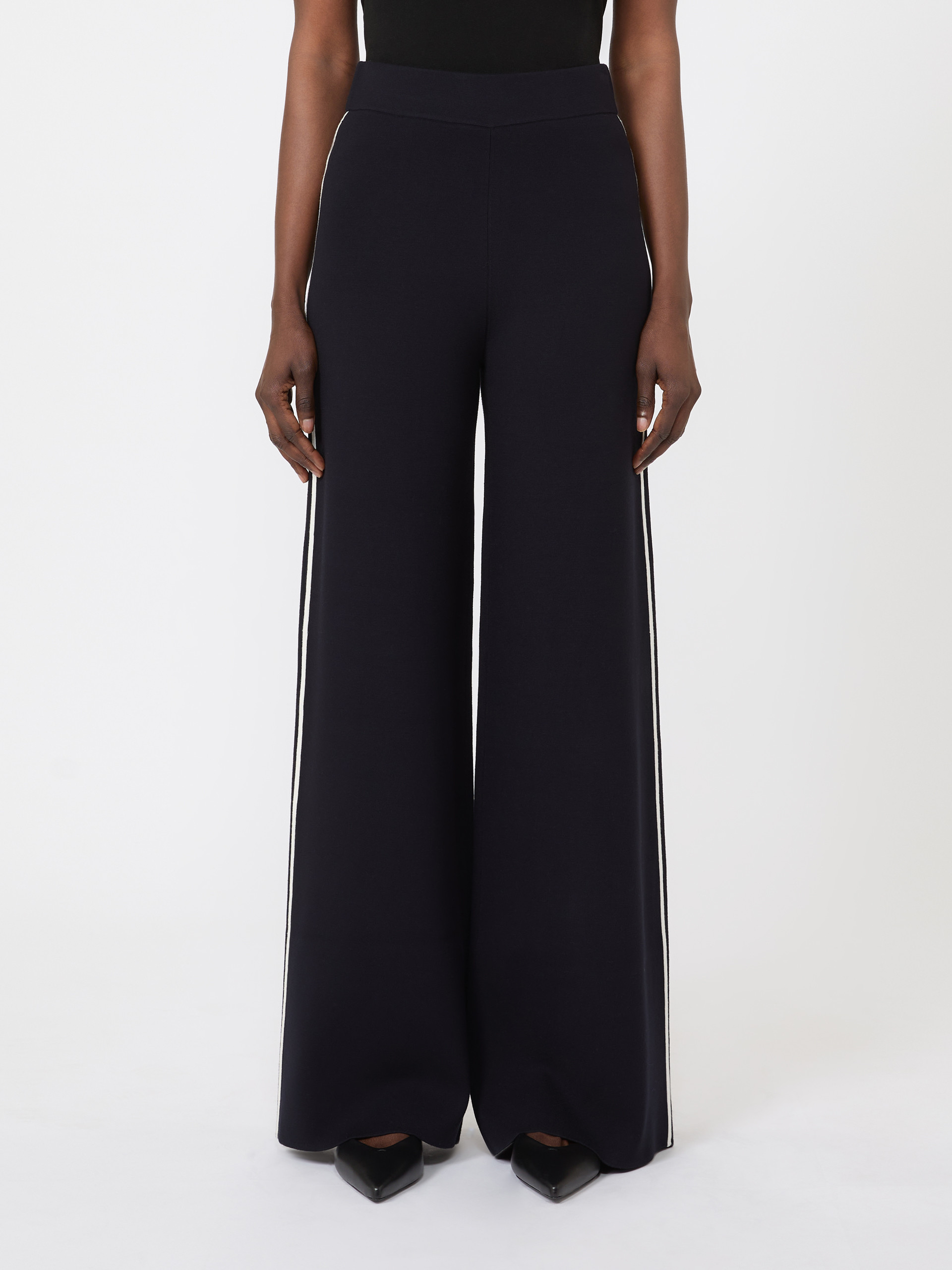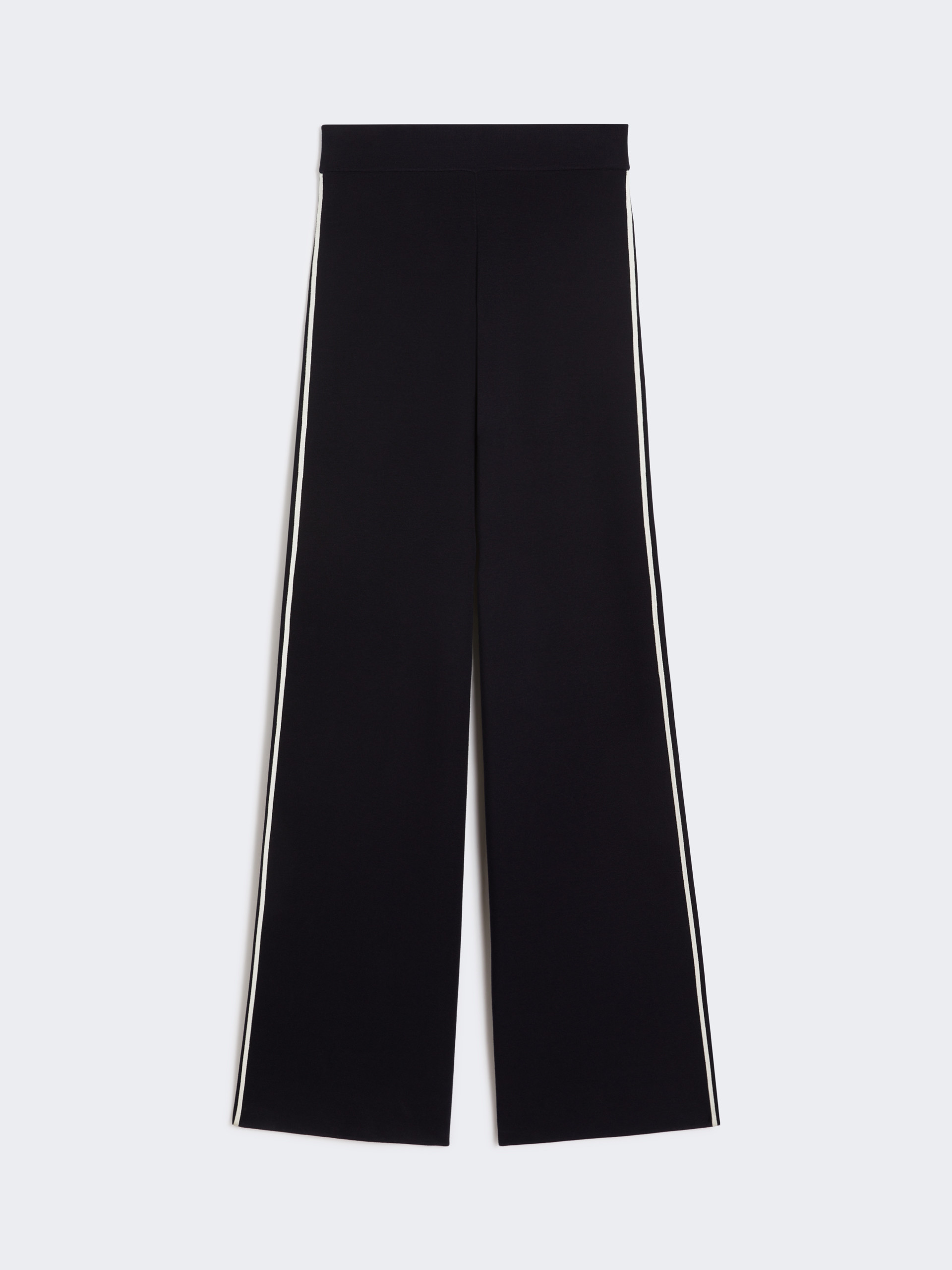 针织直筒长裤。直筒版型,微喇裤腿,内置松紧腰带。