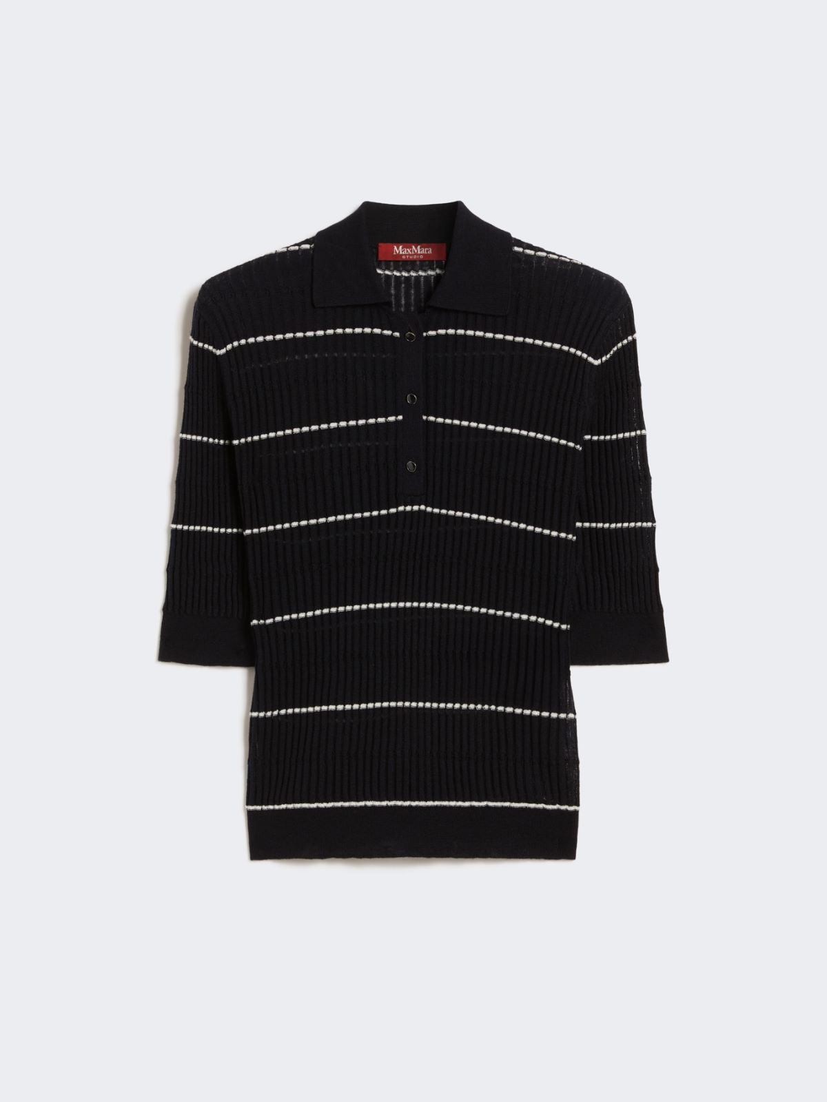 饰有镂空细节的针织Polo衫。采用桑蚕丝绵羊毛混纺面料制成,衣领配有纽扣固定。