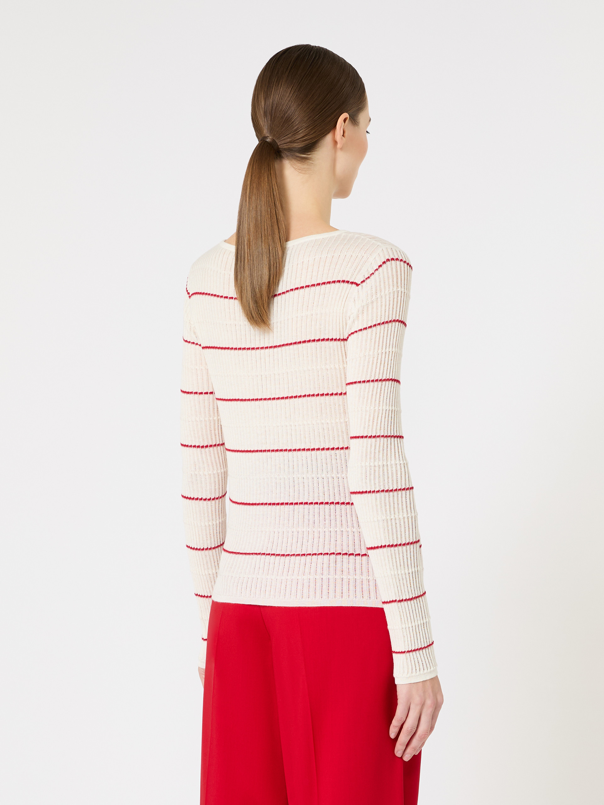 采用桑蚕丝和绵羊毛混纺面料制成的针织毛衣。镂空细节,修身版型,长款正肩袖设计,罗纹饰边。