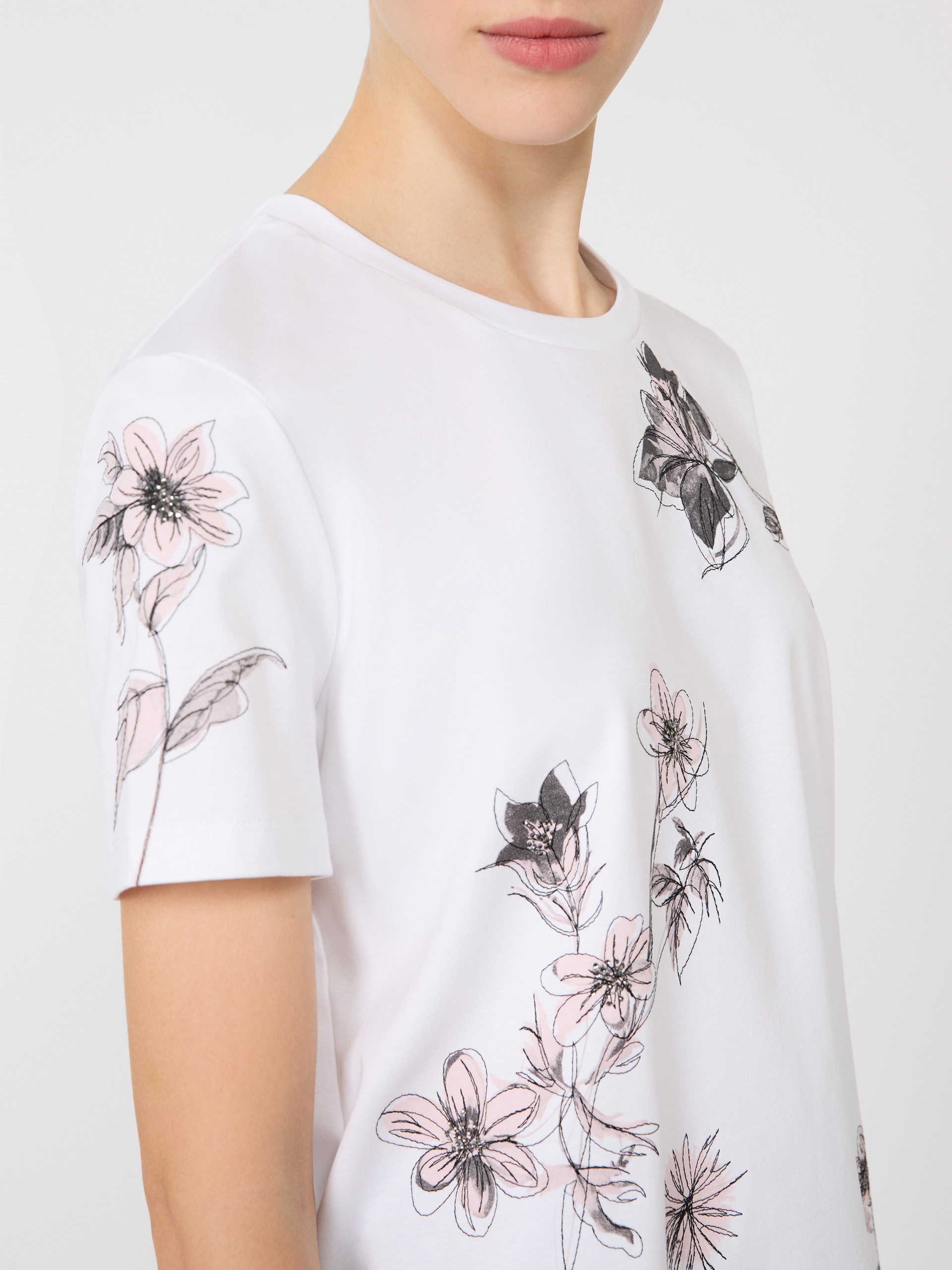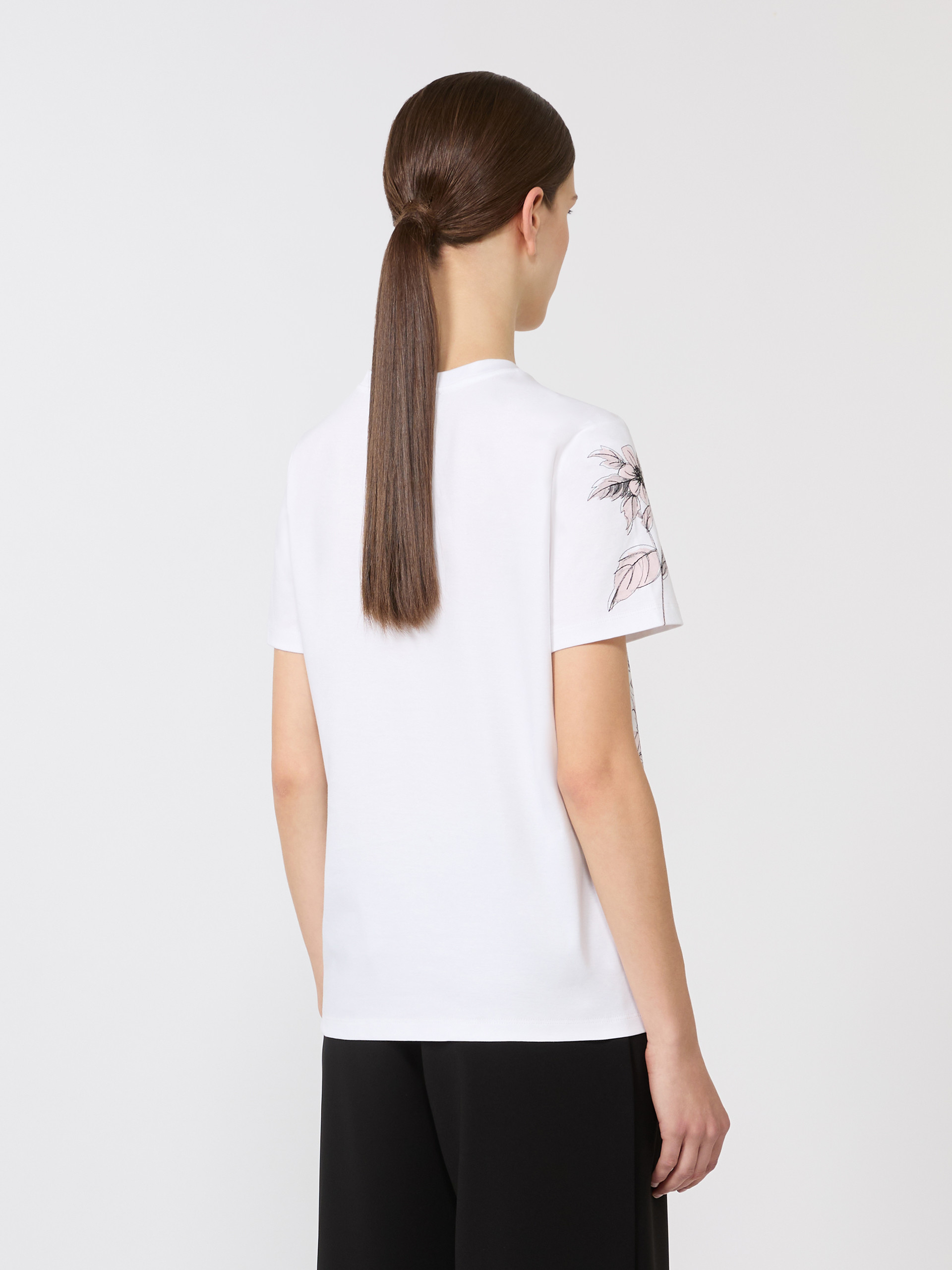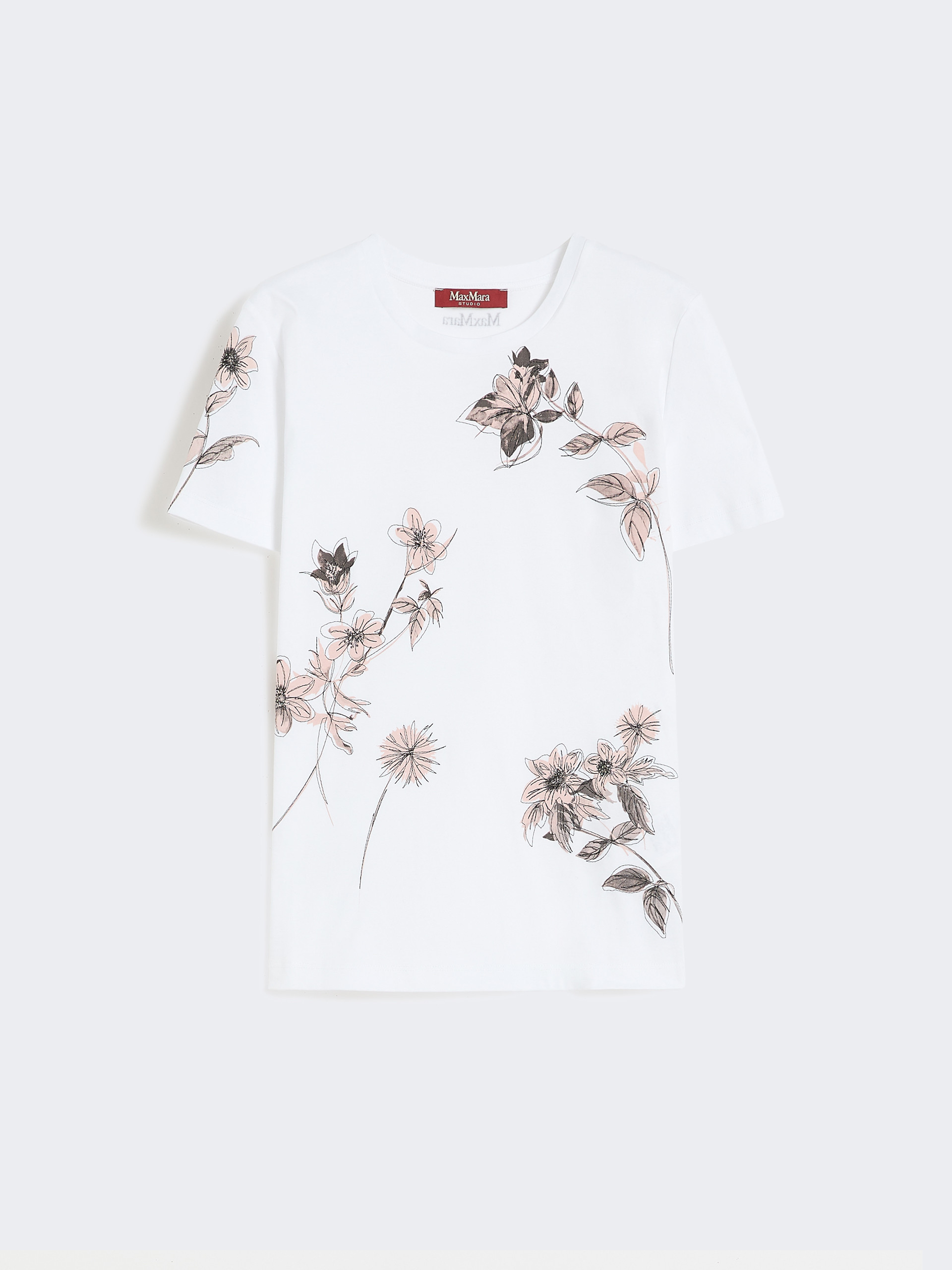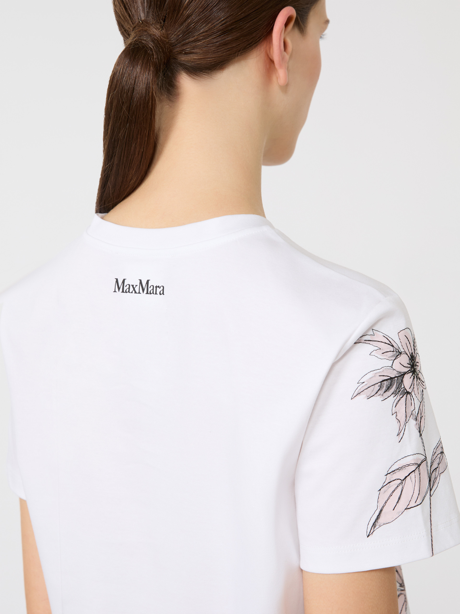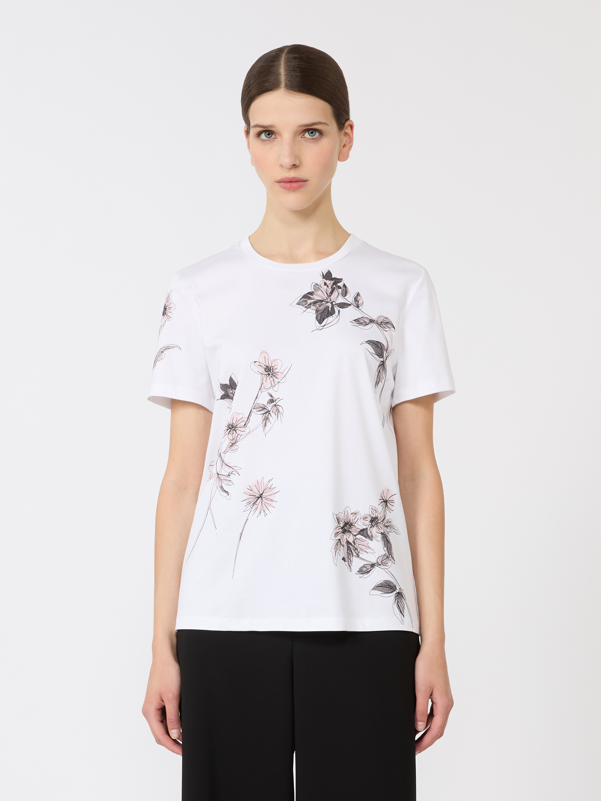基础款T恤,胸前饰有印花细节。直筒版型,经典圆领,短款正肩袖设计。