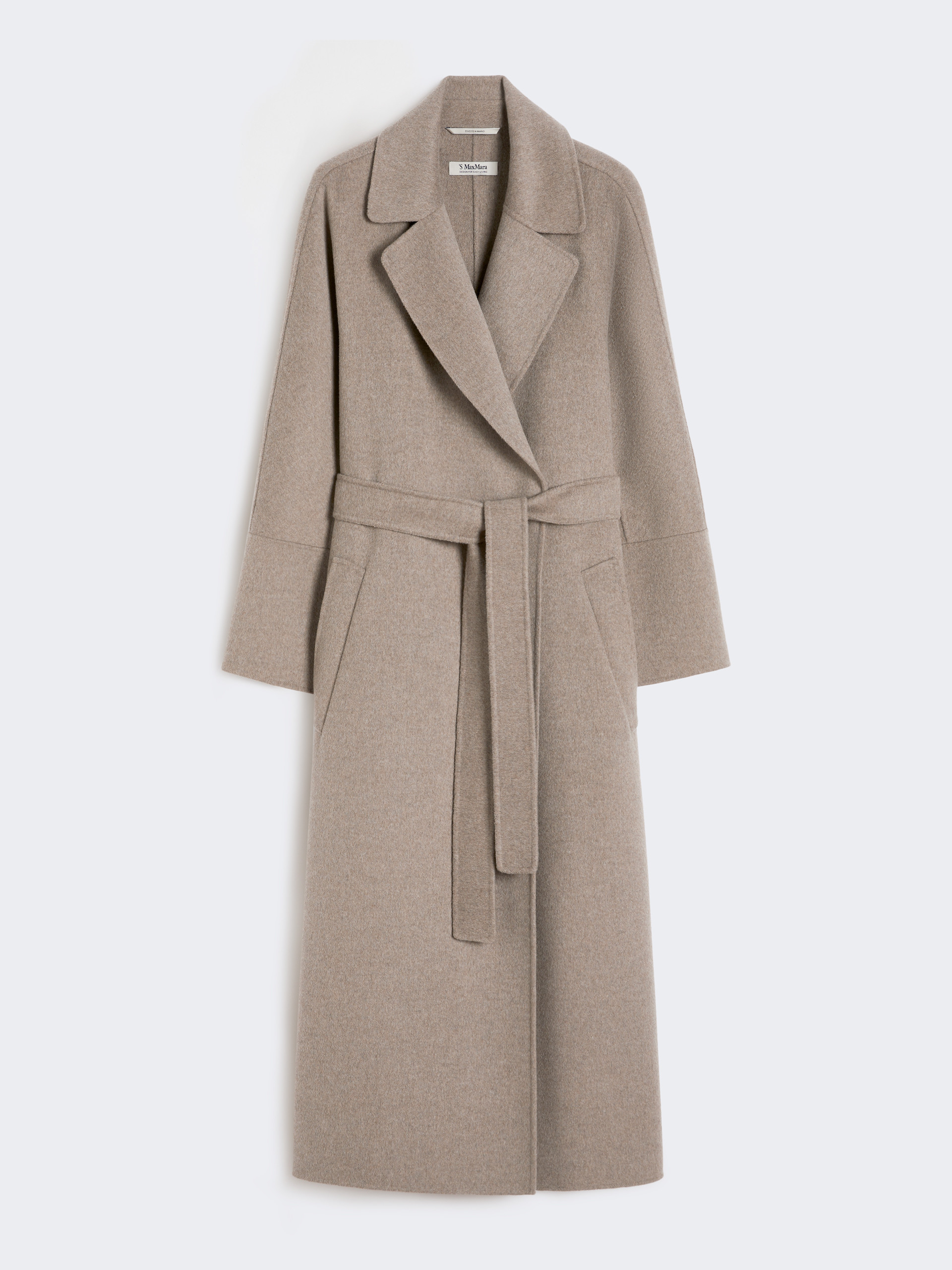Long robe coat. - Coat in hand-sewn double-faced pure wool broadcloth - Slightly flared fit - Lapel collar - Kimono sleeves with long cuffs - Matching waist belt - Welt side pockets - Unlined model
