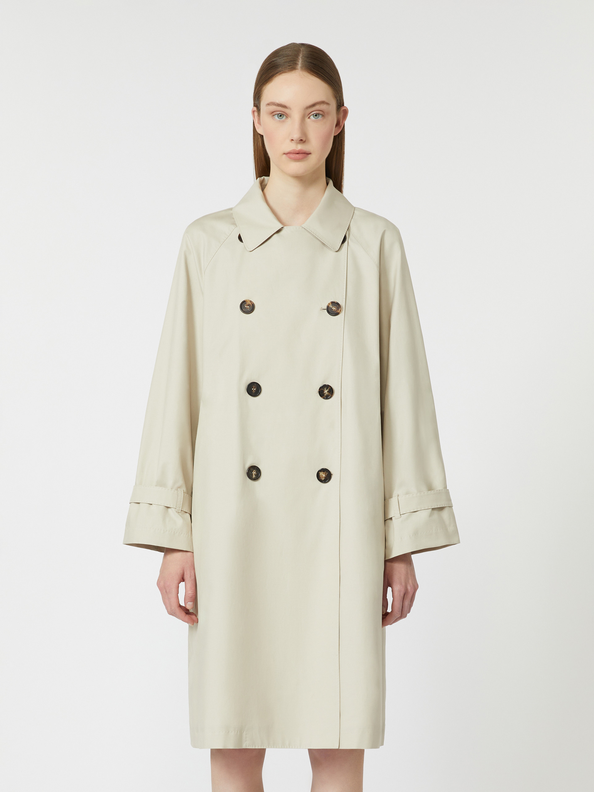中长款双排扣风衣,配有同色系腰带。微喇廓形,后中开衩,插肩袖,配可调节袖袢细节,侧缝插袋,半衬里款式。