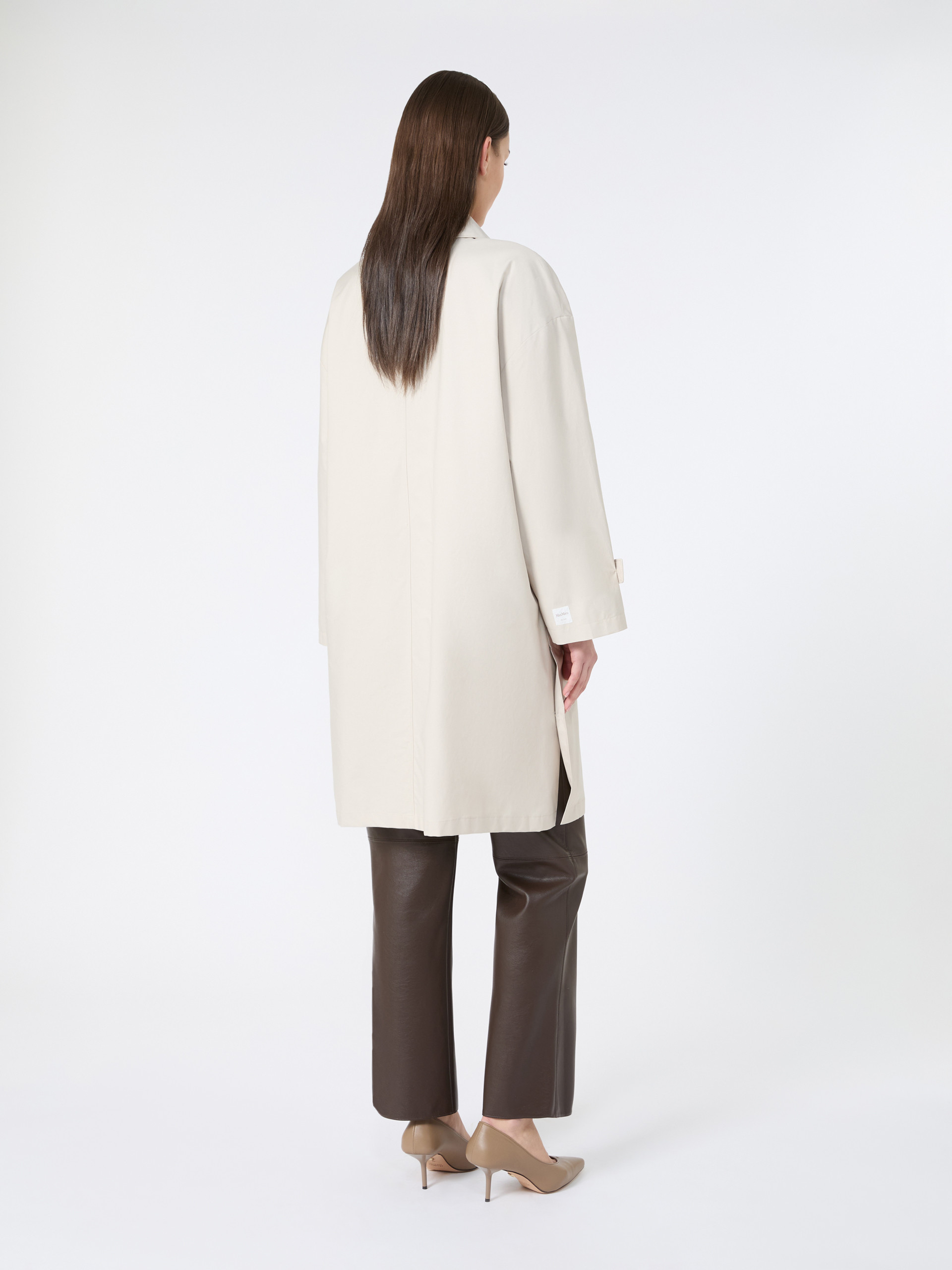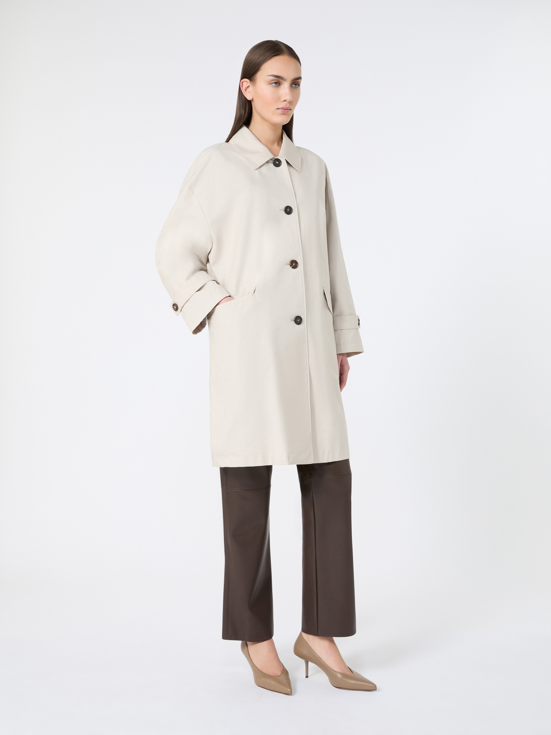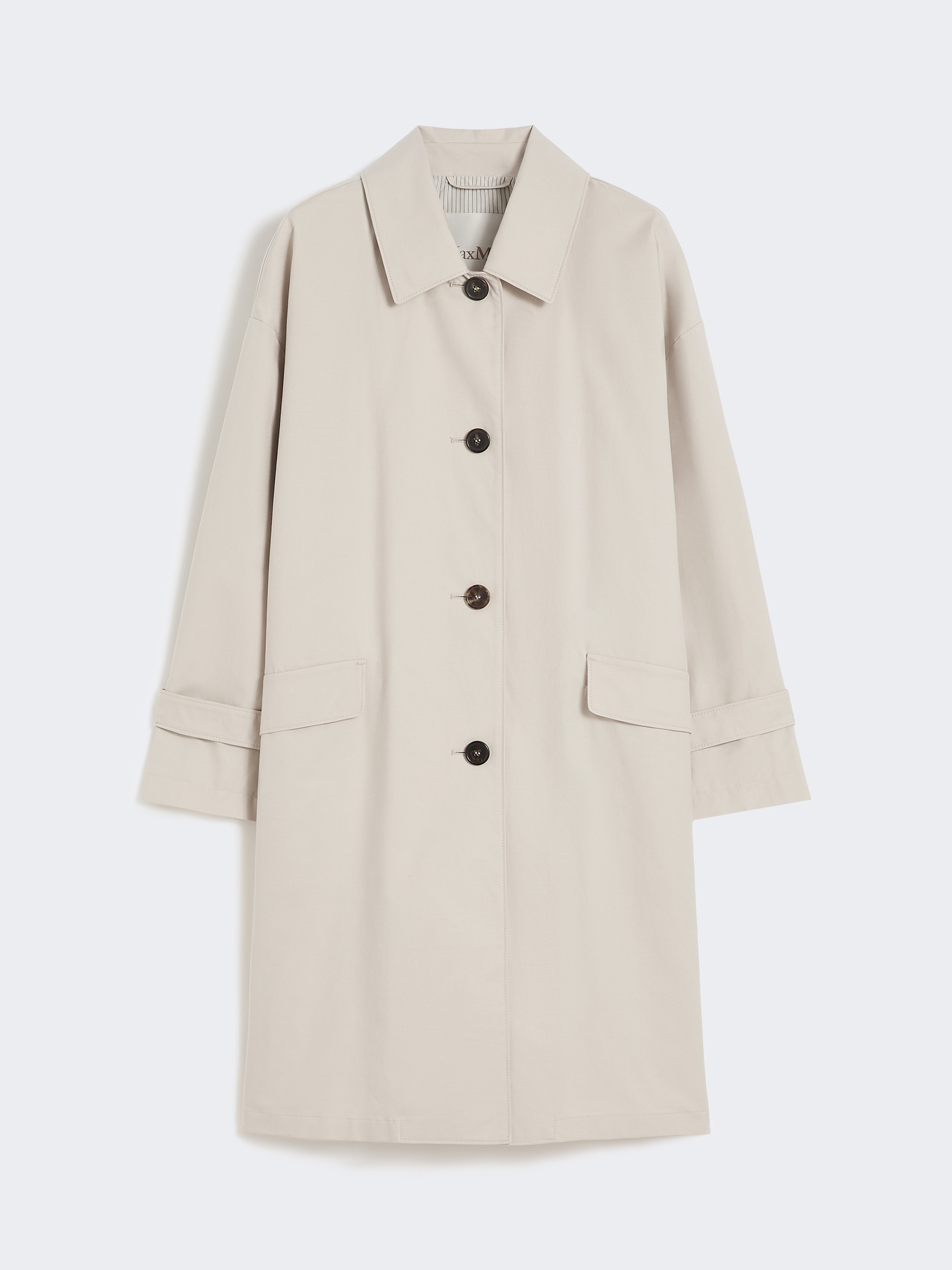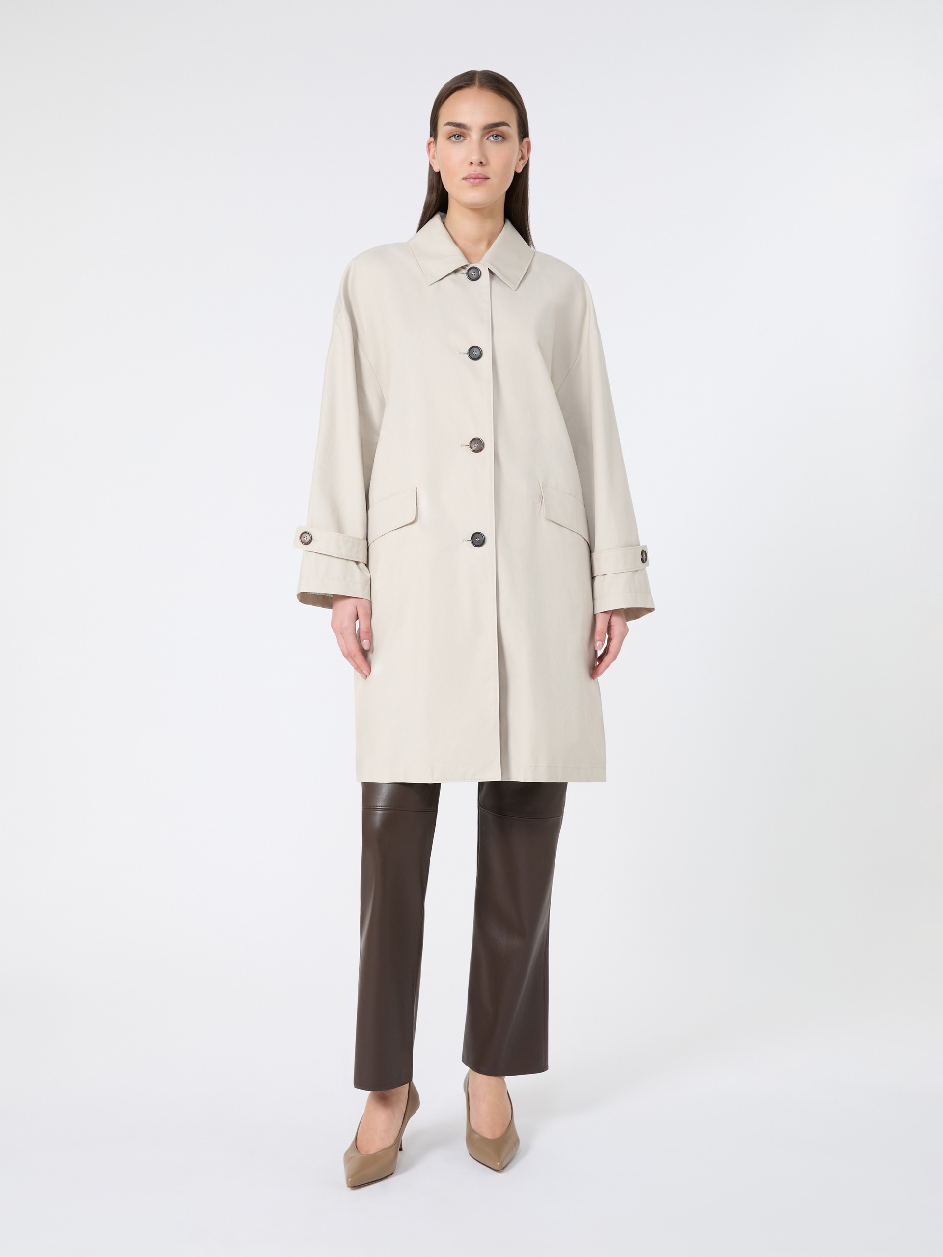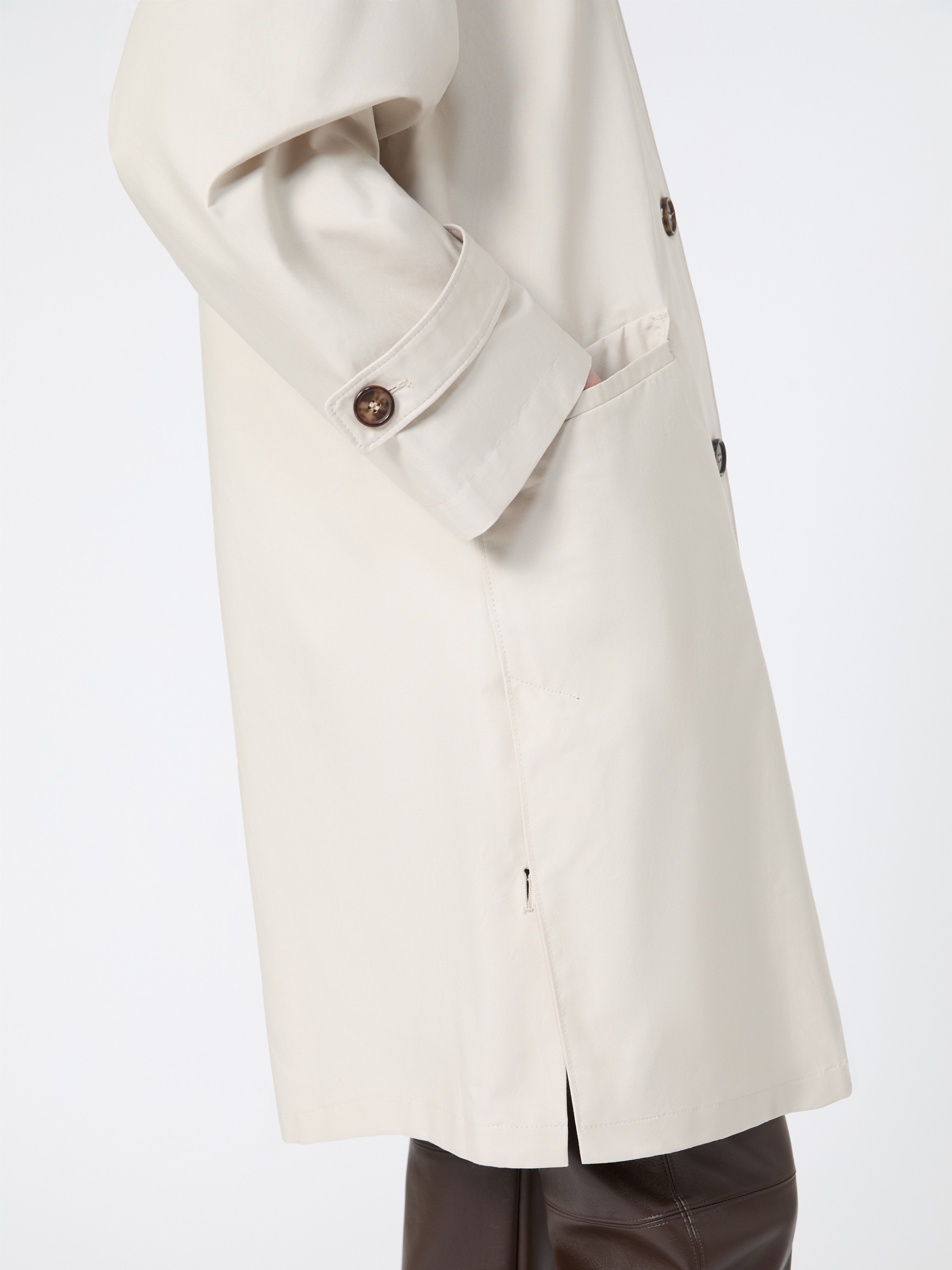 中长款单排扣风衣,侧边带开衩细节。直筒版型,衬衫领,前襟带牛角扣开合,带翻盖插袋。