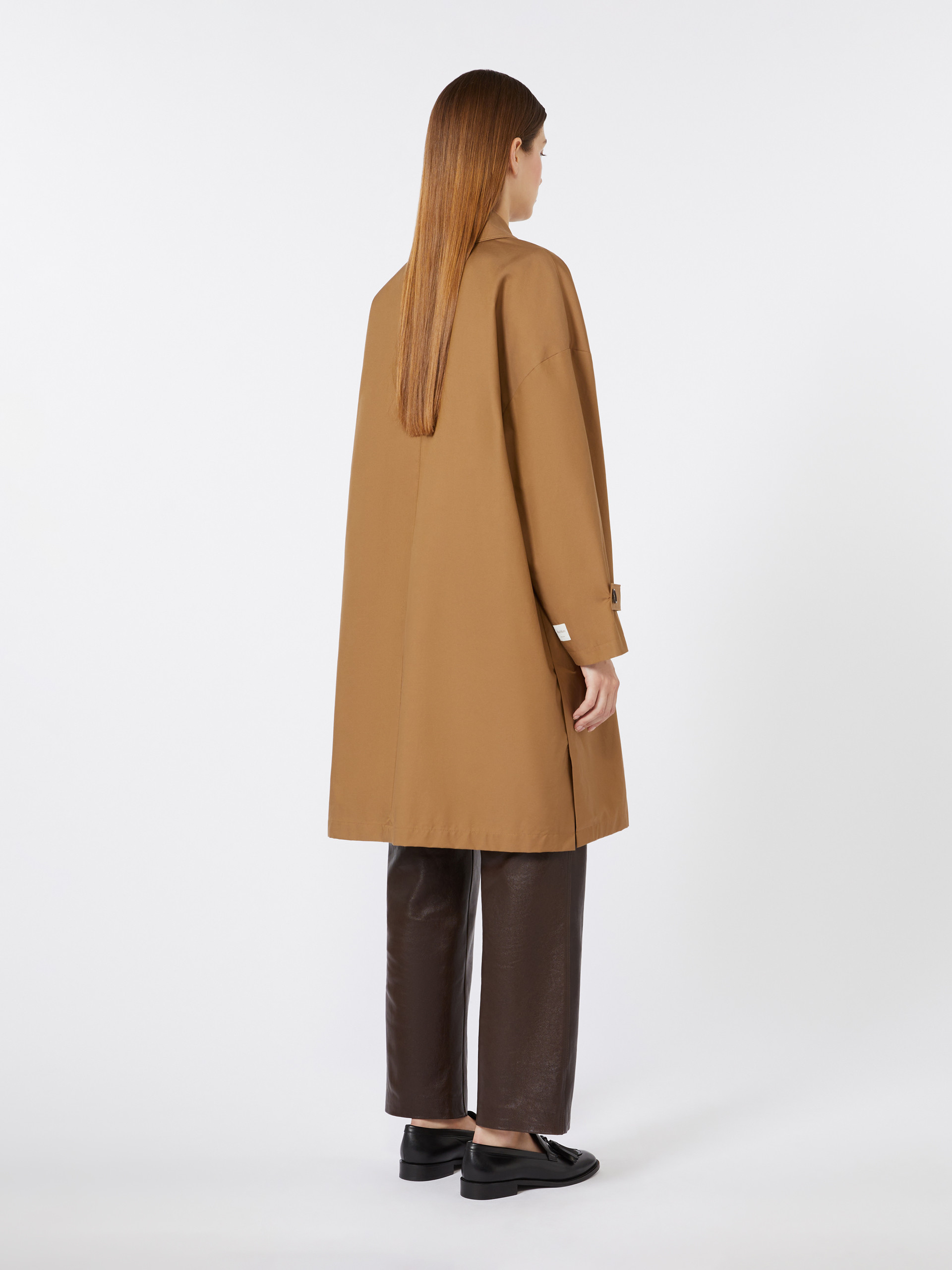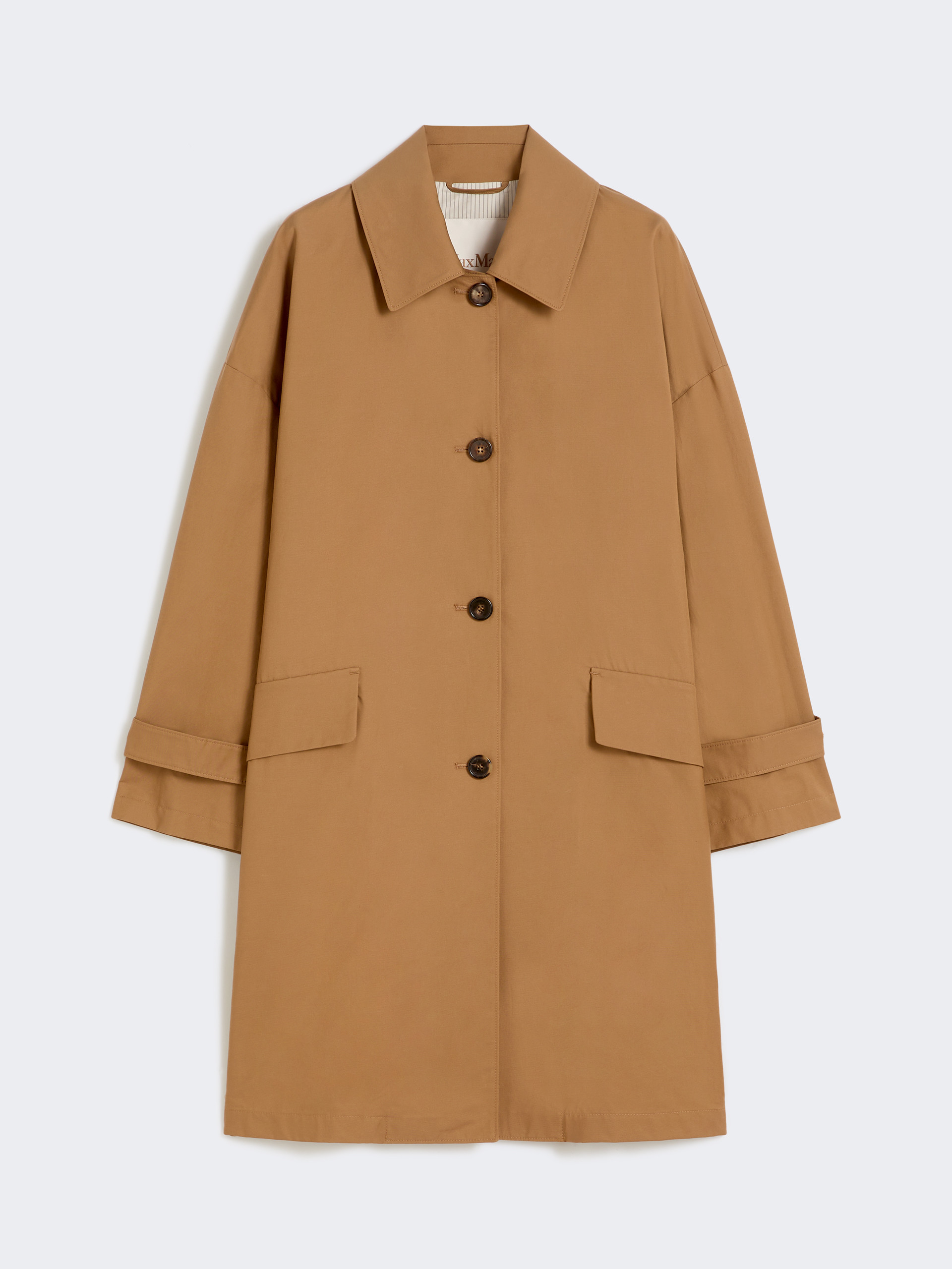 中长款单排扣风衣,侧边带开衩细节。直筒版型,衬衫领,前襟带牛角扣开合,带翻盖插袋。