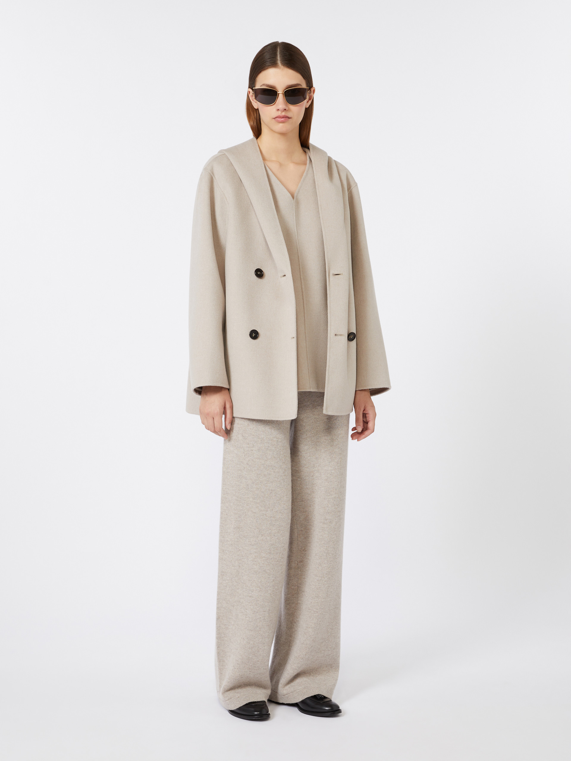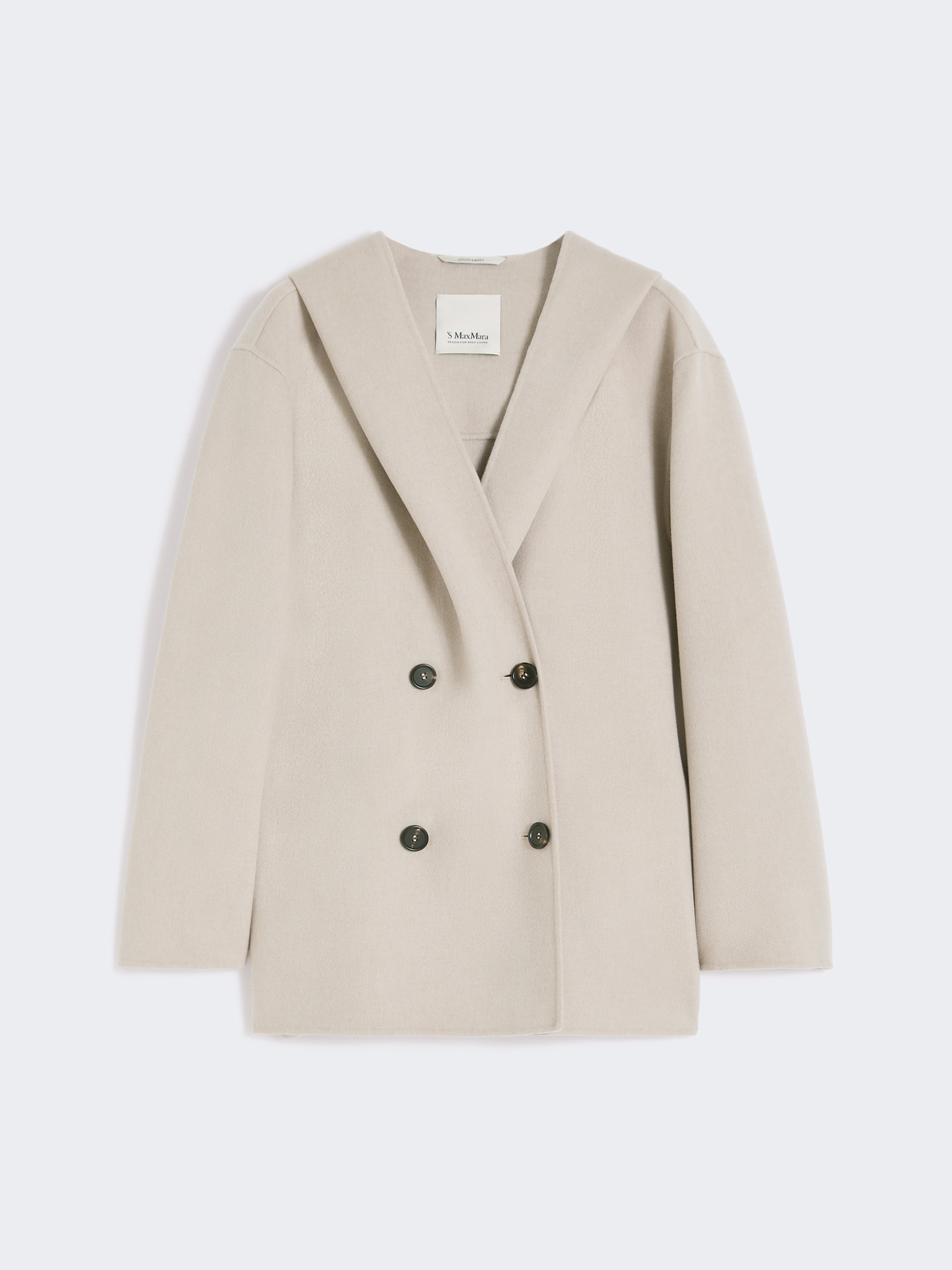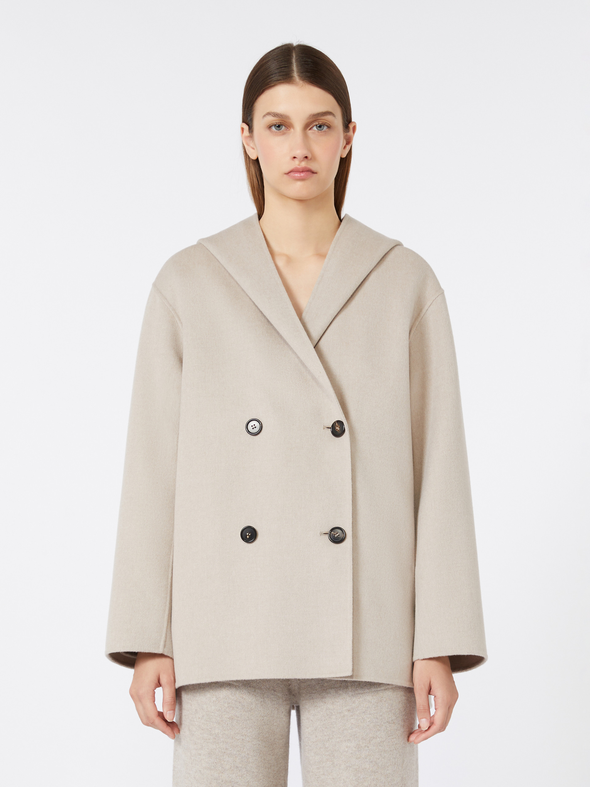 双排扣外套,配宽大兜帽,手工缝制双面绵羊毛,轮廓剪裁,装袖结构,天然牛角扣前开合,侧缝插袋,半里衬丝绸面料。
