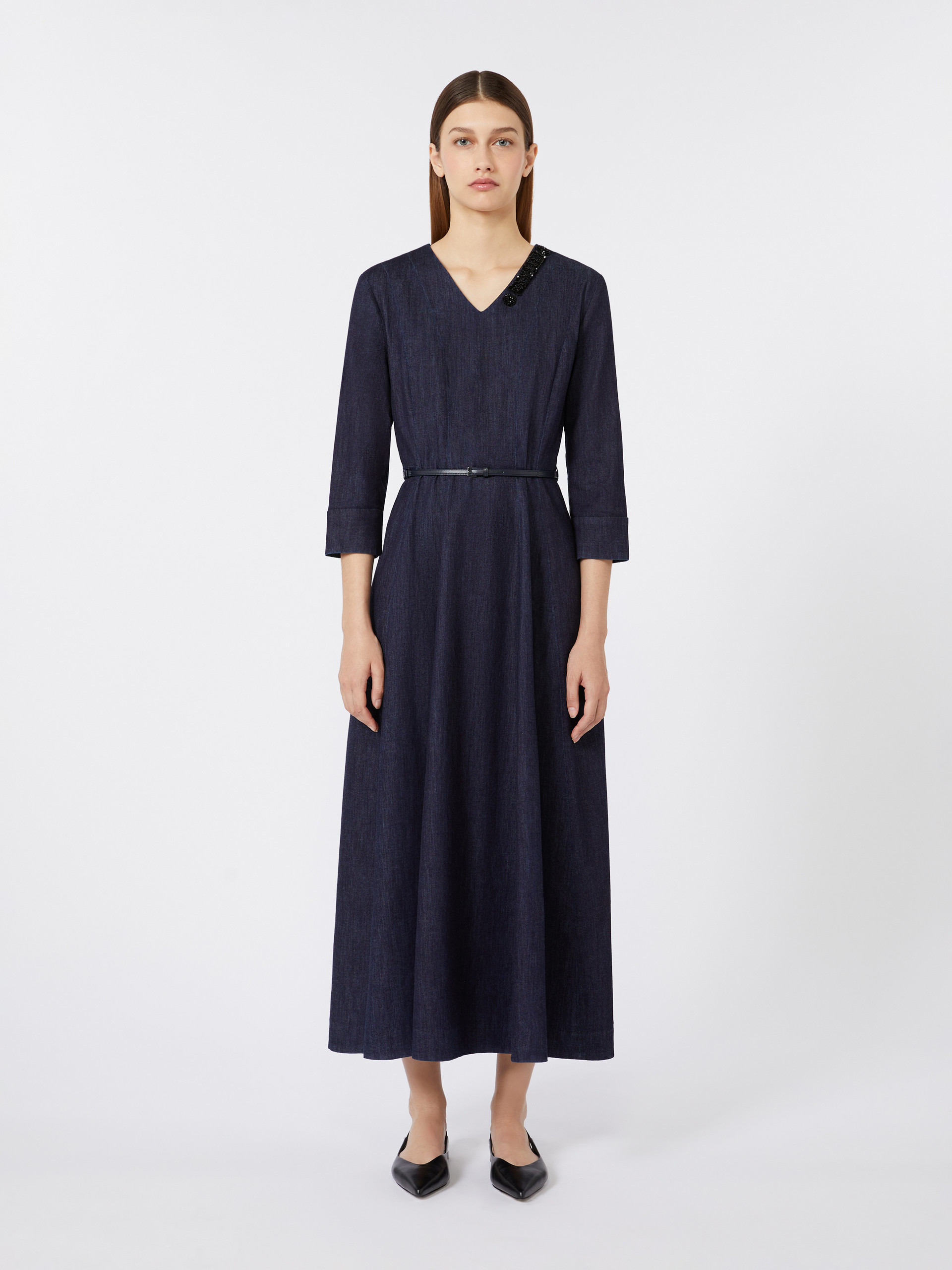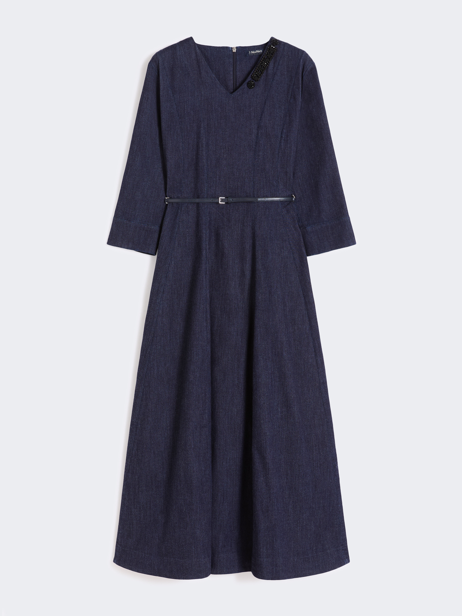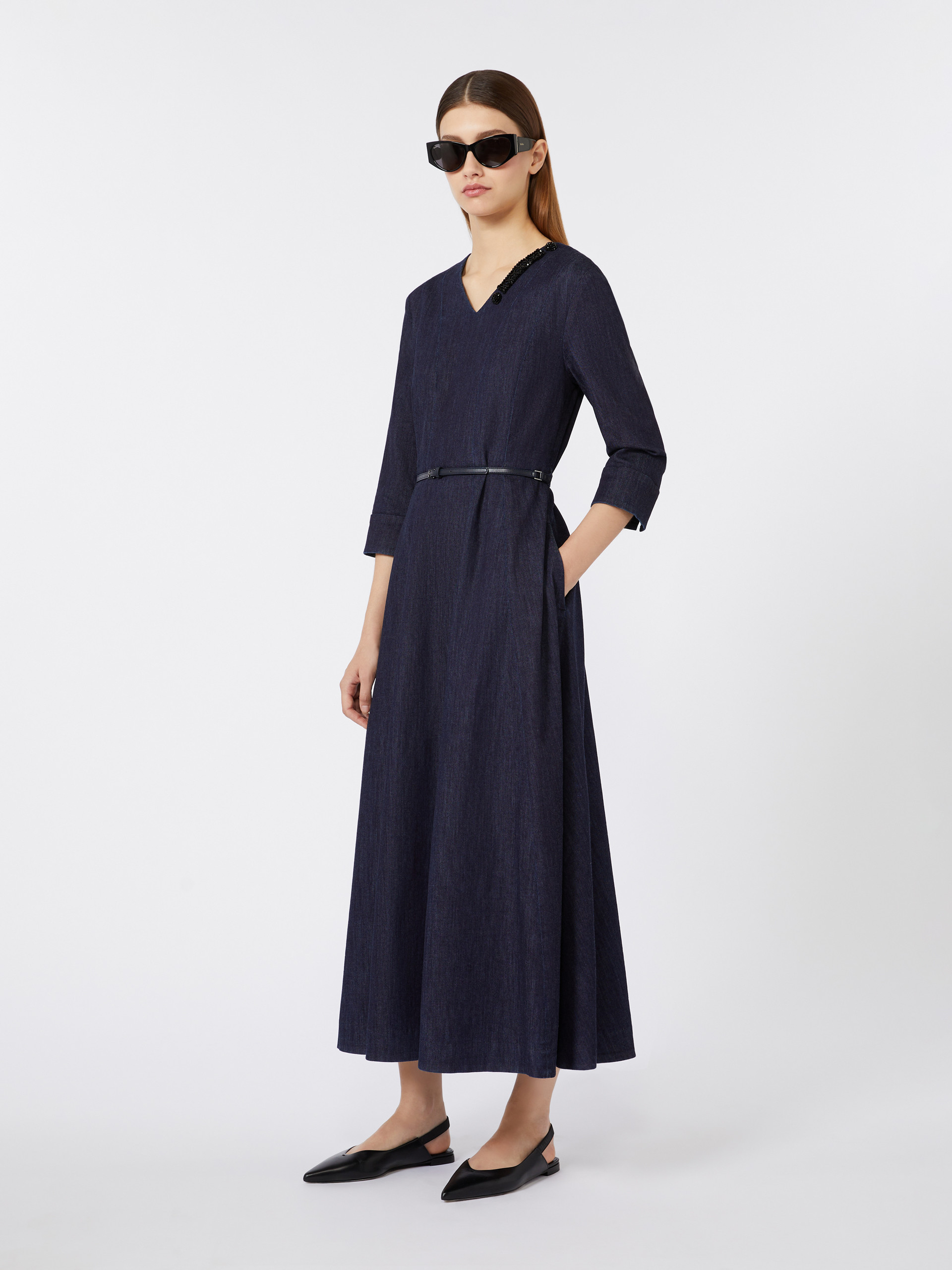 采用棉质混纺面料制成的长裙,裙摆微喇,配有腰带。V领设计,领边搭配可拆卸镶珠装饰,后背隐藏式拉链开合,侧缝插袋,棉质里衬。