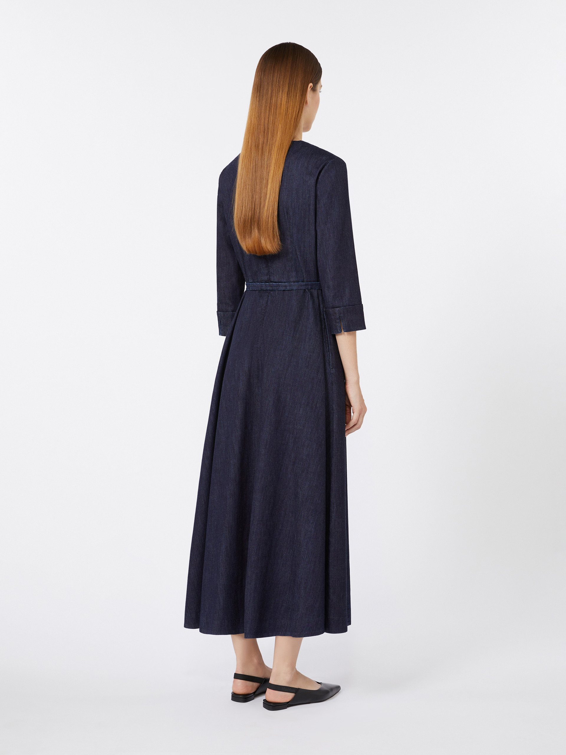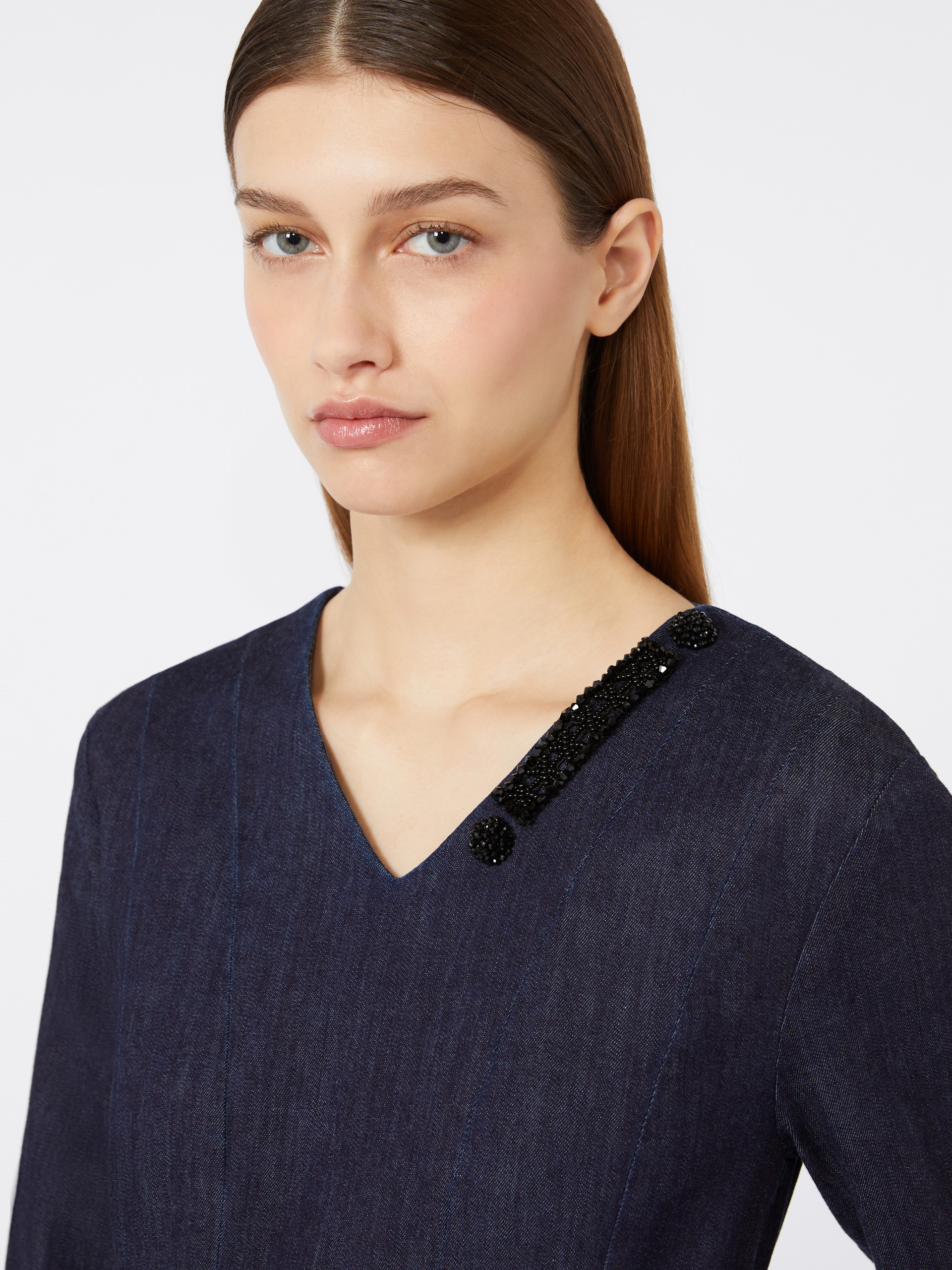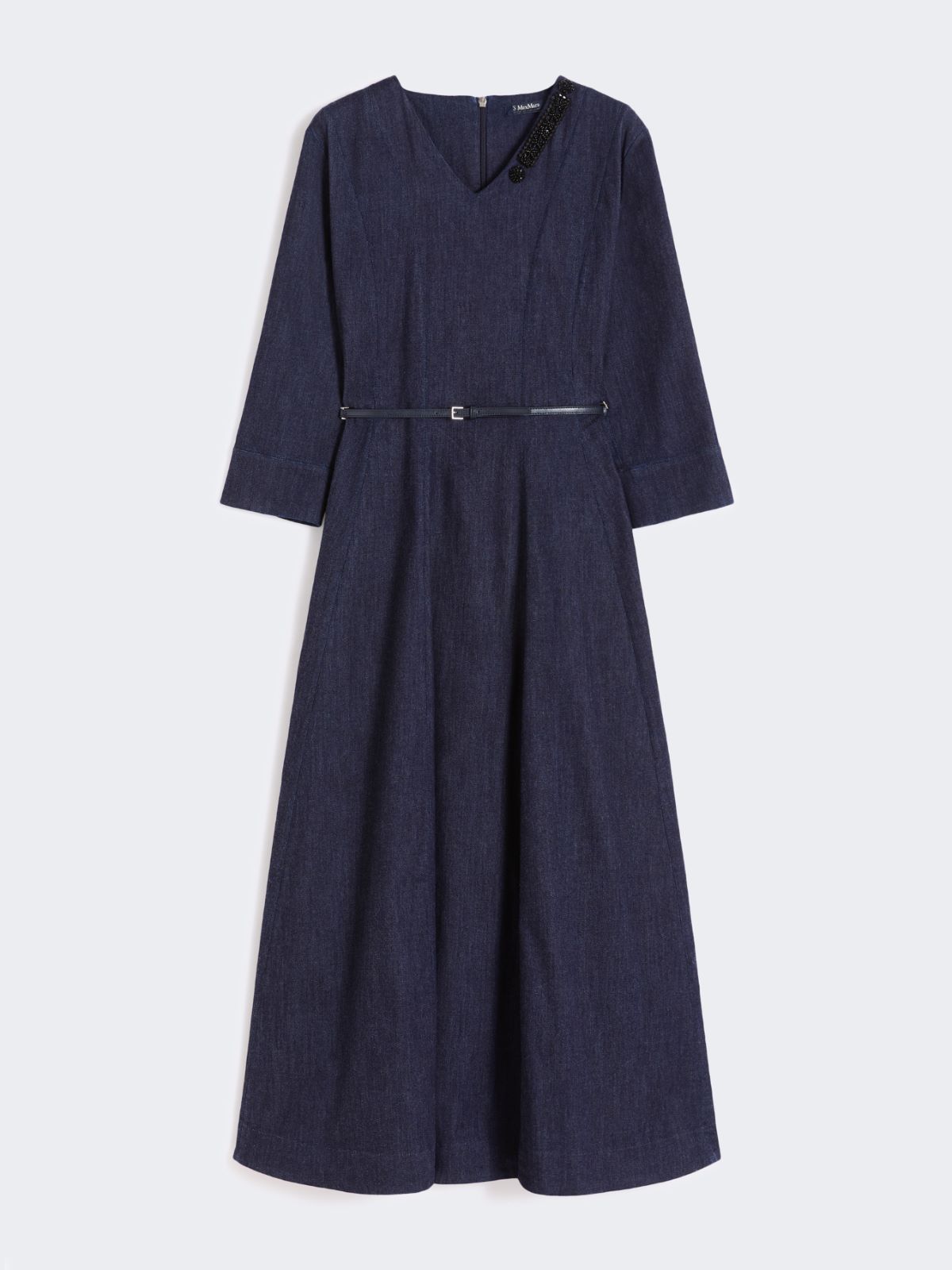 采用棉质混纺面料制成的长裙,裙摆微喇,配有腰带。V领设计,领边搭配可拆卸镶珠装饰,后背隐藏式拉链开合,侧缝插袋,棉质里衬。