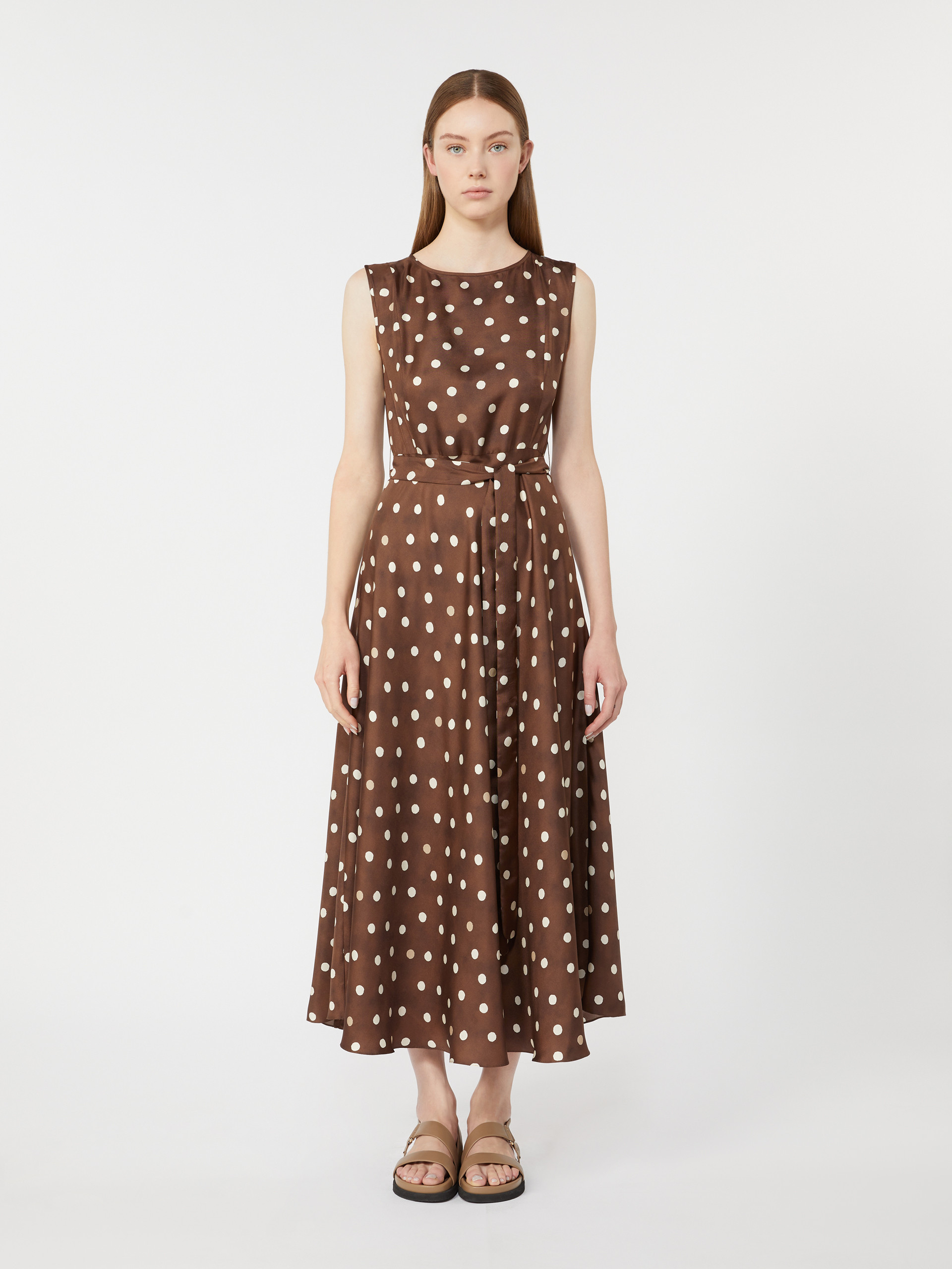 采用收腰设计的无袖长款连衣裙,裙身微展。收腰微喇剪裁,后侧隐藏式拉链开合,配有同面料腰带,无内衬款式。