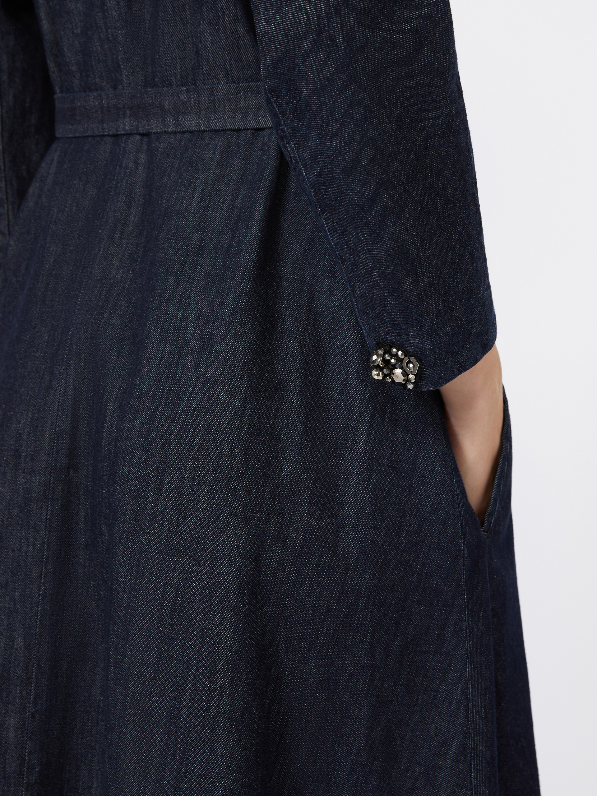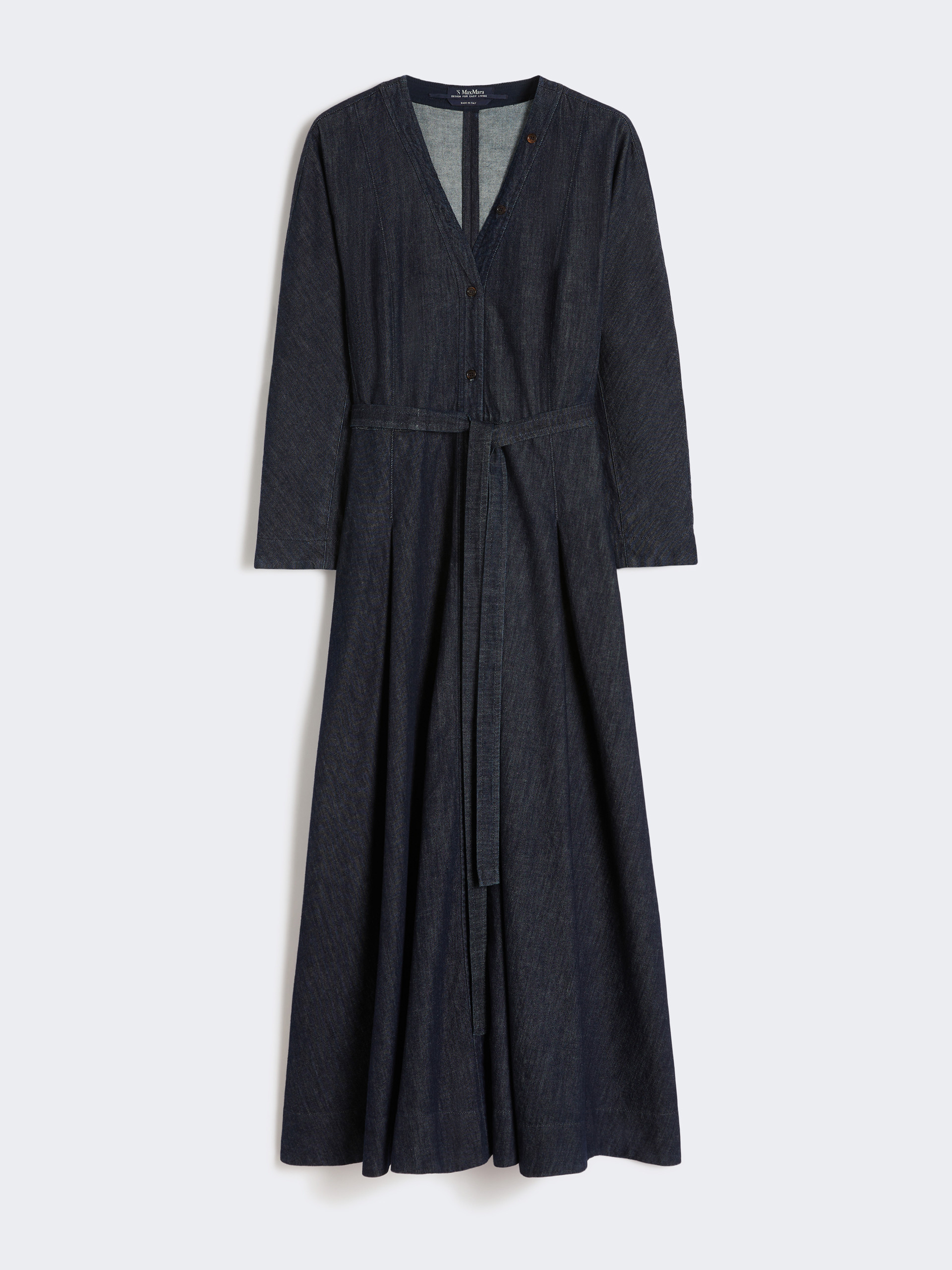 V领长裙,配有同色系腰带,尽显腰身。喇叭型剪裁,腰部收省,前襟饰有明扣,侧缝插袋,无内衬款式。