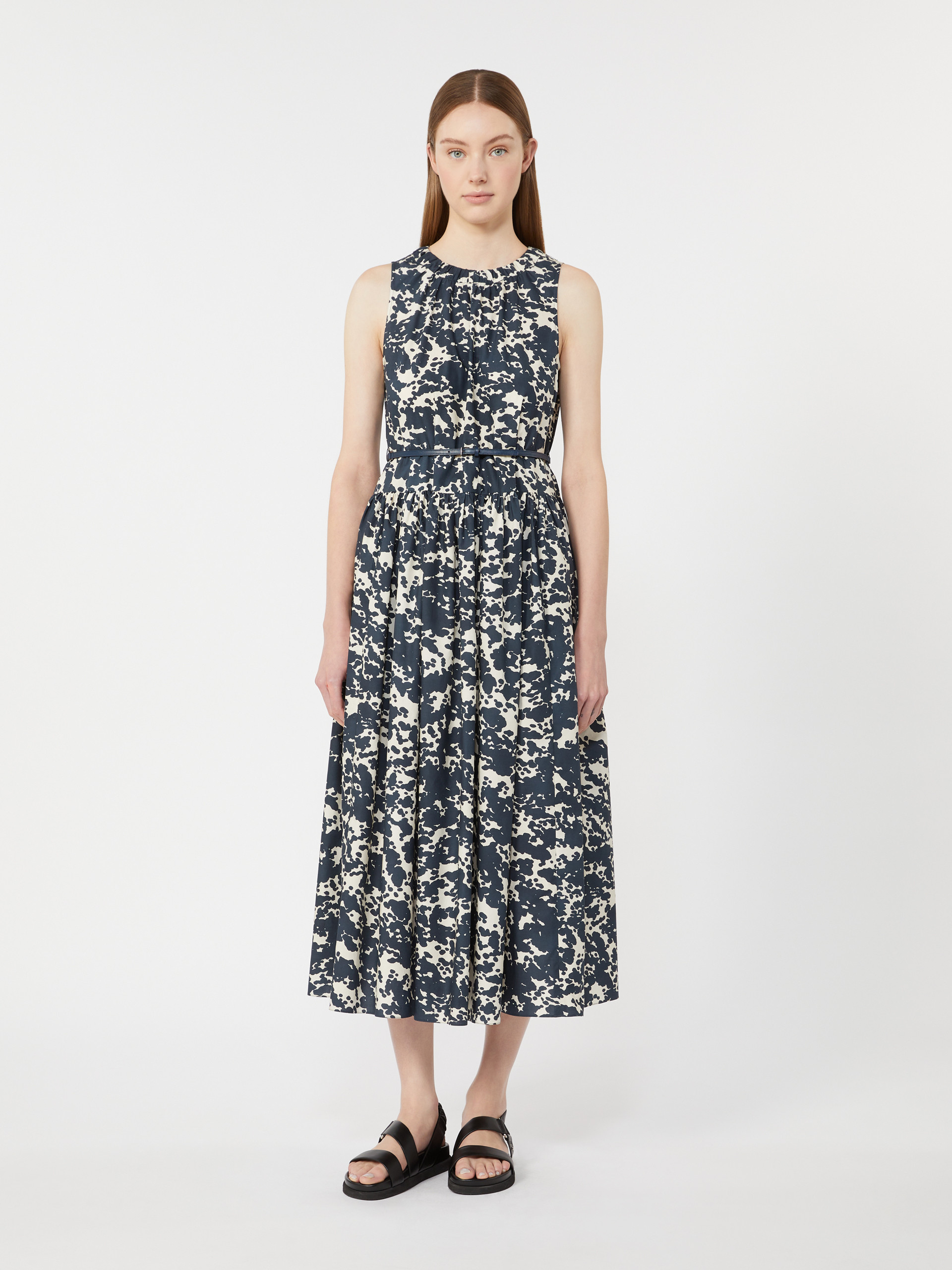 Sleeveless midi dress featuring a seam below the waistline and a full skirt. - Pure cotton dress with all-over printed motif - Flared line - Gathered crew neck - Zip fastening on the back - Inset pockets on the sides - Matching belt with buckle and leather details - Unlined