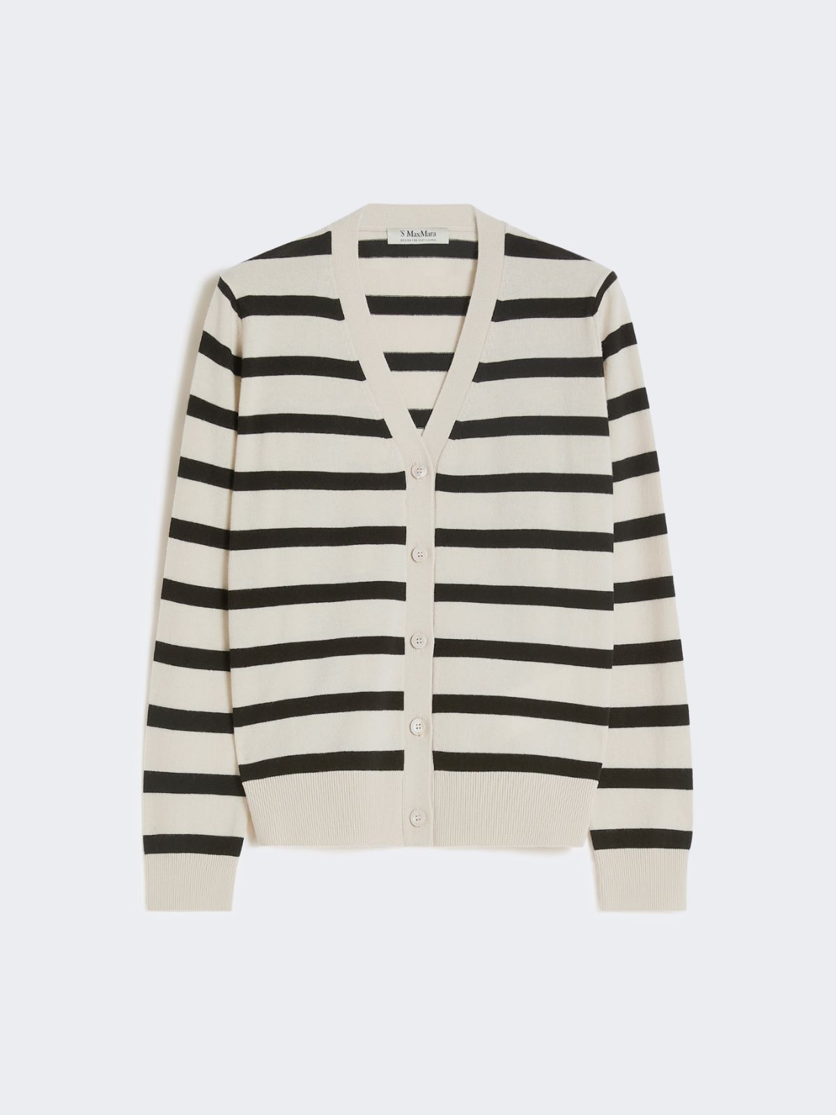 采用绵羊毛面料制成的开衫,质地蓬松,手感舒适。V形领口,长正肩袖设计,前襟明扣开合,罗纹针织袖口与下摆。