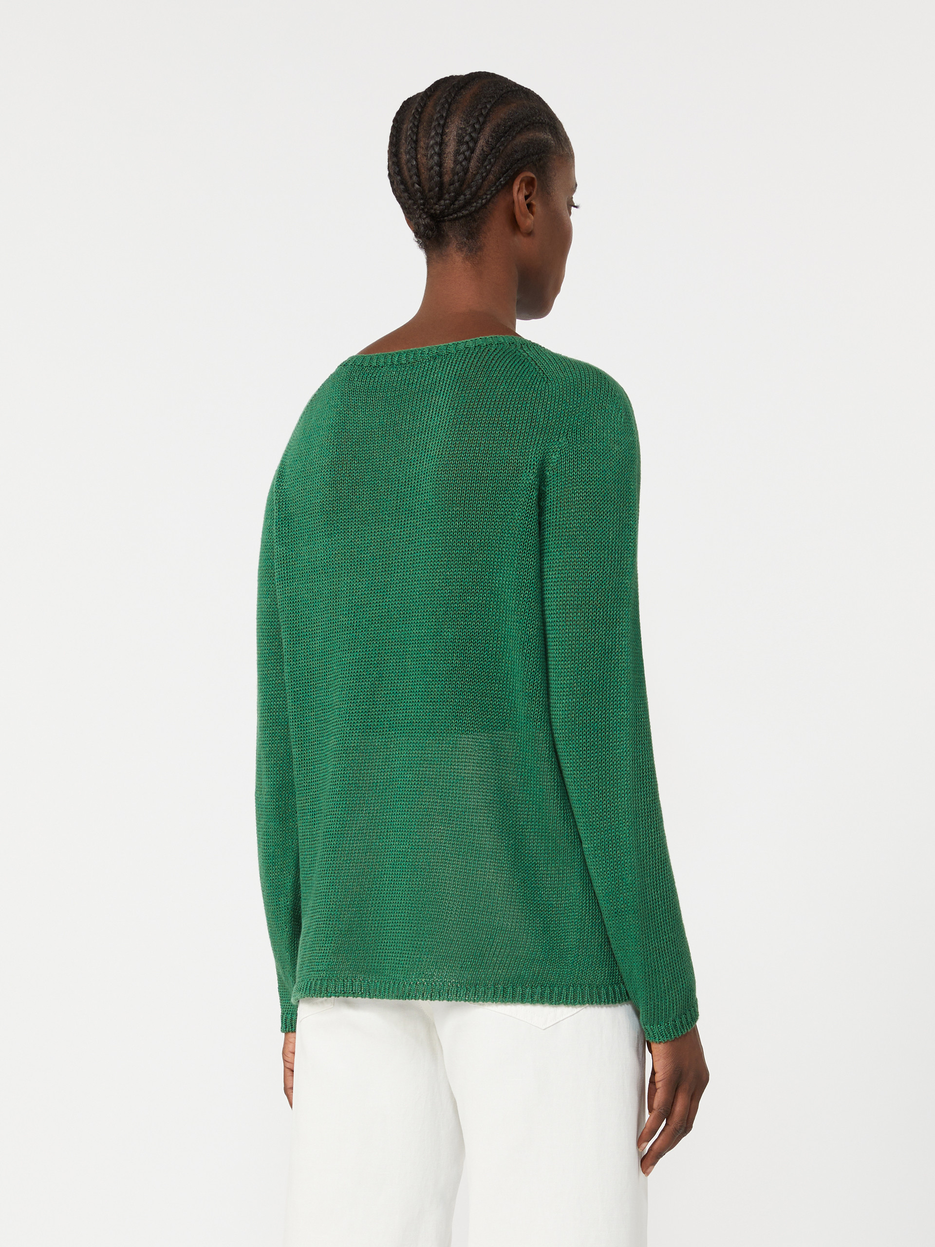 采用亚麻面料制成的基础款毛衣,直筒剪裁。宽松圆领设计,长款和服袖,平直下摆。