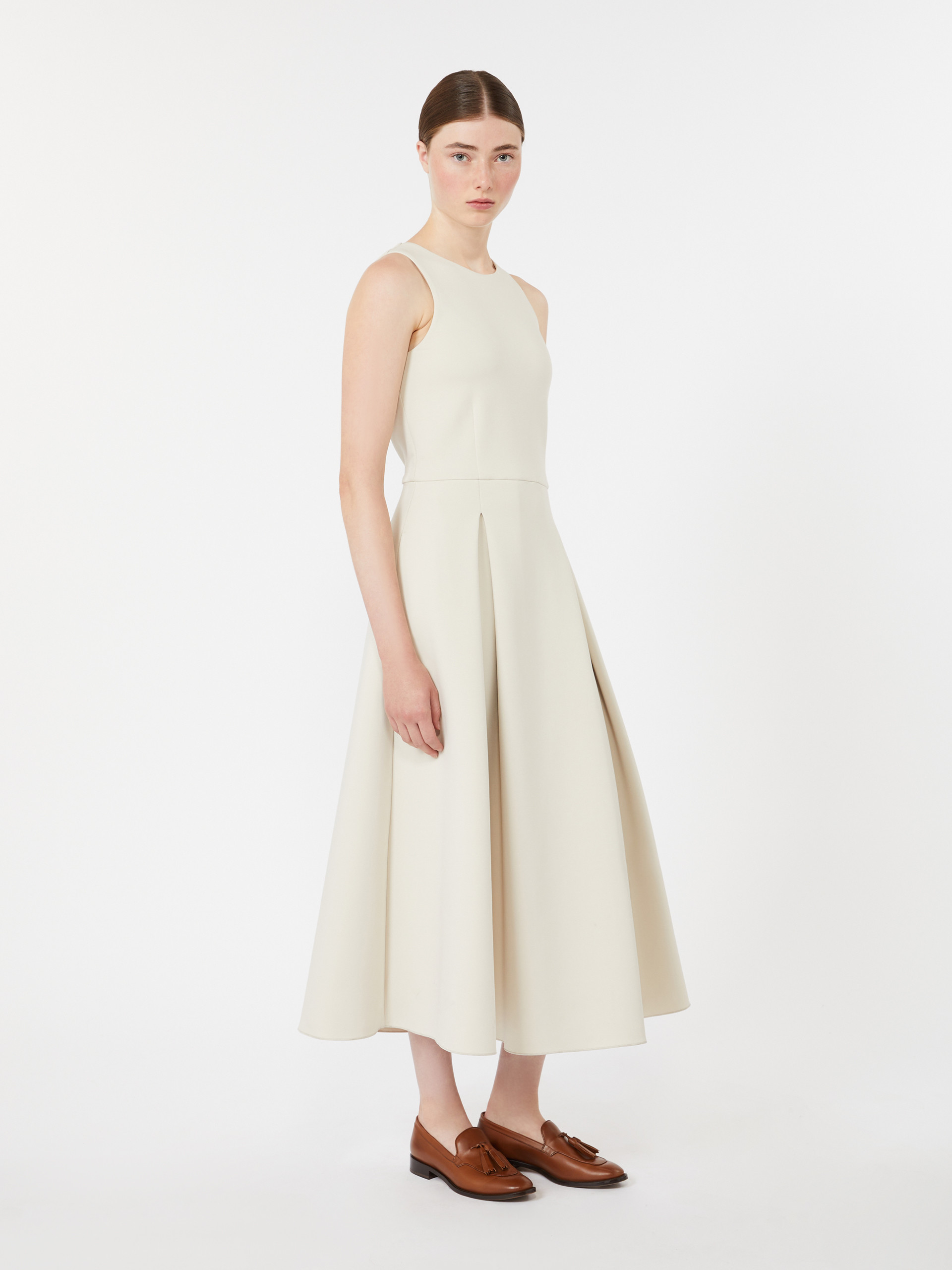 无袖长款连衣裙,采用喇叭剪裁设计。上身修身,搭配喇叭型裙摆,圆领设计,后背隐藏式拉链开合,侧缝插袋,含内衬款式。