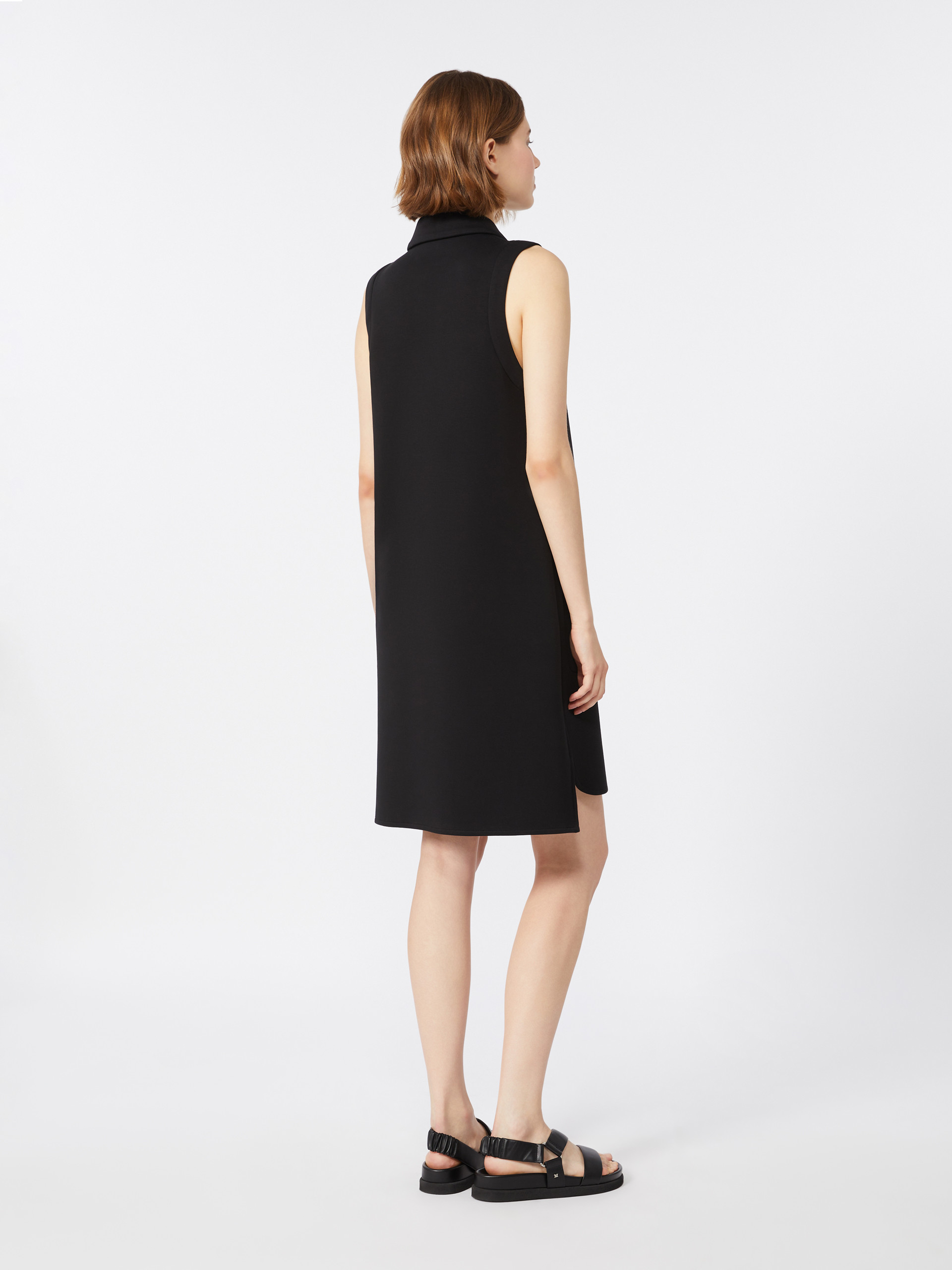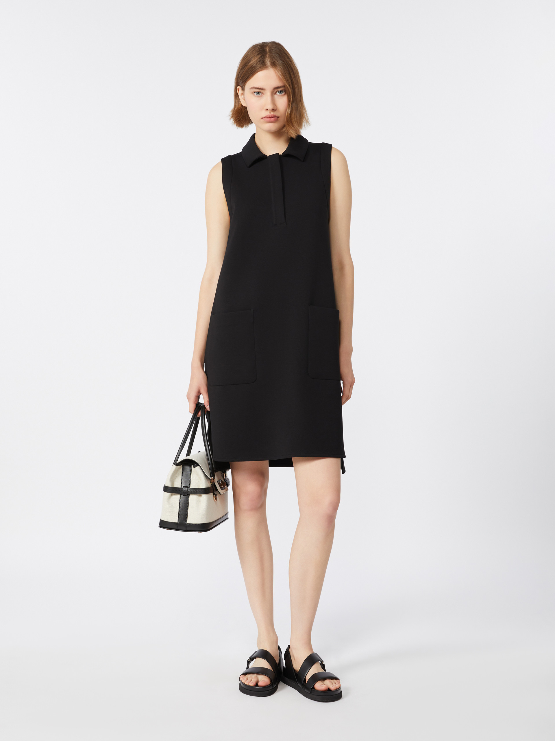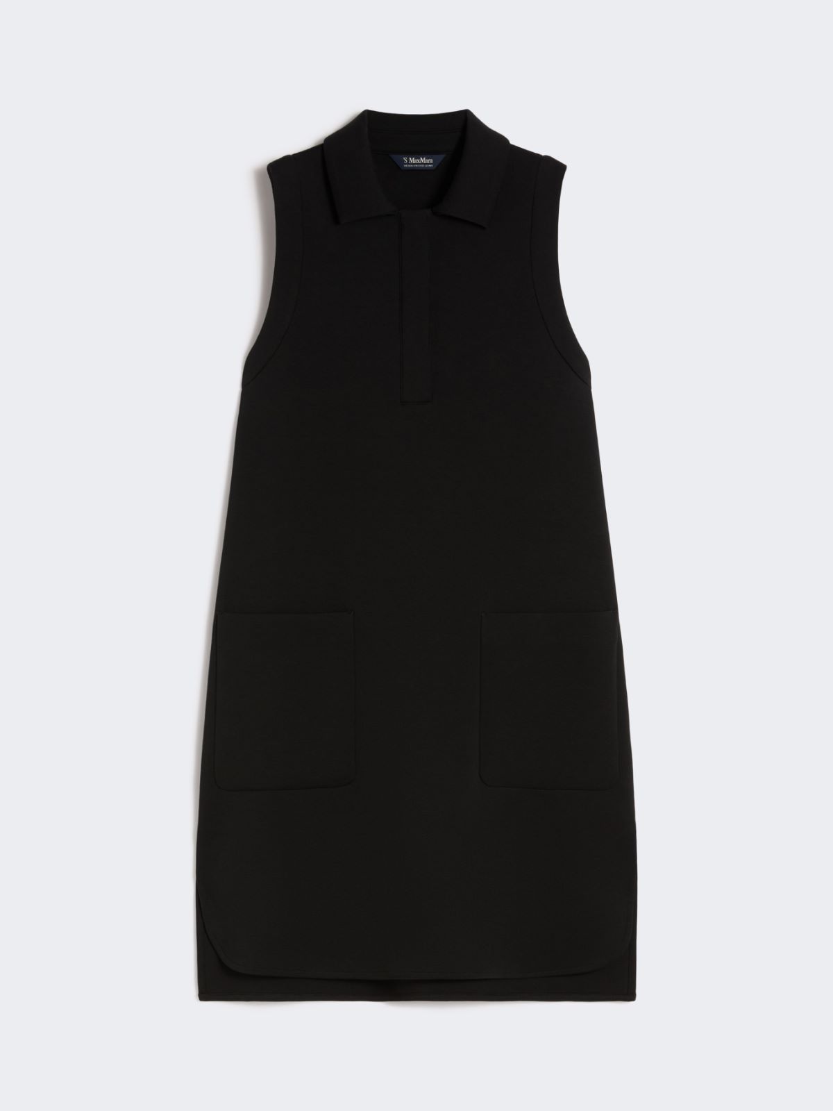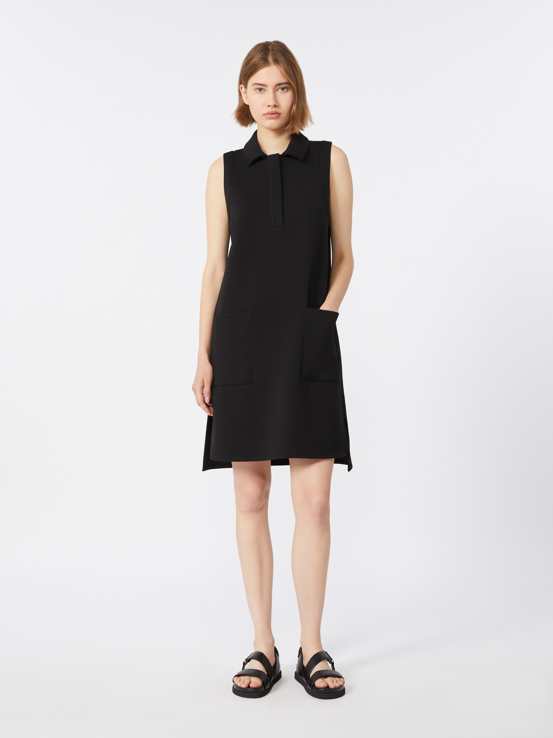 Short sleeveless polo-style dress with classic collar fastened with concealed buttons. - Dress in cotton-blend scuba jersey fabric - Straight fit - Four large patch pockets on the front - Rounded side slits on the front and squared-off ones at the back - Subtle high-low asymmetrical hem design - Unlined model