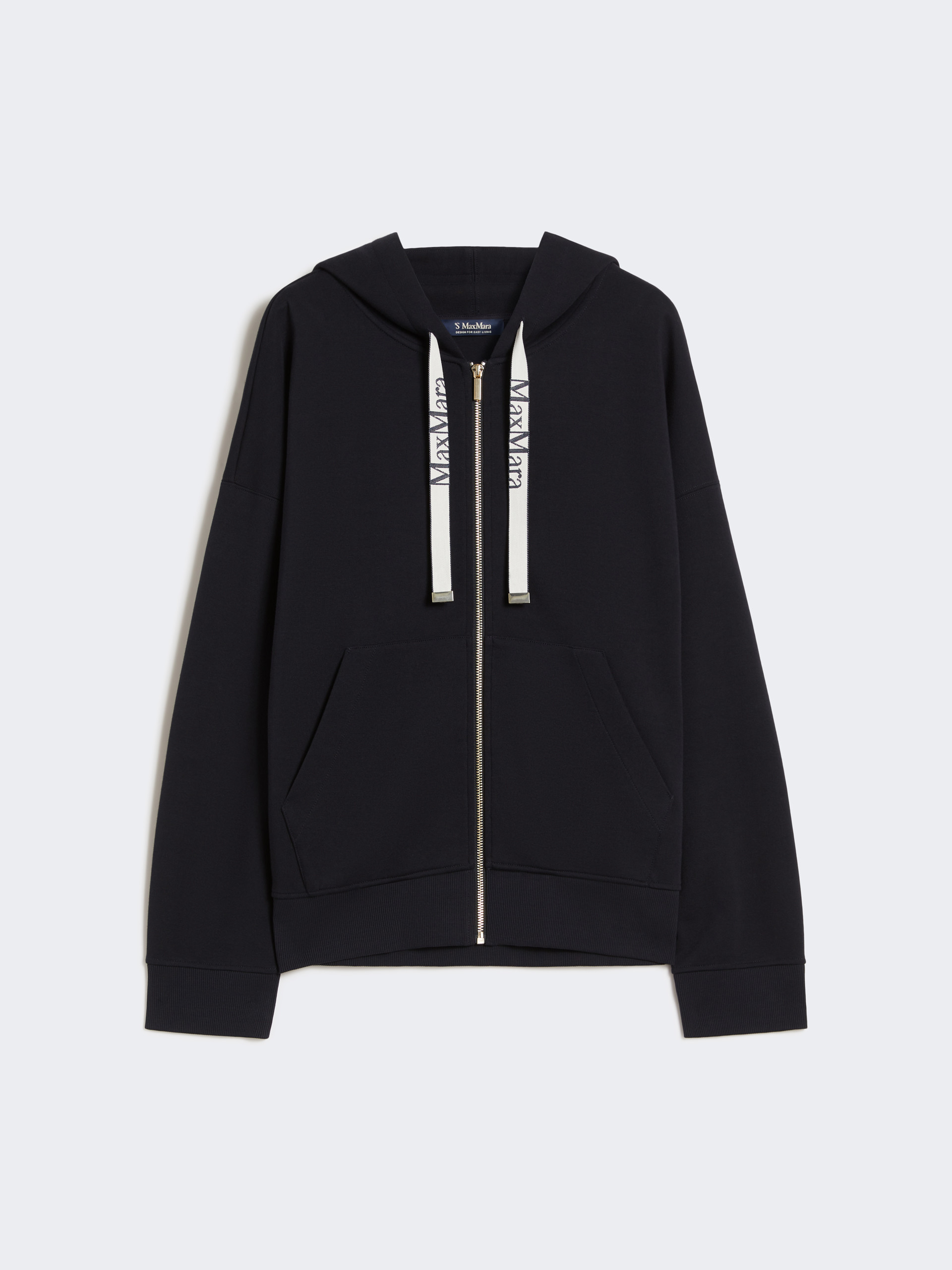 带抽绳设计的连帽卫衣。宽松版型,长款低肩袖,前襟拉链闭合。